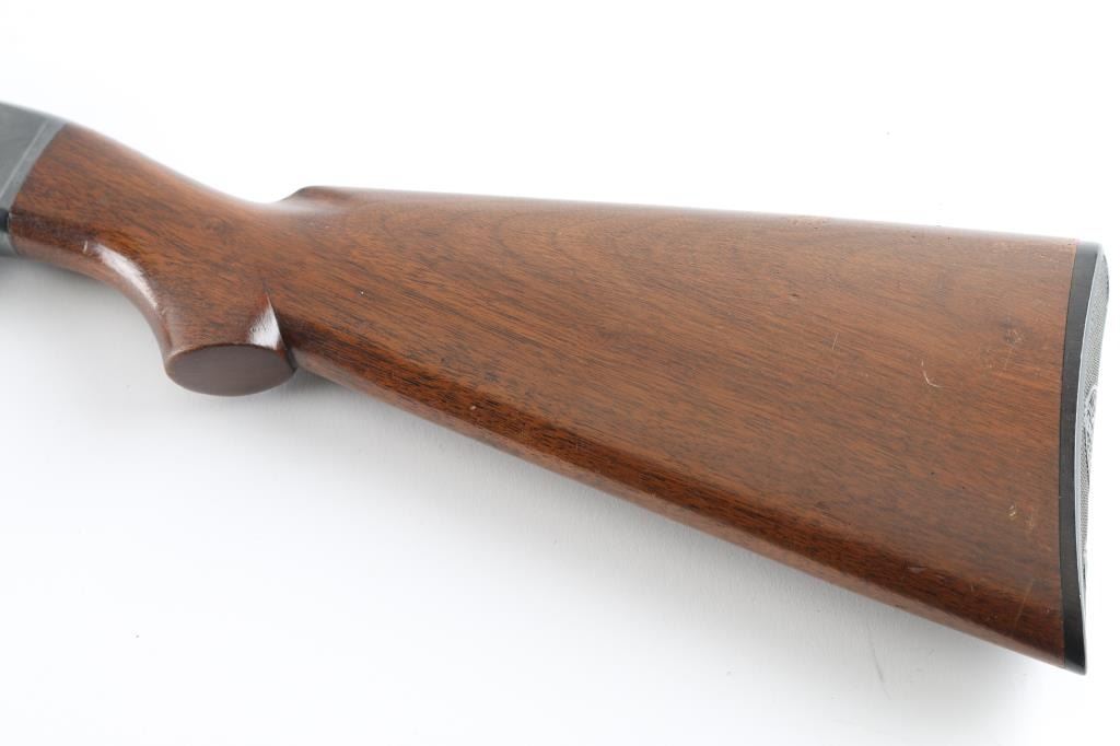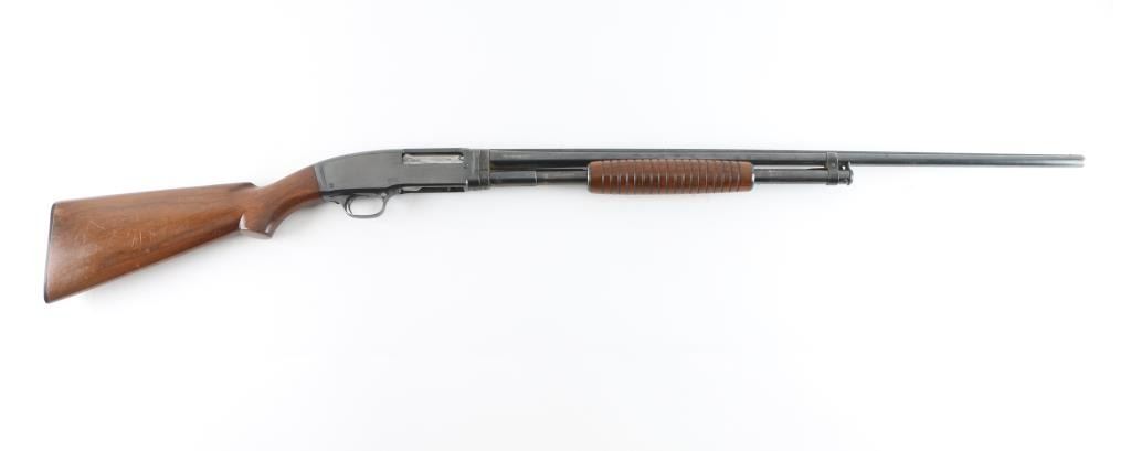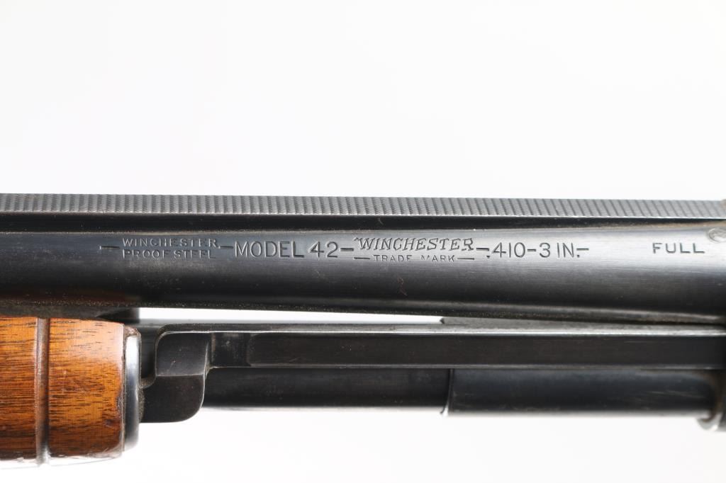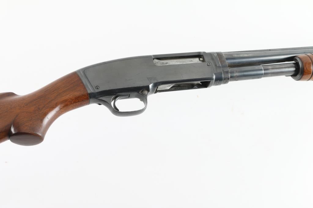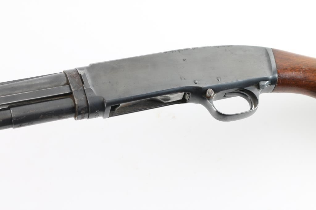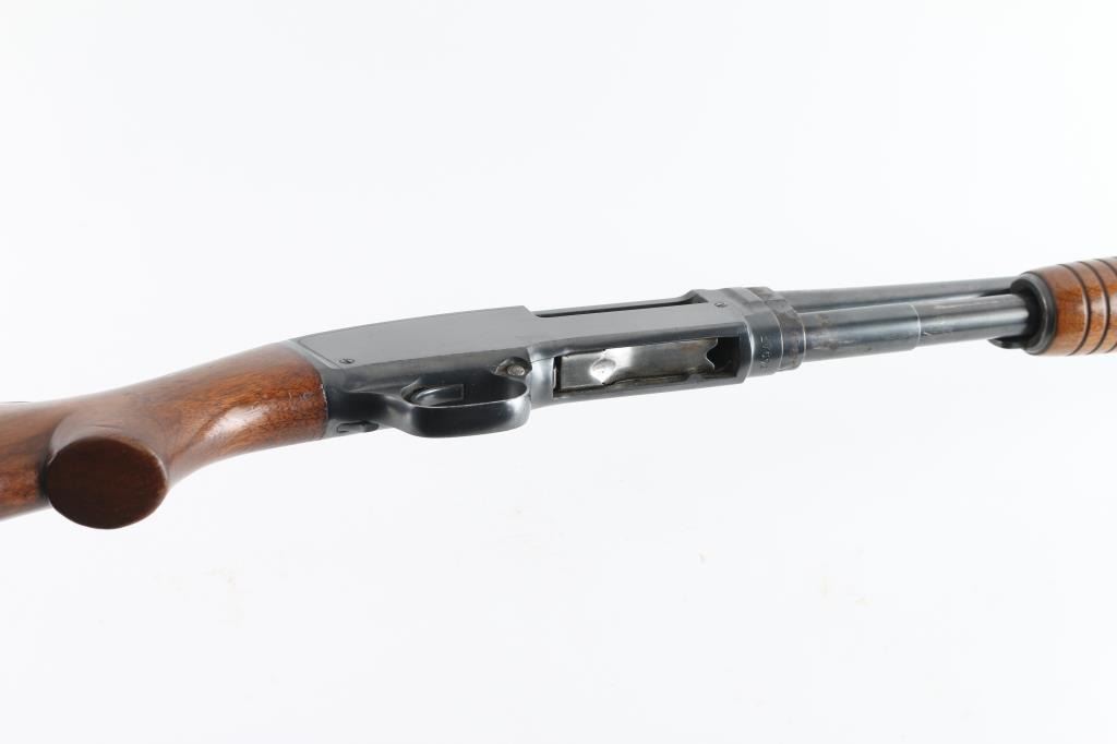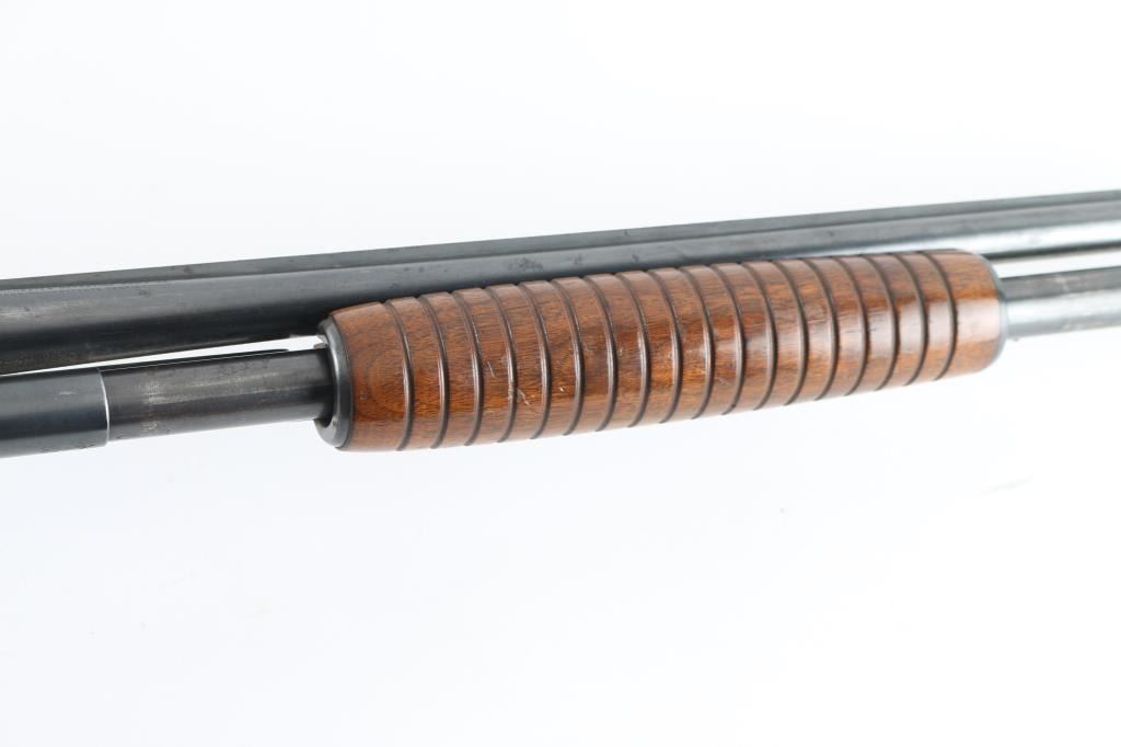 Takedown pump action shotgun chambered for .410 shotshells circa 1934. It has a 28" solid rib blued barrel and receiver, "silver" bead front sight, smooth trigger and half length magazine tube. It has a "corn cob" pump handle and smooth shoulder stock with black Winchester butt plate. Metal finish looks good but has lost some blue and has some surface rust on the barrel. (rough at the muzzle) Lots of surface rust where barrel meets receiver. Wood looks good with signs of use and handling. Safety works but sticks, it's hard to move. Trigger does not work consistently. Bore needs cleaned, has a lot of rust at the chamber and a few dark spots in the bore, might clean up, might be tiny pits. LOP is 14". Choke reads FULL on barrel. Condition is NRA Good *C&R Firearm*