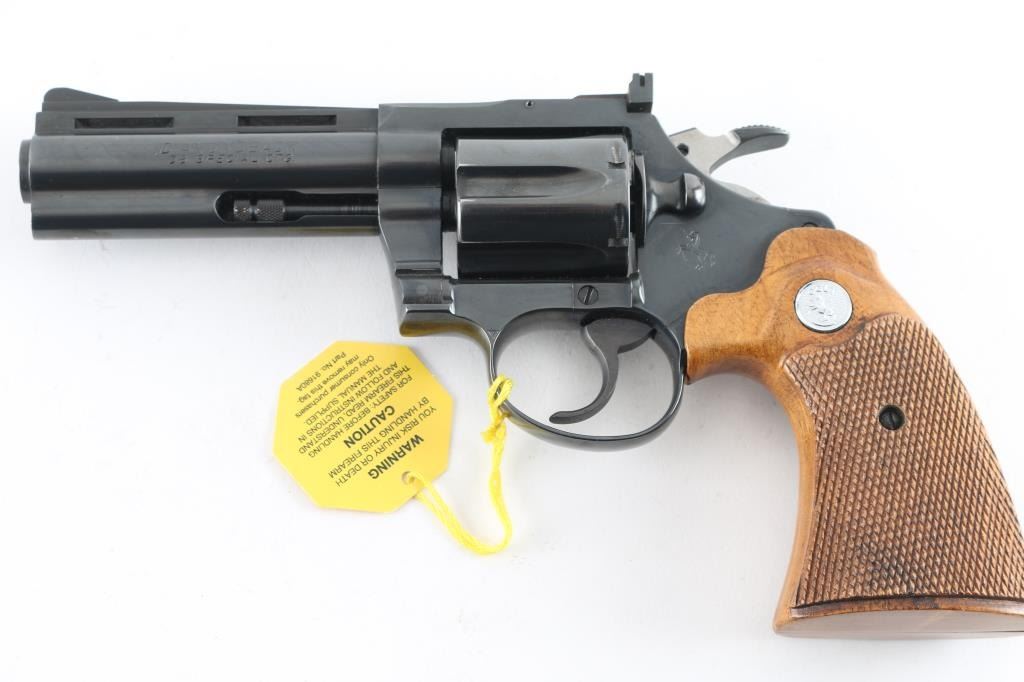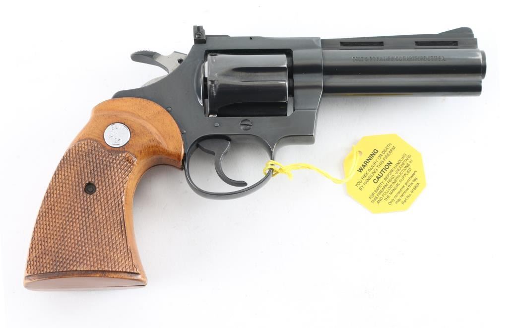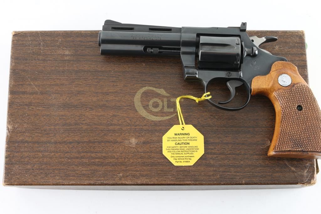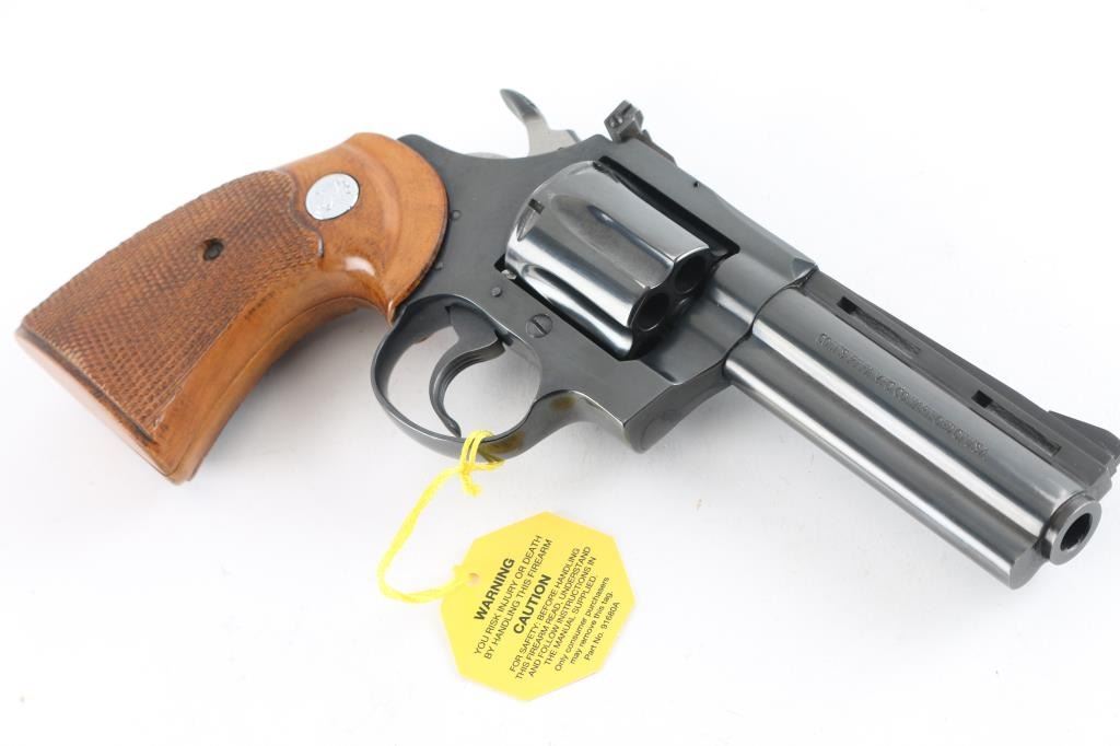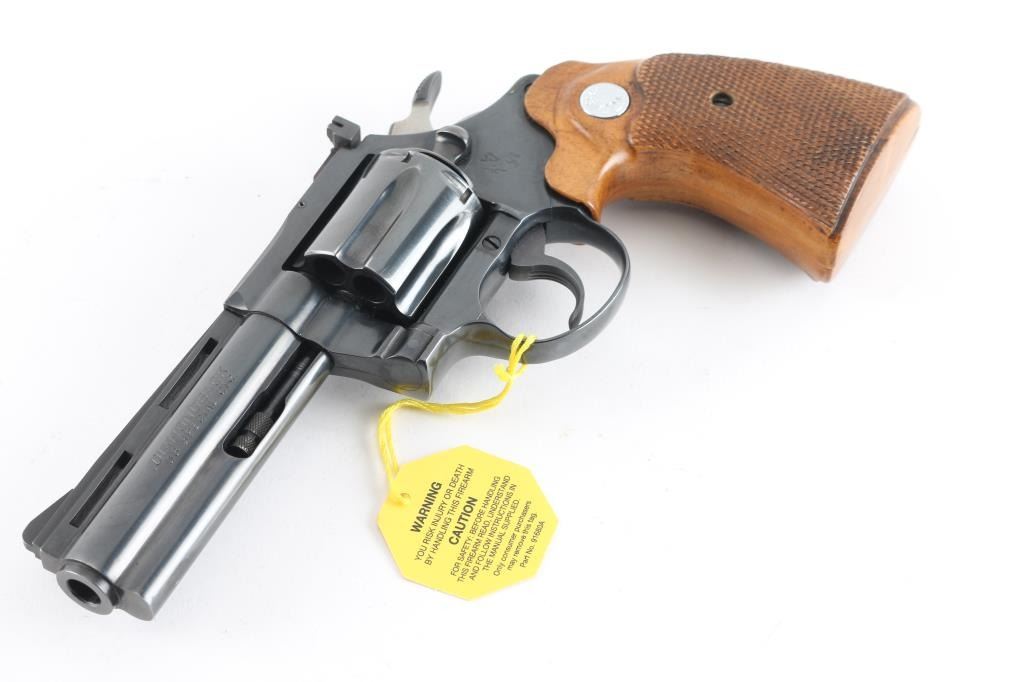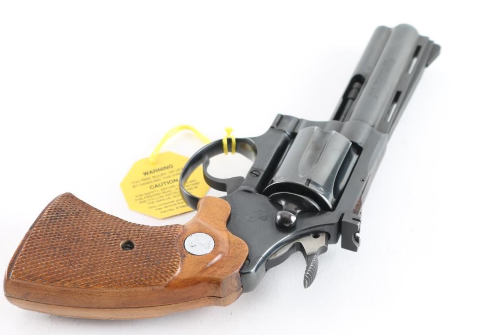 High quality double action 38 Special revolver manufactured circa 1967. Features blued finish, checkered wood grips with silver Colt medallions, 4" barrel with full length underlug and vent rib, adjustable sights, fluted 6 shot cylinder. Bore and charge holes are excellent. Retains 95% blue with edge losses, thinning on top strap. Grips are near excellent condition - top edge behind frame on both panels have slight finish loss - may have been slightly reshaped or otherwise cleaned up. Includes Colt 2 piece wood grain cardboard box with paperwork. Condition is near NRA Excellent *** C&R Firearm ***