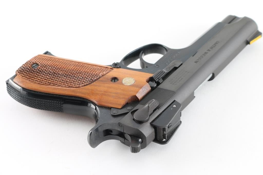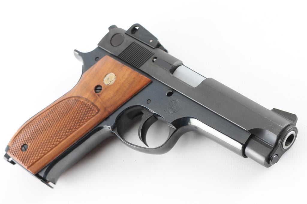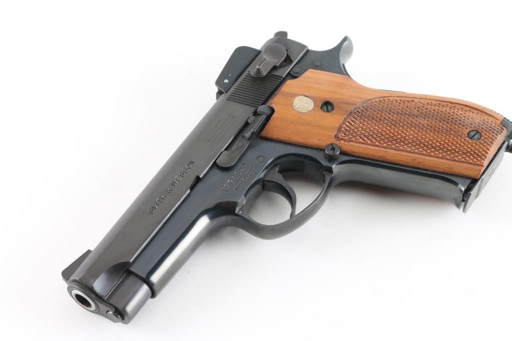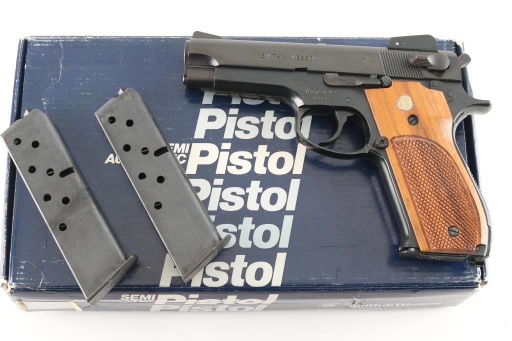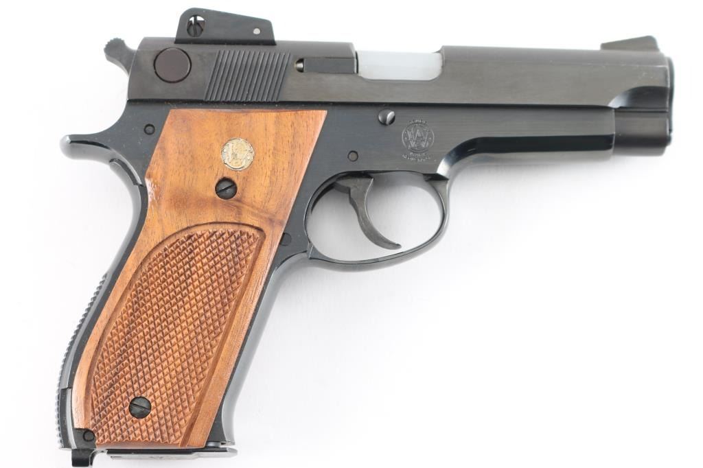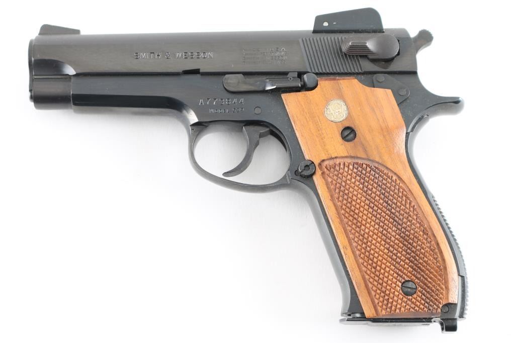 American made double action semi-automatic pistol chambered in 9x19mm, manufactured circa 1982. Features a blued carbon steel slide & steel frame, 4" barrel, full-length steel guide rod, serrated ramp front sight, adjustable micrometer click rear sight inside protective shell, smooth trigger, serrated round hammer spur, thumb safety/decocking lever on the left side of the slide, magazine disconnect safety, push button magazine release, factory 8 round magazine, knurled alloy backstrap w/ lanyard loop and two-piece checkered walnut grips with S&W medallions. Bore is excellent. Retains 98% finish with minor handling marks. Yellow paint added to front sight. Grips are excellent. Includes the original factory blue cardboard box with documents, parchment paper, factory cleaning rod & brush in sealed bag, two spare magazines. Condition is NRA Excellent *** Modern Firearm ***