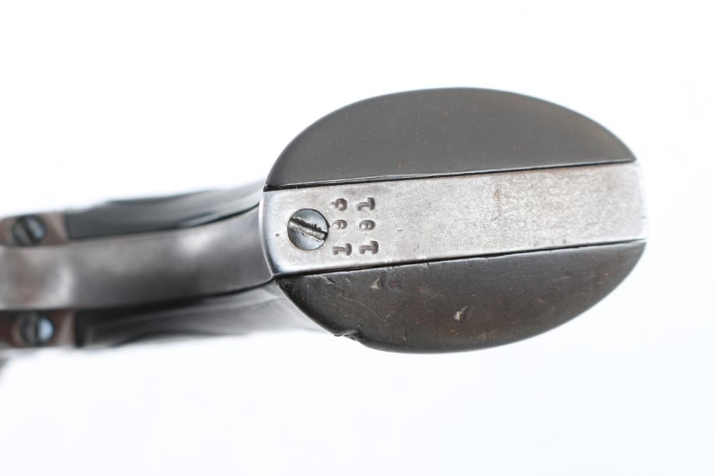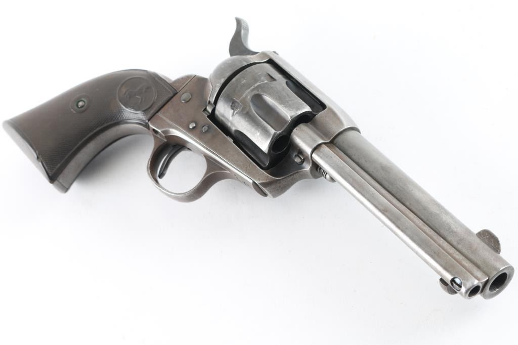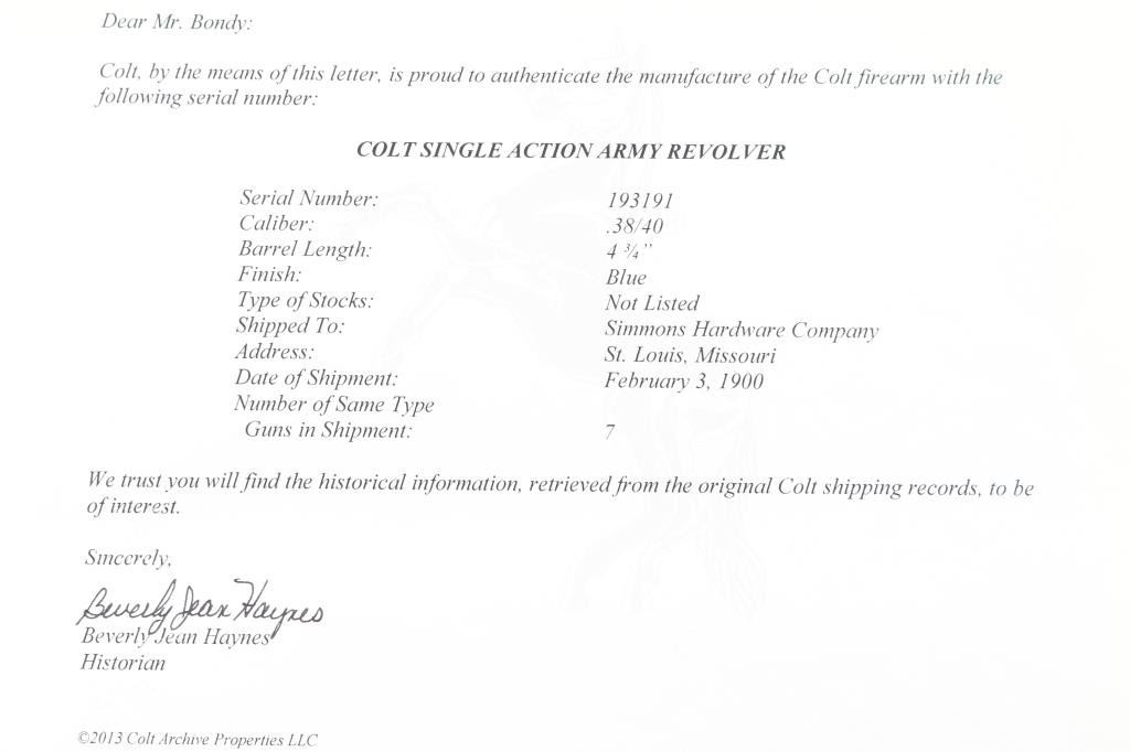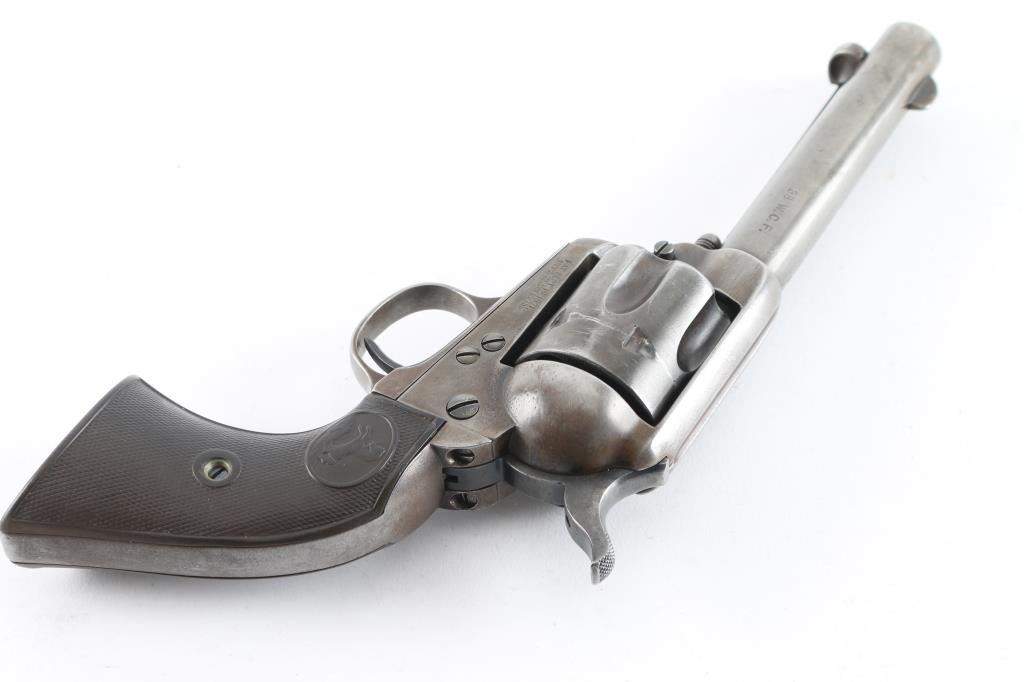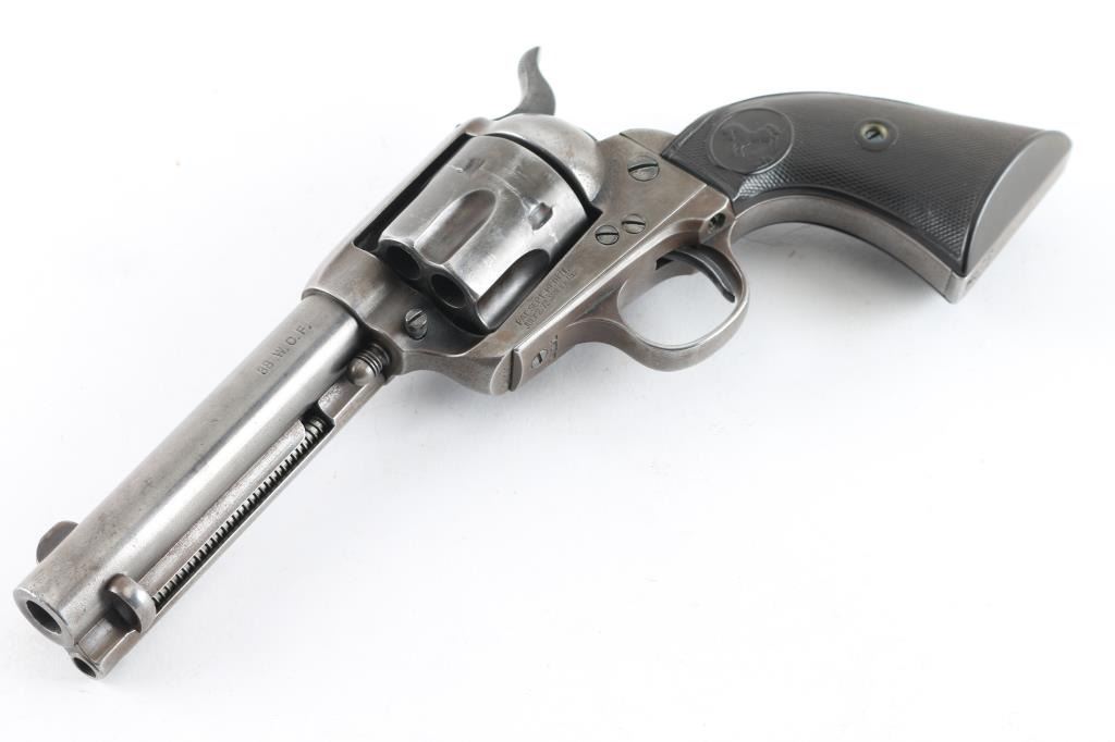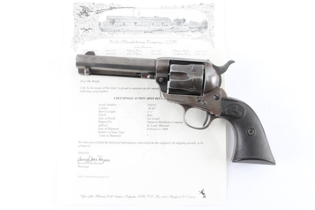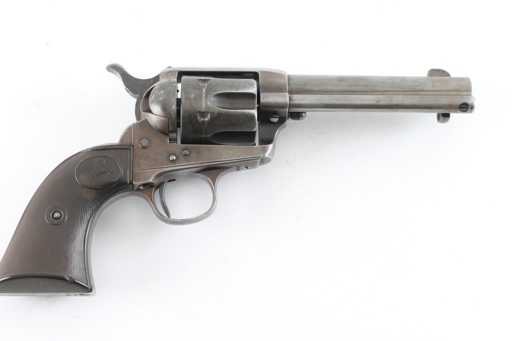 'First Generation' Vintage revolver in 38-40 Winchester caliber manufactured circa 1900, with factory letter. Features 4-3/4" barrel, fluted 6 shot cylinder, blued finish, checkered hard rubber "Rampant Colt" grips. Bore is good to very good, bright with strong rifling, scattered light pitting. Metal surfaces retain little original finish, now mostly brown color mottled with silver, smooth bare metal showing many places including grip straps. Tiny pits clustered behind recoil shield. Grips show a chocolate brown color, with smoothing of details from handling. Good bluing on trigger & hammer, possible replacement parts. Markings on frame are thinning, somewhat eroded, with traces of the Rampant Colt in circle. Two line barrel address readable, as is caliber marking. Backstrap and trigger guard numbers match frame. Action is smooth. One charge hole has poor lock-up. Factory letter states this was in a shipment of 7 to Simmons Hardware Store in St Louis MO on February 3, 1900. Letter confirms finish, barrel length & chambering. Condition is NRA Good (reworked) *** C&R Firearm ***