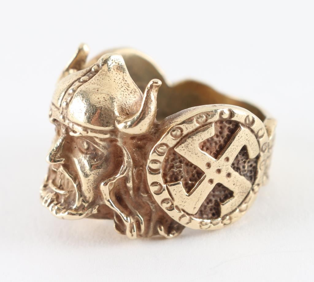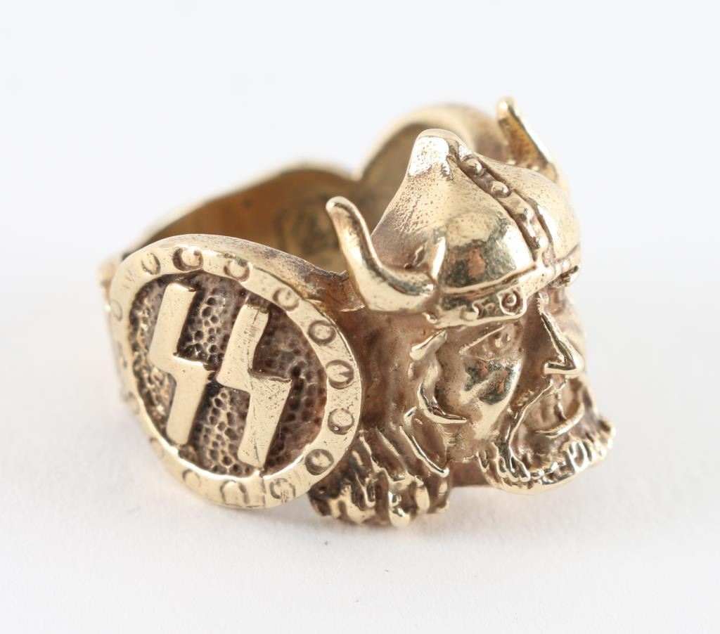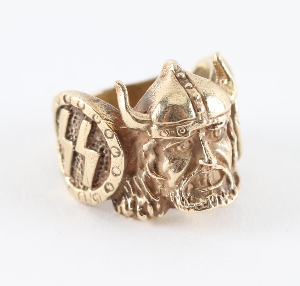 real 14kt yellow gold, appears to be a German Nazi SS Viking Division ring, SS runes on one side swastika on other, weighs 18 grams. We believe this to be a reproduction or fantasy piece, but we are not experts, use your own judgement. There is a mark on the inside.