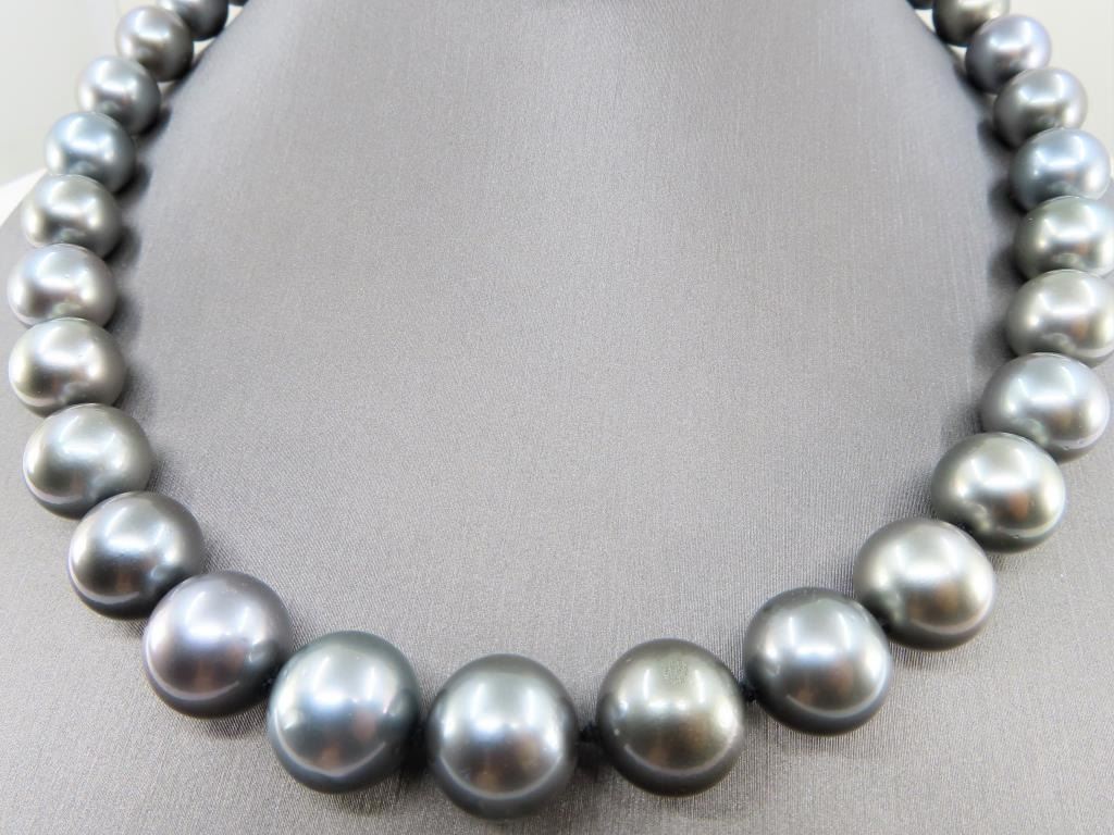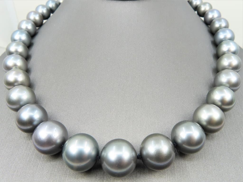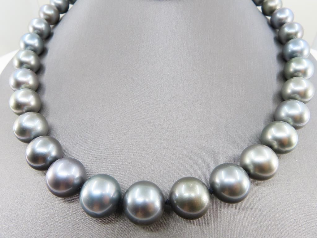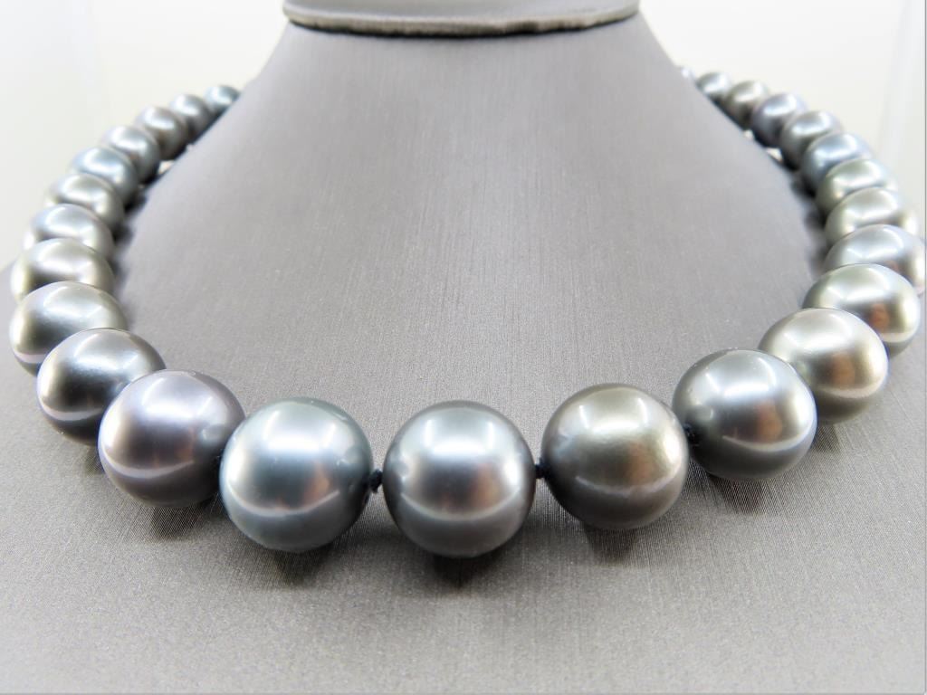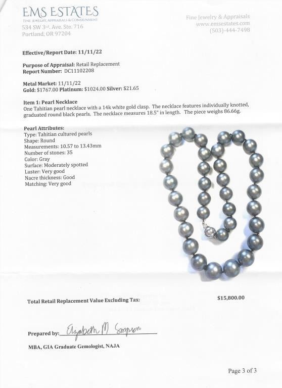 featuring Fine Pearls averaging 11.00-16.00 MM in diameter with rich luminous Silver color with Peacock overtones, measures 18 inches in length with 14 karat white gold ball style clasp. Luxurious Statement Piece. Full Appraised Value $15,800.00
