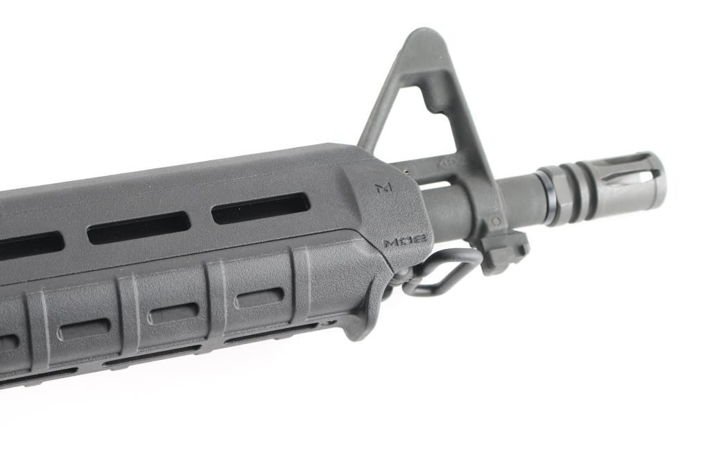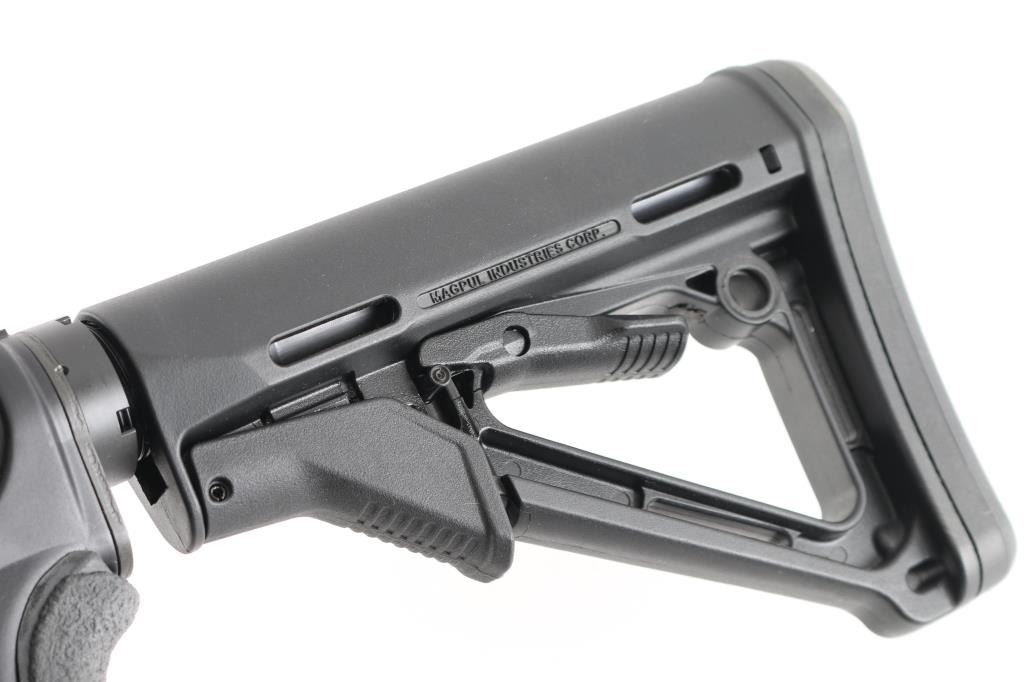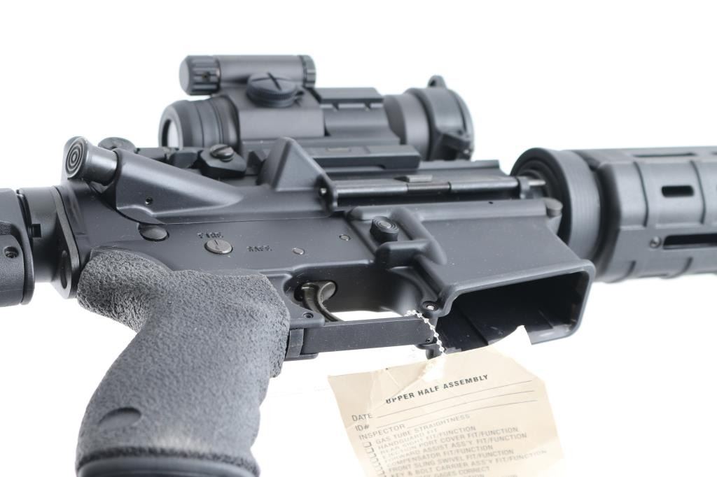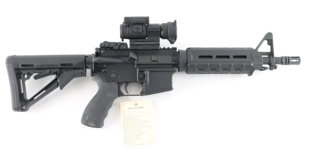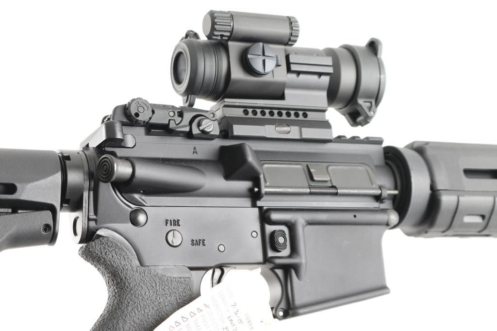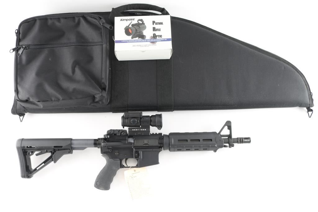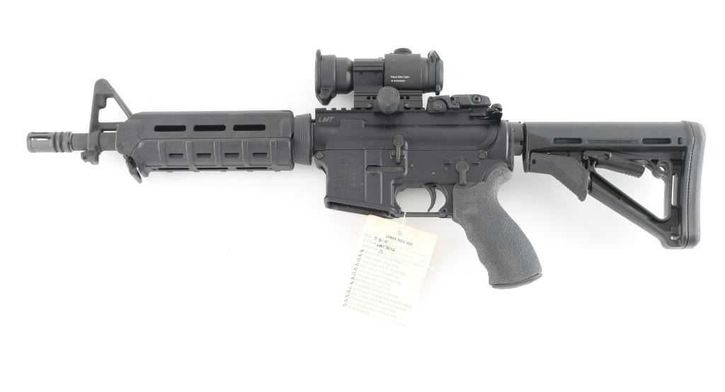 *** NFA ITEM - SBR - additional paperwork and wait involved *** Semiautomatic AR15 platform Short Barreled rifle built by premium maker Lewis Machine and Tool. Features matte black finish, Magpul black polymer collapsing stock & handguard, LMT black polymer grip, 10.5" hard chrome lined 1:7 barrel, 5 flute flash hider, triangular front sight base with bayonet lug & sling swivel, protected post front sight, Magpul MBUS folding rear sight, LMT upper with Picatinny rail on top, forward assist & ejection port cover, hard chrome plated BCG, LMT dry film lube coated buffer tube, manual safety. Mounts an Aimpoint Patrol Rifle Optic (red dot, tests good). Bore is pristine. Overall like new condition with few handling marks, LMT inspection tag still attached. Includes black nylon case, original box for optic. NO Magazine. Condition is NRA Excellent *** NFA Firearm ***