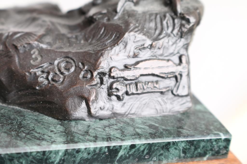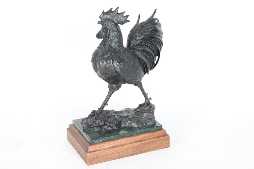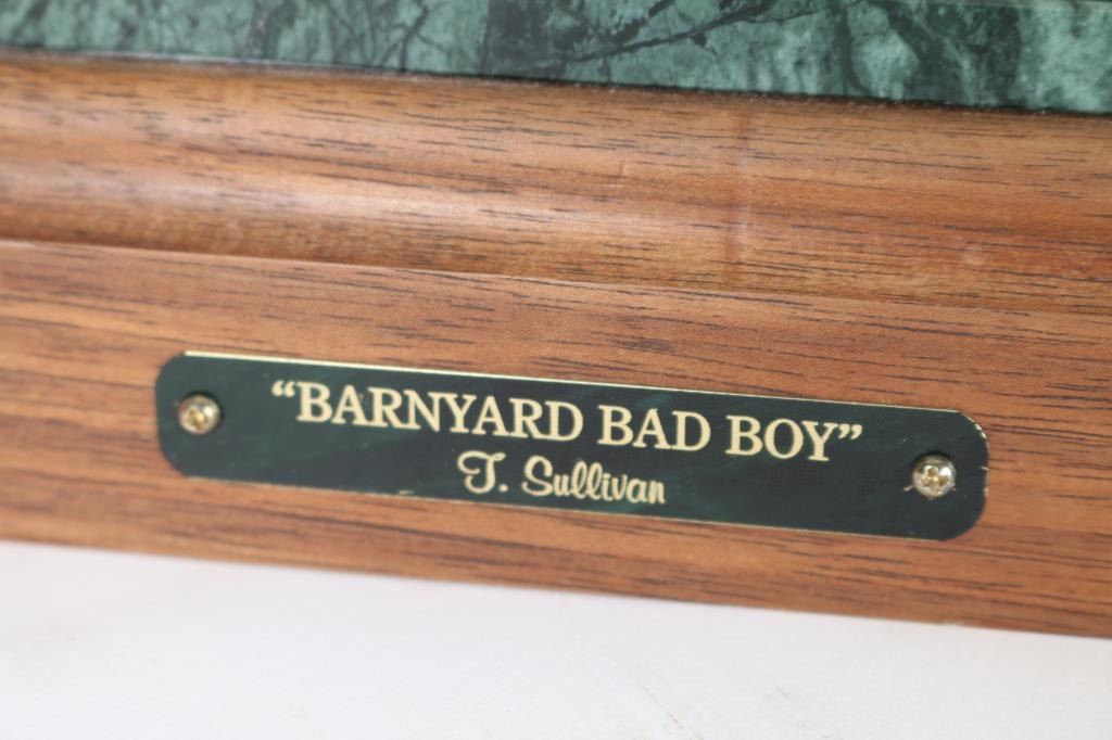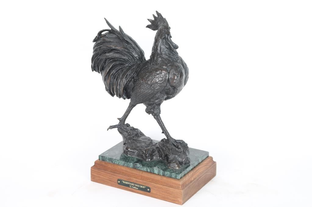 By T Sullivan, entitled "The Barn Yard Bad Boy" measuring 14x8x6". On marble and wood base.