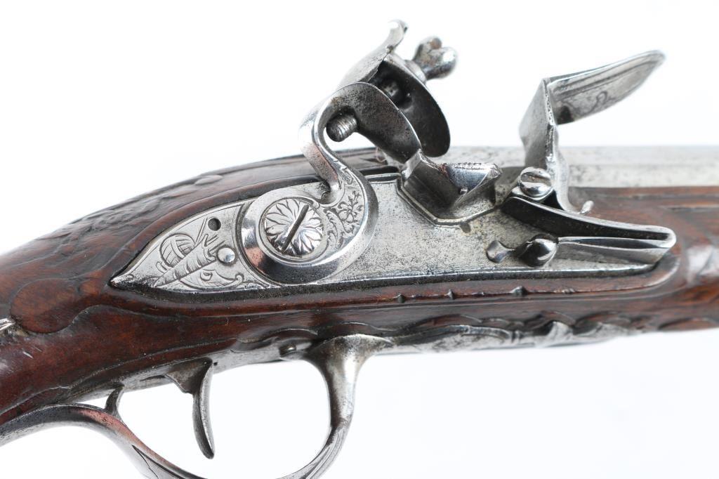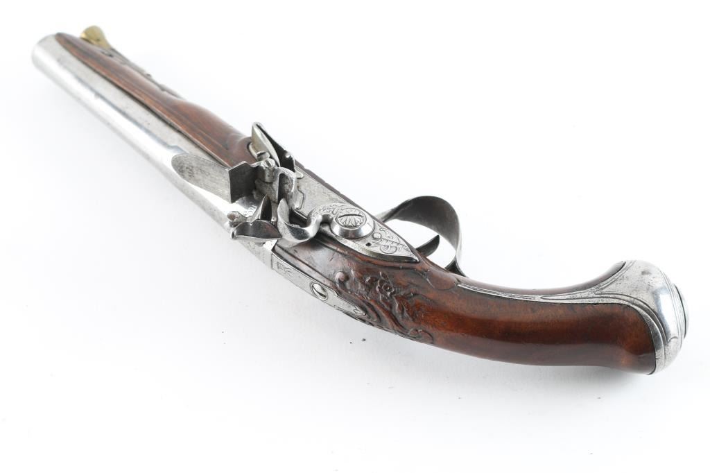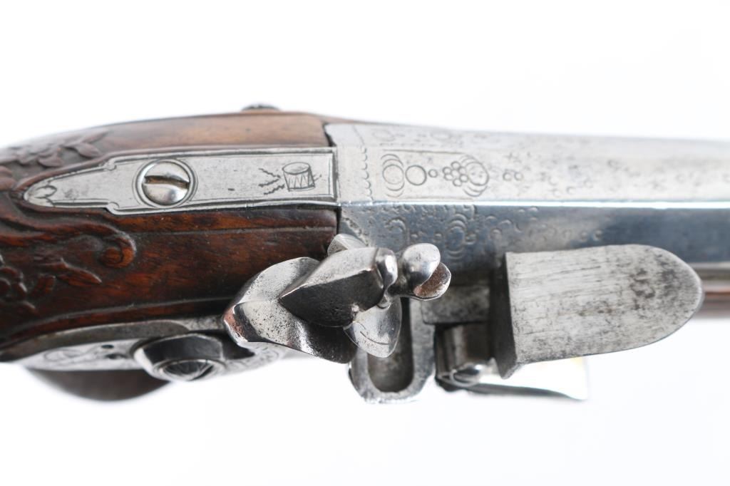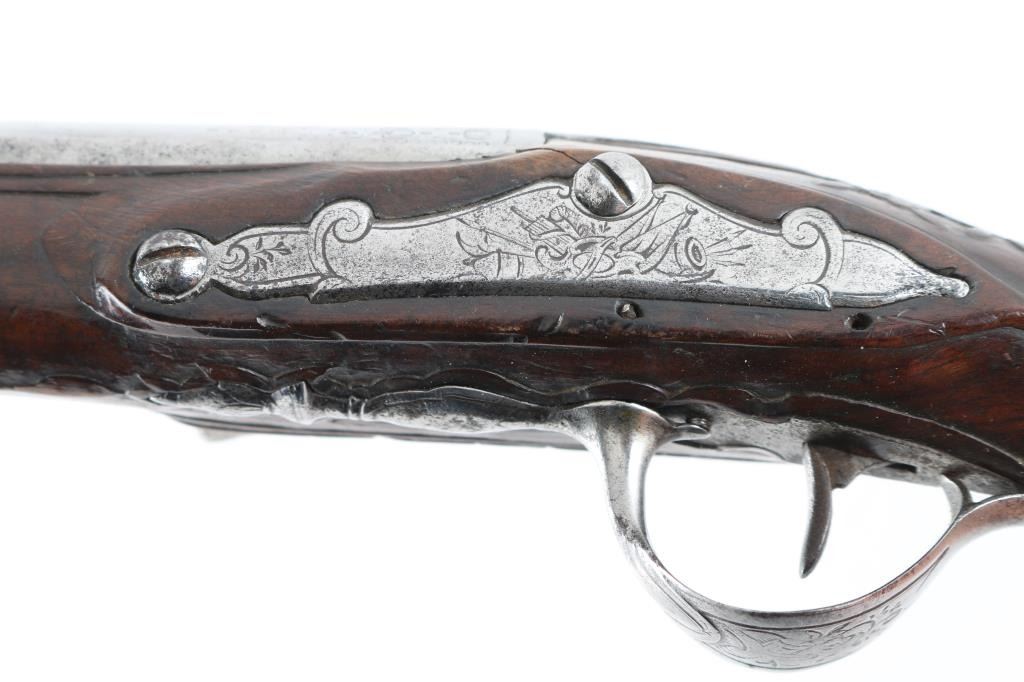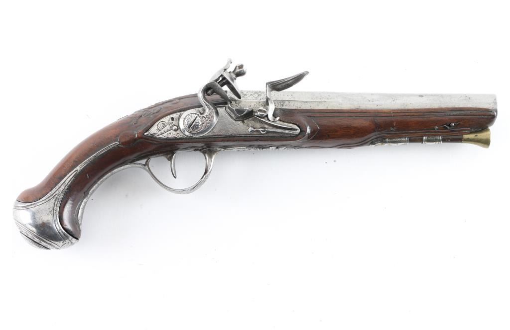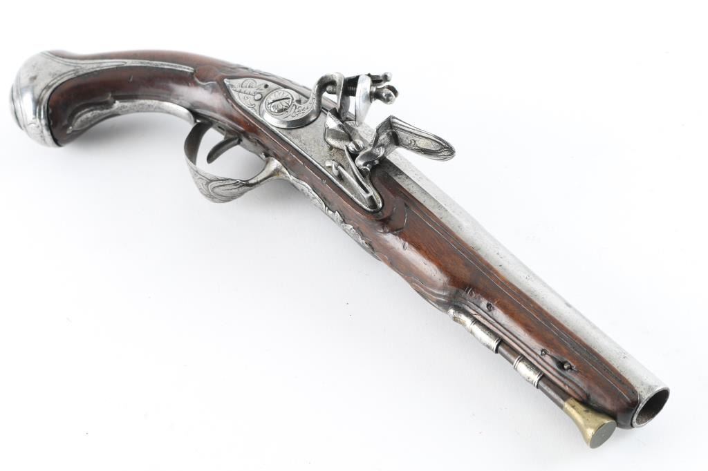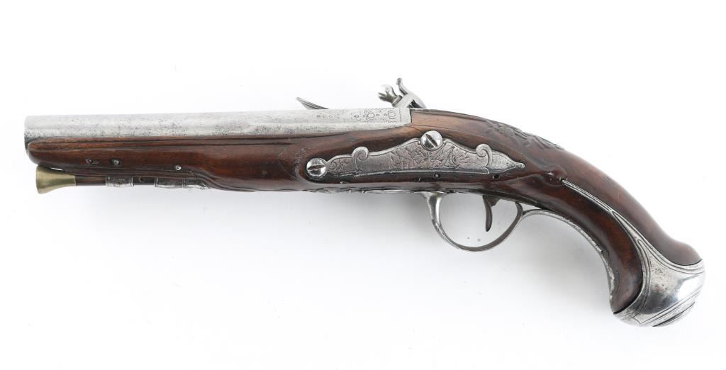 Probably French circa 1760-1780's approx 9 inches overall. 6.5" barrel that goes from octagon at breech to round. Lightly engraved but no maker's name or proofs. Correct small parts and original flint. About 60 cal smooth. Metal lightly cleaned and polished. Wood very good with carving at wrist. Correct style ram rod included. Works well. Good overall. (NRA Antique Standards) Antique Firearm