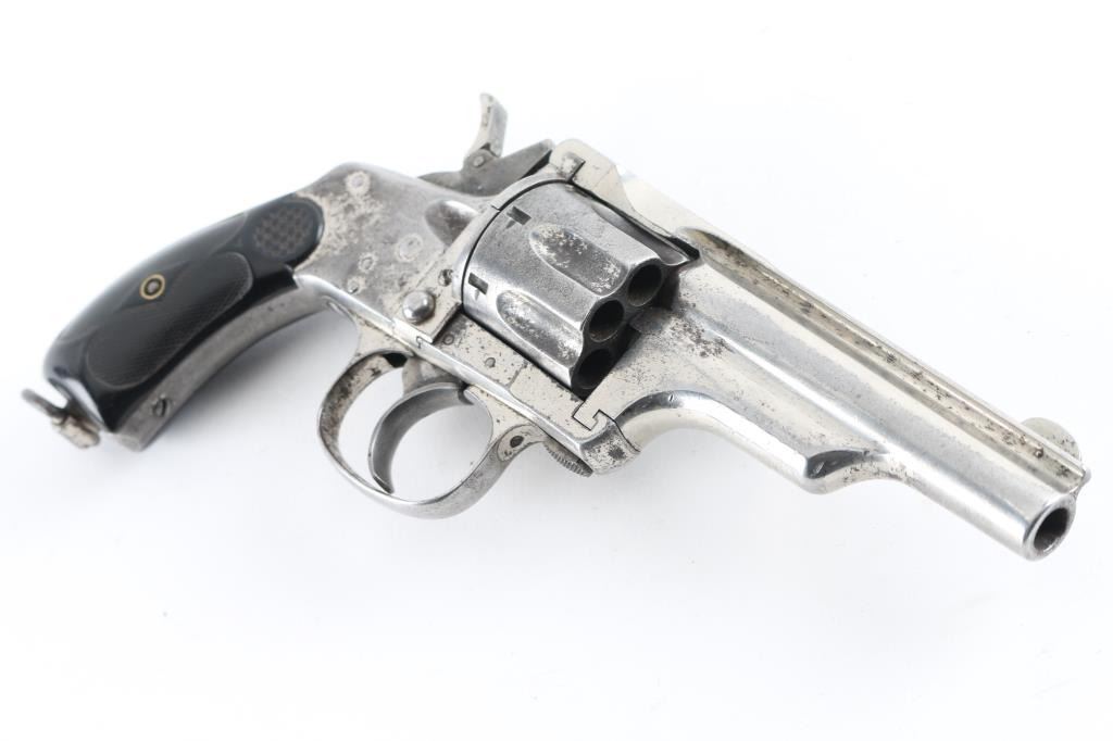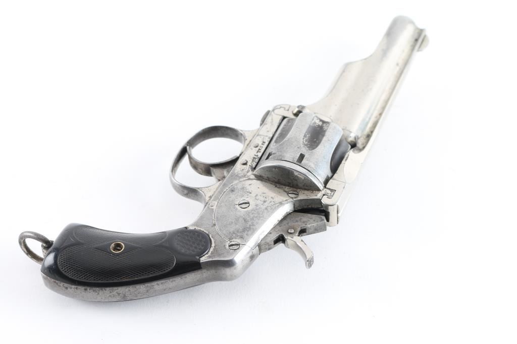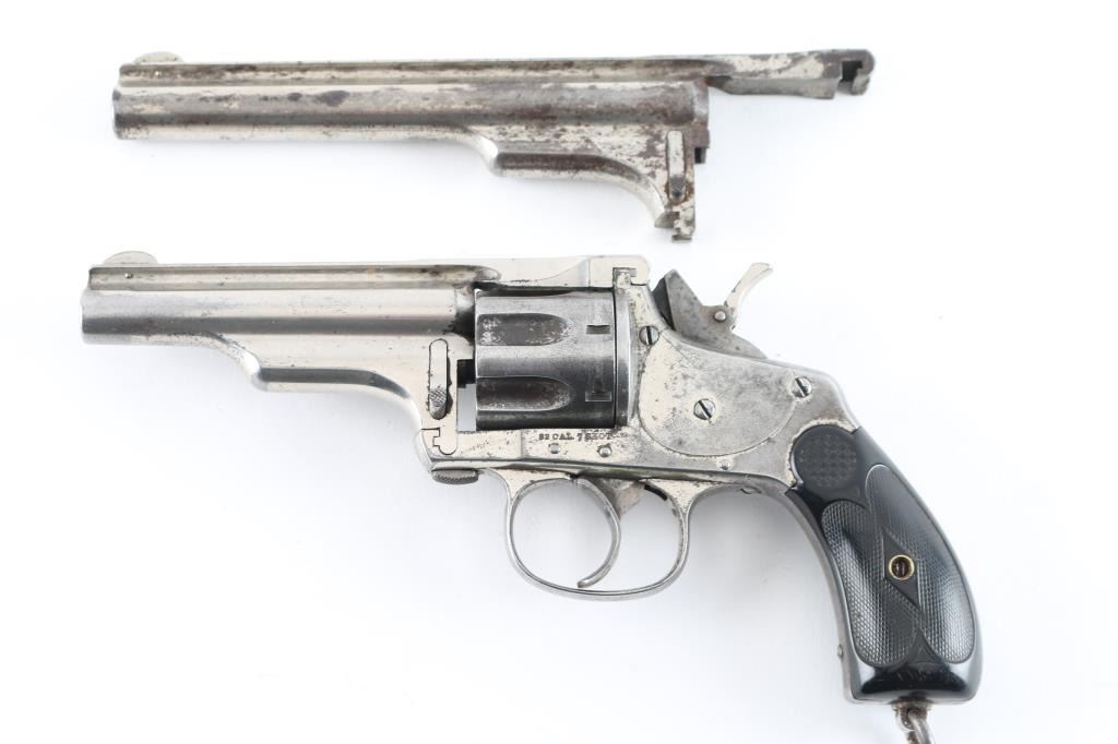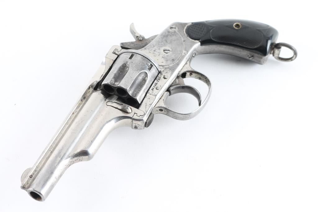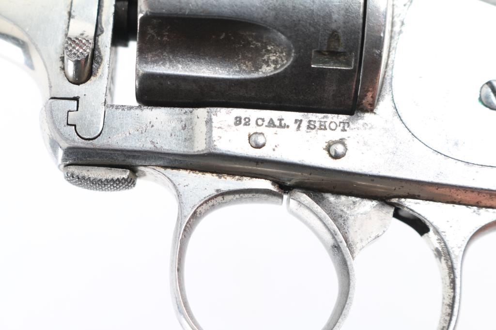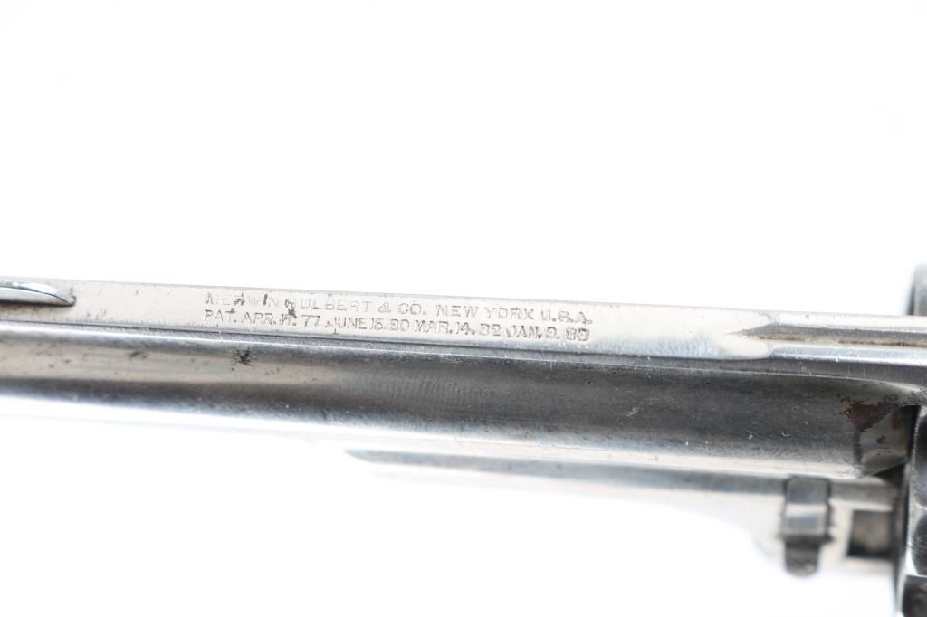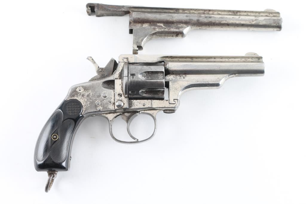 Two barrel set. Manufactured by Hopkins, & Allen circa 1880's Total made estimated at a few thousand. D/A 7-shot fluted cylinder, rarer model with the folding hammer spur, and lanyard ring. Standard nickel plated finish with checkered saw handle type hard rubber grips. Unique extraction and loading mechanism identical to the larger Army models. Serial number 1977 stamped on the left frame under the grip panel. Assembly number on the cylinder face, heel (faint), and face of barrel lug. 3.5" ribbed barrel with pinned front sight blade. folding spur in stamped "32" with patent date. Comes with matching second 5.5" barrel with same assembly number. Clear Merwin Hulbert address, and patent dates in two lines on the barrel rib. Left frame marked " 32 Cal. 7 Shot" Bore has rifling present, and has scattered areas of pitting, grips are very good, nickel finish is about 50% with handling loss on the cylinder, straps and rear of frame. Action works fine when you forward the barrel & cylinder, but when in place the hammer does not cock, needs adjustment. The second 5.5" barrel has clear Address, patent dates, with areas of finish loss turning a brown patina. Bore has rifling, but areas of pitting. NRA Condition-Very Good as Antique. Antique Firearm