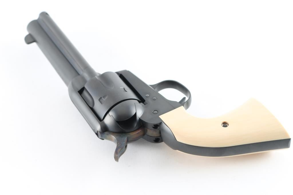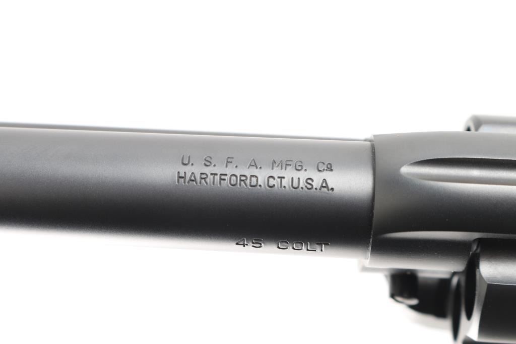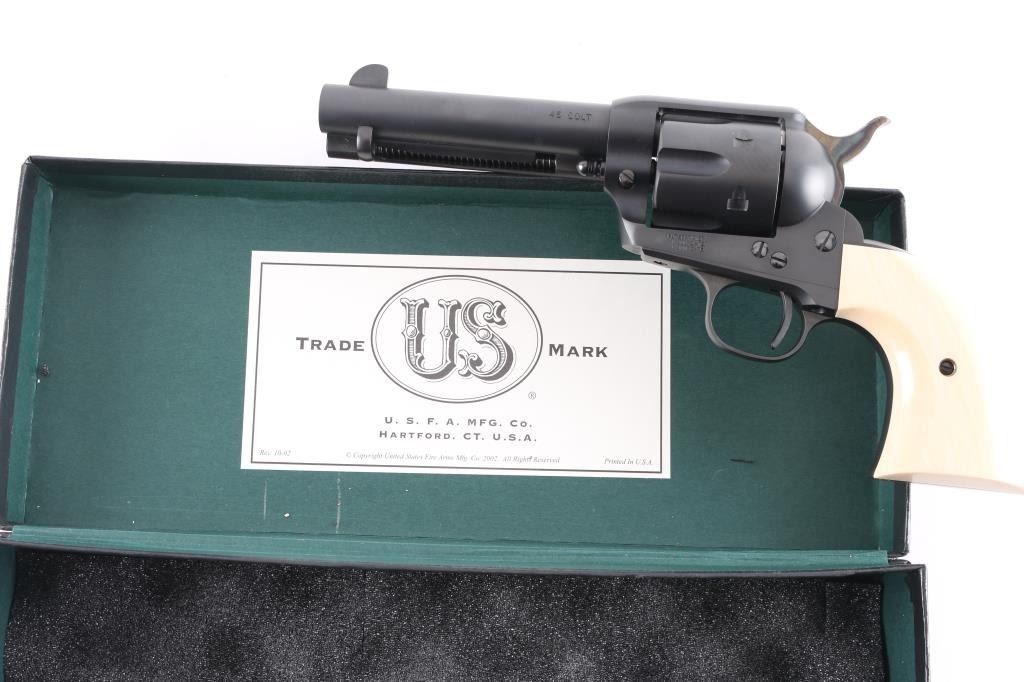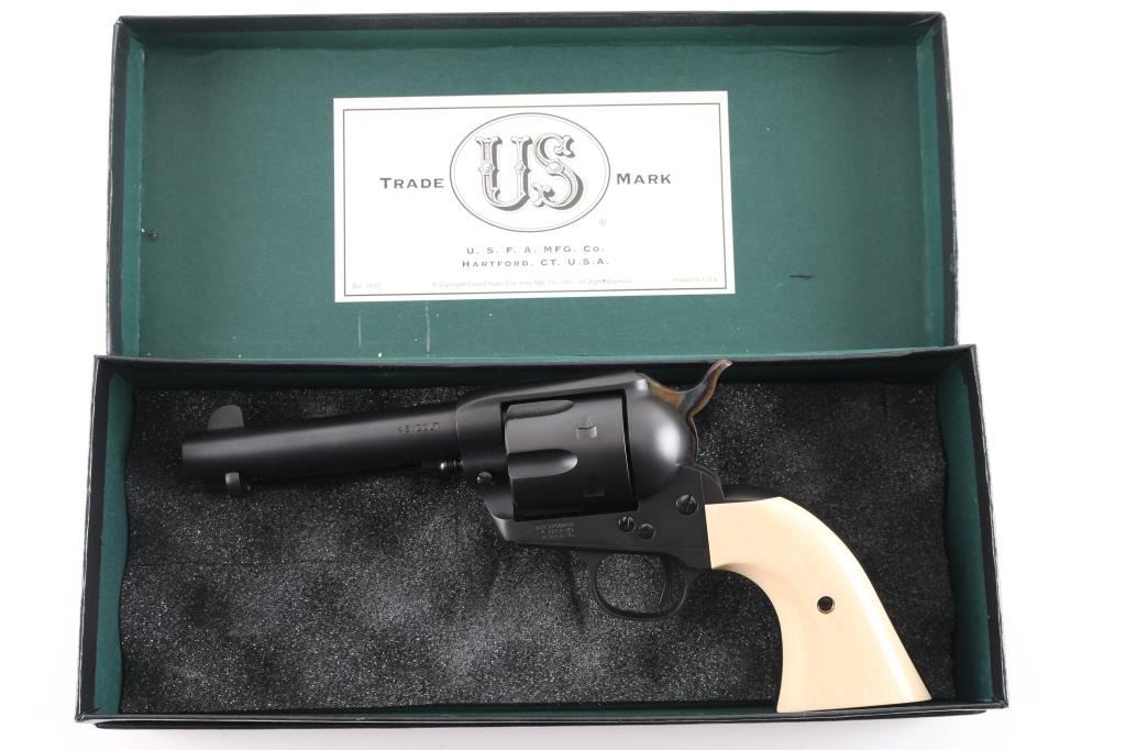 Exceptional single-action revolver chambered in .45 Colt, produced by United States Fire Arms Mfg. Co. based out of The Colt Armory complex in Hartford, Connecticut. The company is renowned for their superb quality and finish but went out of business in 2011. This revolver features blued finish, 4.75" barrel, blade front sight, 'v' notched rear sight, fluted six-shot cylinder, and smooth two piece faux ivory grips. Barrel is marked with the two line USFA address on the top. Bore and charge holes are pristine. Retains approx 99% of it's original finish showing hardly any signs of handling. Case colors on hammer are excellent with fiery colors. "Tru Ivory" grip by Bar-S Grips are excellent, with their "Certificate of Nonauthenticity". Action is smooth with tight lock up. Includes black cardboard factory box with paperwork, factory cloth bag. These guns retailed for $1250 new, when you could get them.