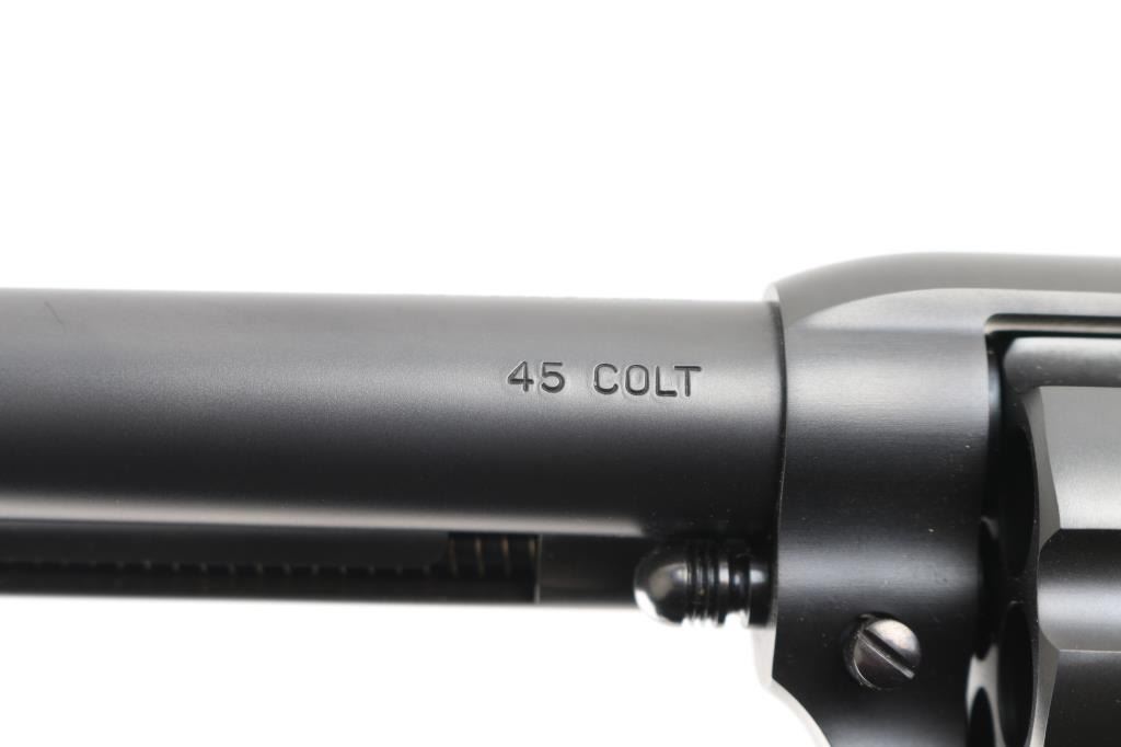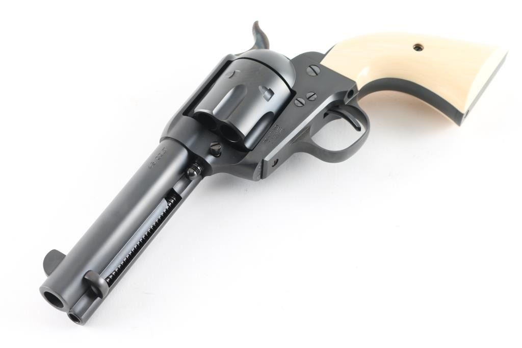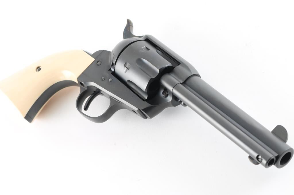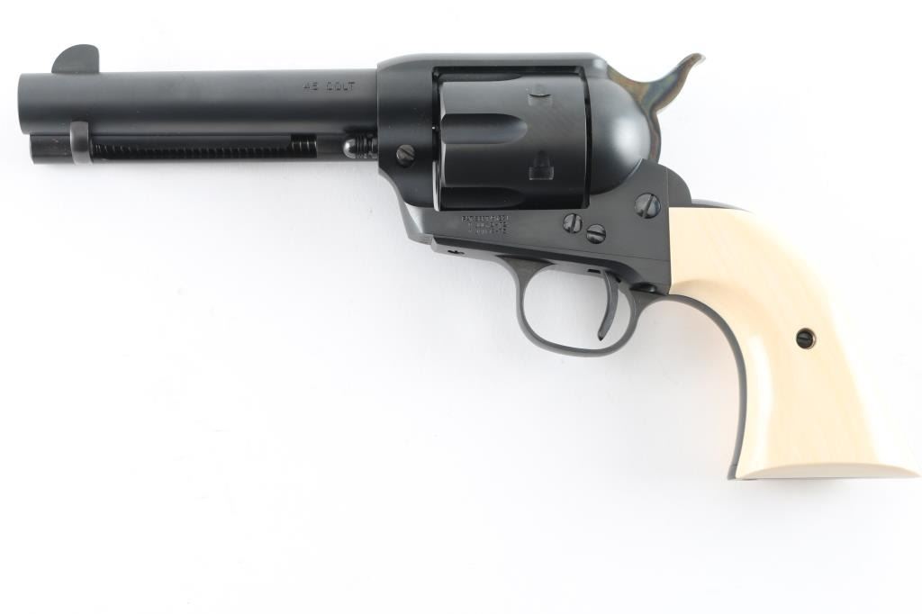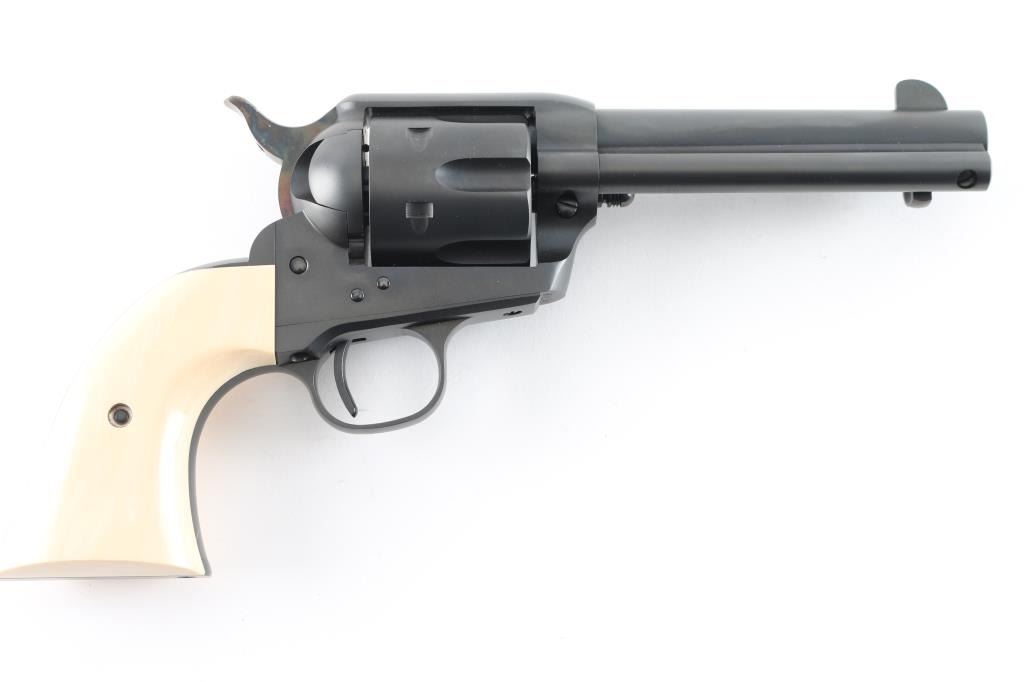 Exceptional single-action revolver chambered in .45 Colt, produced by United States Fire Arms Mfg. Co. based out of The Colt Armory complex in Hartford, Connecticut. The company is renowned for their superb quality and finish but went out of business in 2011. This revolver features blued finish, 4.75" barrel, blade front sight, 'v' notched rear sight, fluted six-shot cylinder, and smooth two piece faux ivory grips. Barrel is marked with the two line USFA address on the top. Bore and charge holes are pristine. Retains approx 99% of it's original finish showing hardly any signs of handling. Case colors on hammer are excellent with fiery colors. "Tru Ivory" grip by Bar-S Grips are excellent, with their "Certificate of Nonauthenticity". Action is smooth with tight lock up. Includes black cardboard factory box with paperwork, factory cloth bag. These guns retailed for $1250 new, when you could get them.