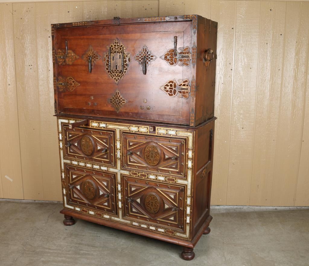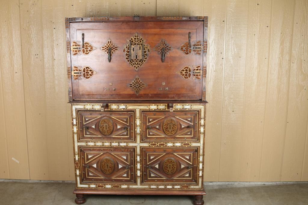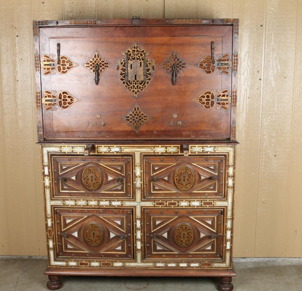 or writing desk with base from Spanish Colonial Era. Approx 1600-1800. Finely inlaid with rich gold leaf and many compartments for papers and orders. The Estate of Eric Value. Obtained from Mojico Gallo, owner of the Peruvian Gold Museum. Good condition for its age small repairs etc. Measures62X44X18