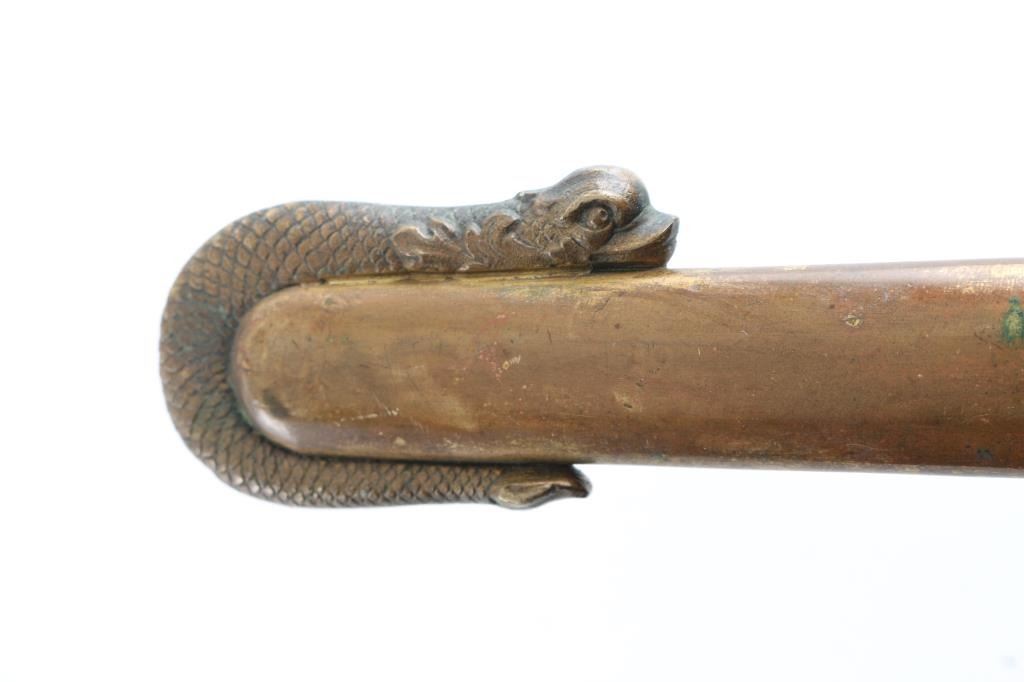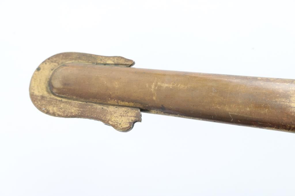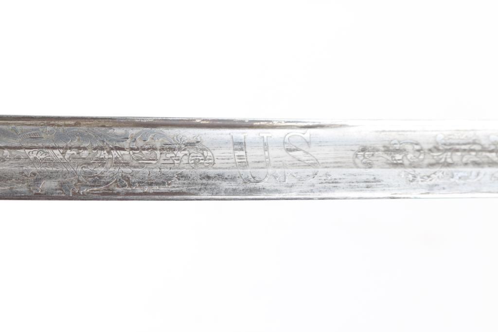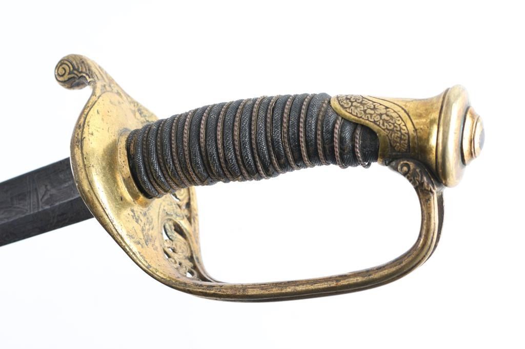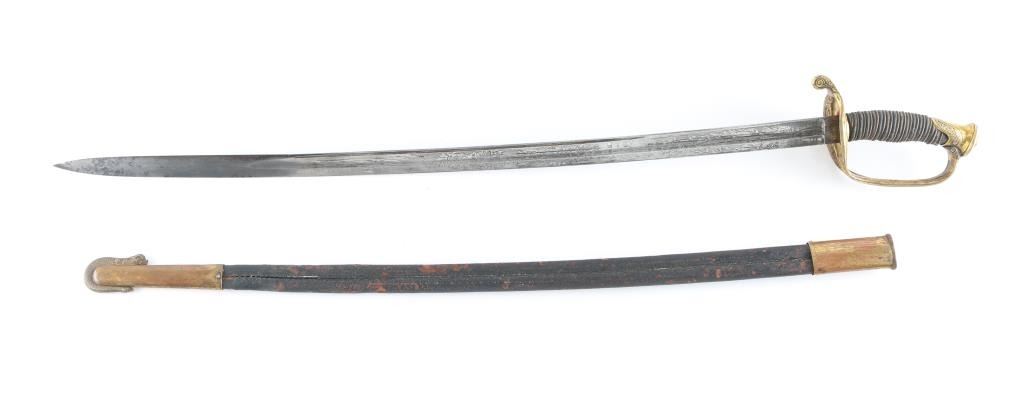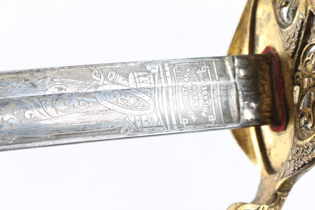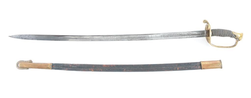 Civil War era, marked "W.H. Horstmann & sons, Philadelphia", with etched floral scrolls on blade, brass guard & fittings. Approx 39.5" overall length, 33.5" blade, fair condition. Blade has Military motifs, including the American Eagle, "U.S." and "E Pluribus Unum", flat of blade marked "Iron Proof". Blade shows light scattered patina near hilt, increasing to mix of silver & brown colors near tip. Wire wrap, and fish skin on handle are intact. Note* This sword comes in what appears to be a M1859 USMC NCO scabbard. Leather with two brass mountings, with frog stud. Drag has the "Sea Serpent", which I believe is WKC manufacture due to the fine scales on the Serpent. Leather is scuffed, and there is some separation above the drag, but it is complete, extremely rare to find.