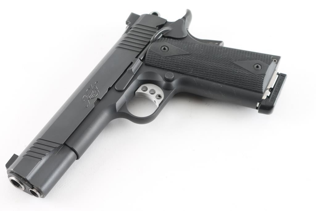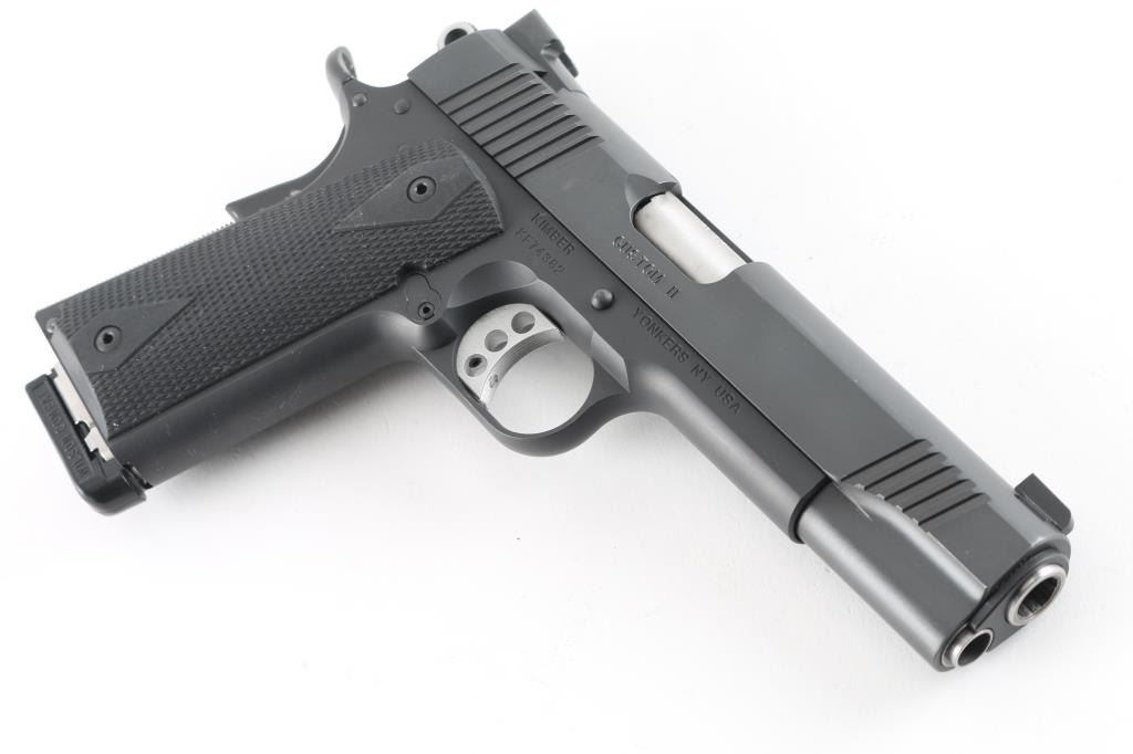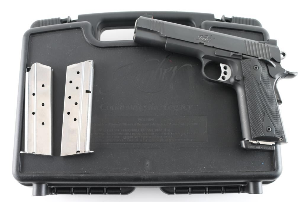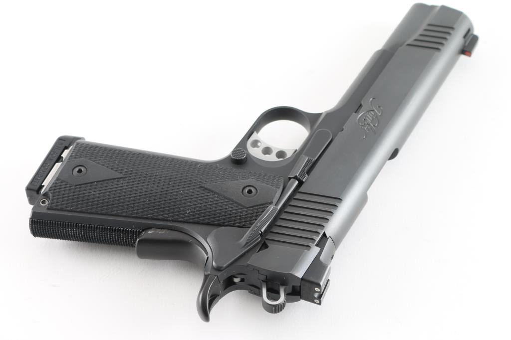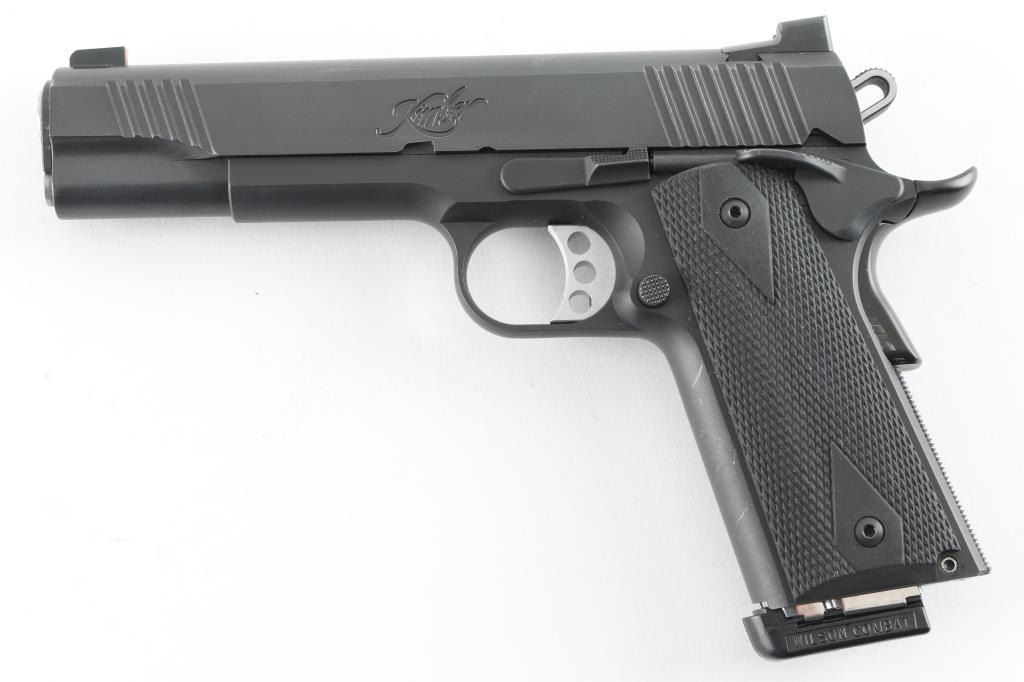 High quality semiautomatic pistol chambered for 10mm Auto. Features matte black finish, 5" barrel, extended manual "thumb" safety, upswept beavertail grip safety, adjustable overstop trigger, flat checkered mainspring housing, full length recoil spring guide, beveled magazine well, dovetail mounted 3 dot night sights, double diamond checkered black rubber grips. Bore is very good condition. Finish is excellent with minor handling marks. Night sights retain their glow. Includes (1) Wilson Combat magazine, (3) Kimber magazines (note from previous owner - one of these mags is "bad", bad mag not marked), factory plastic carry case with paperwork and bushing wrench. Condition is NRA Excellent *** Modern Firearm ***