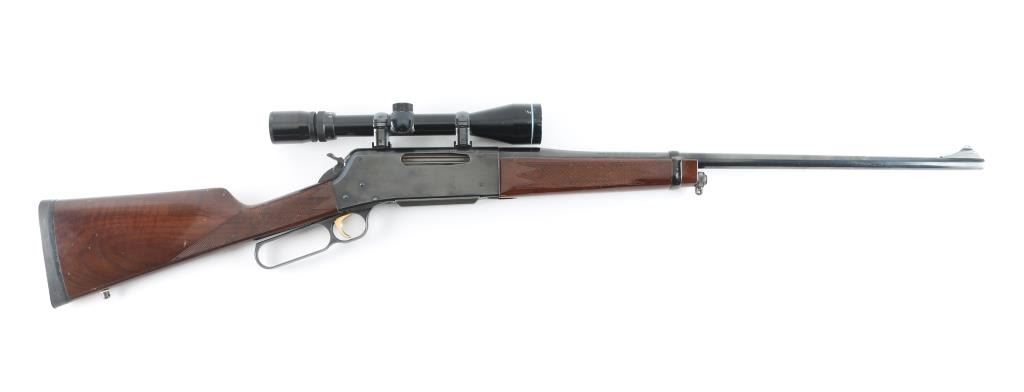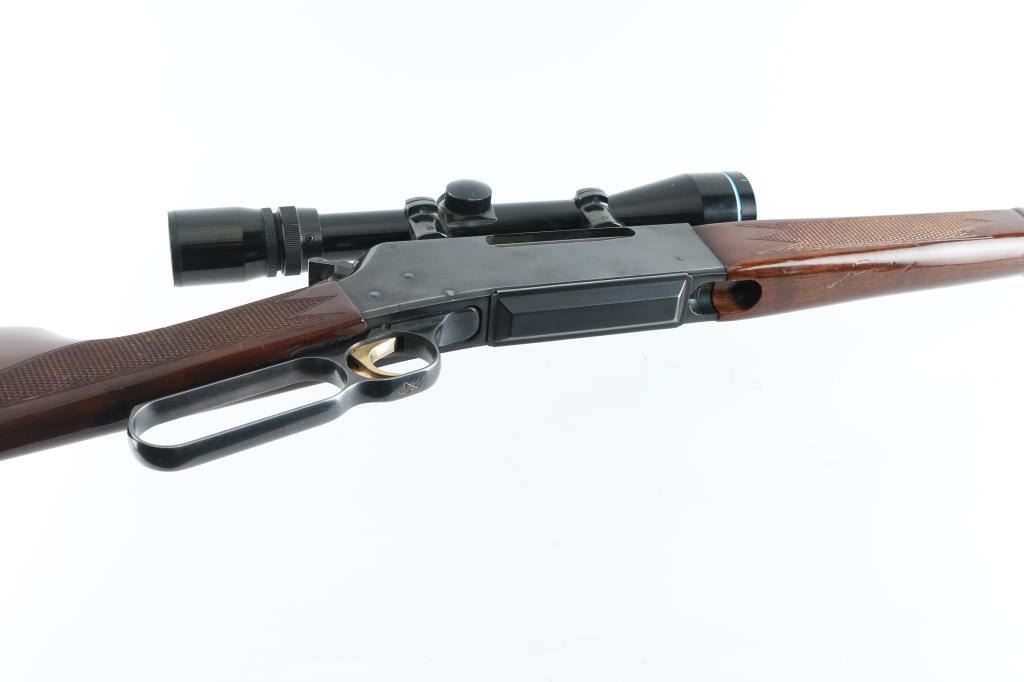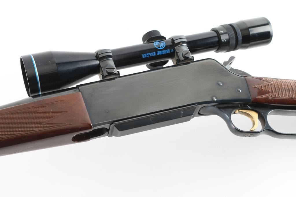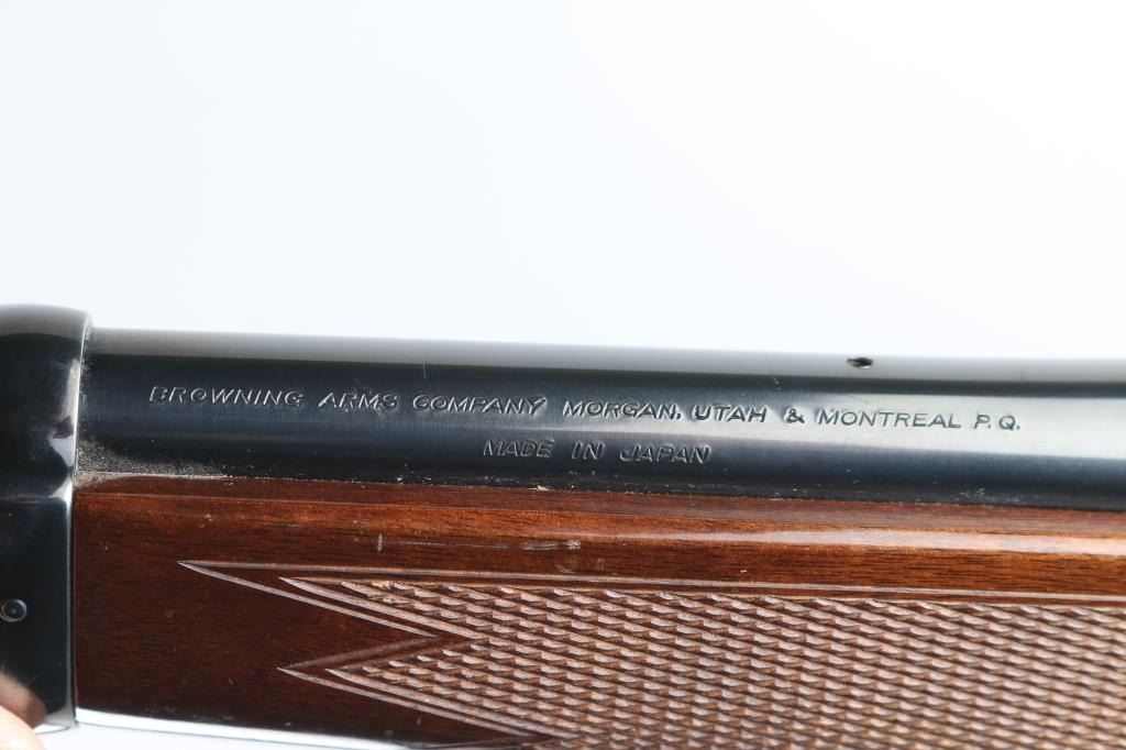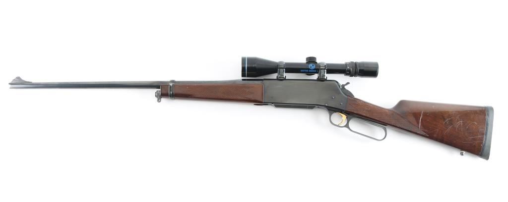 Japanese made lever action rifle chambered for 7mm Remington Magnum ammunition circa 1991. It has a 24" blued barrel and receiver with a serrated gold color trigger, serrated hammer spur, detachable box magazine, a raised blade front sight, rear sight removed and a screw has broken off in the rear hole. Two piece wood stocks are checkered at the wrist and on the forearm behind the barrel band with a Browning rubber recoil pad. Swivel studs attached. Metal finish looks good with a couple of bare metal spots on the barrel and at the muzzle. Receiver has a couple of surface scratches but looks good. Wood stocks show use and wear with a few dings and scratches. Bore looks very good, dusty. LOP is 14". Comes with an Ultra Vision 3-9x40 scope with rings and bases, optics are clear. Condition is NRA Very Good *Modern Firearm*