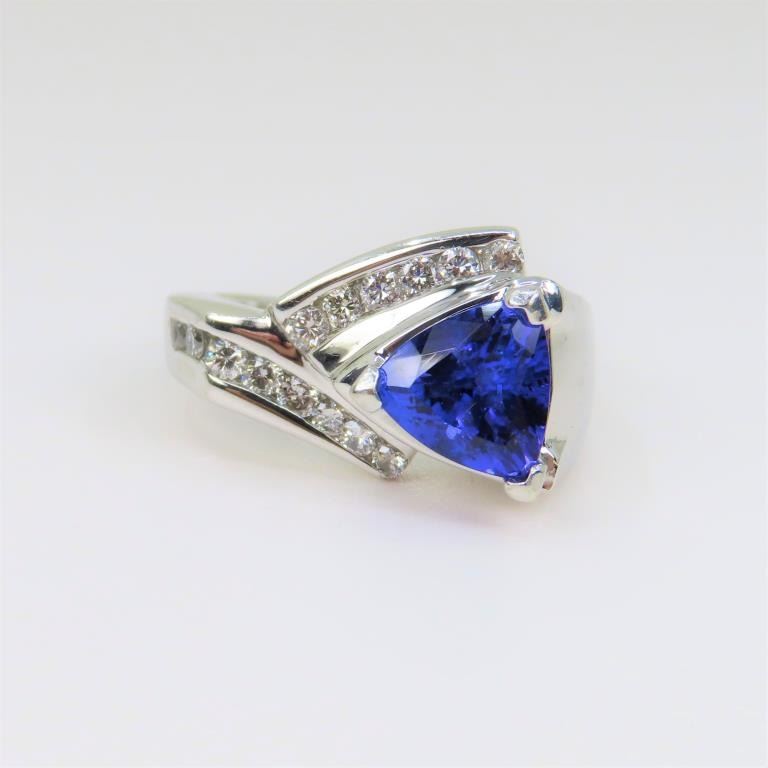 featuring an extra fine AAA quality vivid Purplish/Blue trilliant cut Tanzanite weighing approx. 3.50- 4.00 carats accented with 14 fine channel set Diamonds weighing approx. 0.52 carats with G-H colors and VS clarity set in a one of a kind heavy 14 karat white gold custom made setting. Retail $7,000-$9,000 Approx size 8