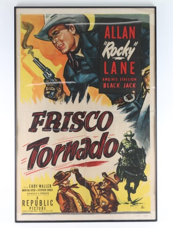 advertising Allan "Rocky" Lane in Frisco Tornado with his horse "Blackjack". Approx 41"x26". Republic Pictures #50 of 549 . Great scene of Lane with Colt SA and other western action at lower. Full size, good condition with folding and aging. Black metal frame.