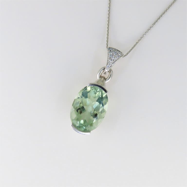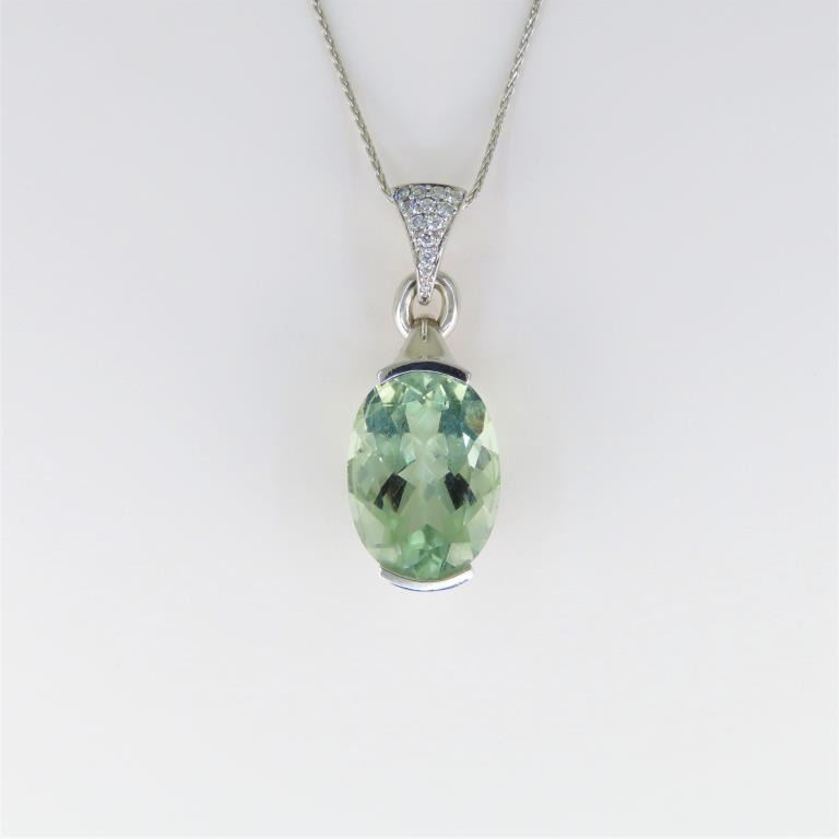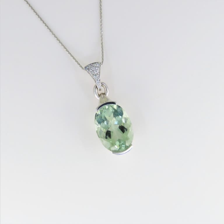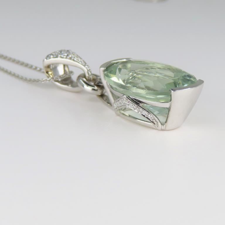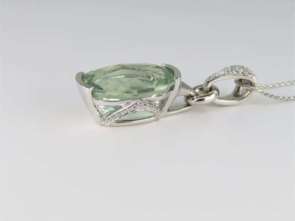 and Diamond Pendant featuring an oval cut Green Amethyst weighing approx. 15.00-20.00 carats accented with 32 round ‘IDEAL’ cut Diamonds weighing approx. 0.20 carats with F-G colors and VS clarity set in 18 karat white gold custom made setting. Retail $3,000-$4,000