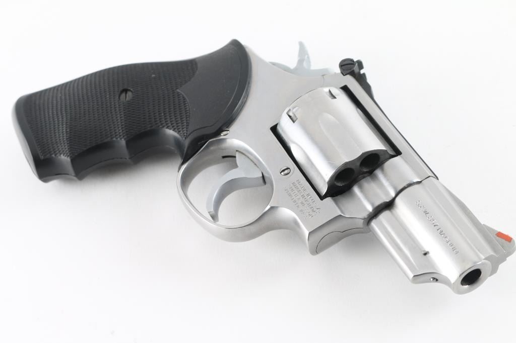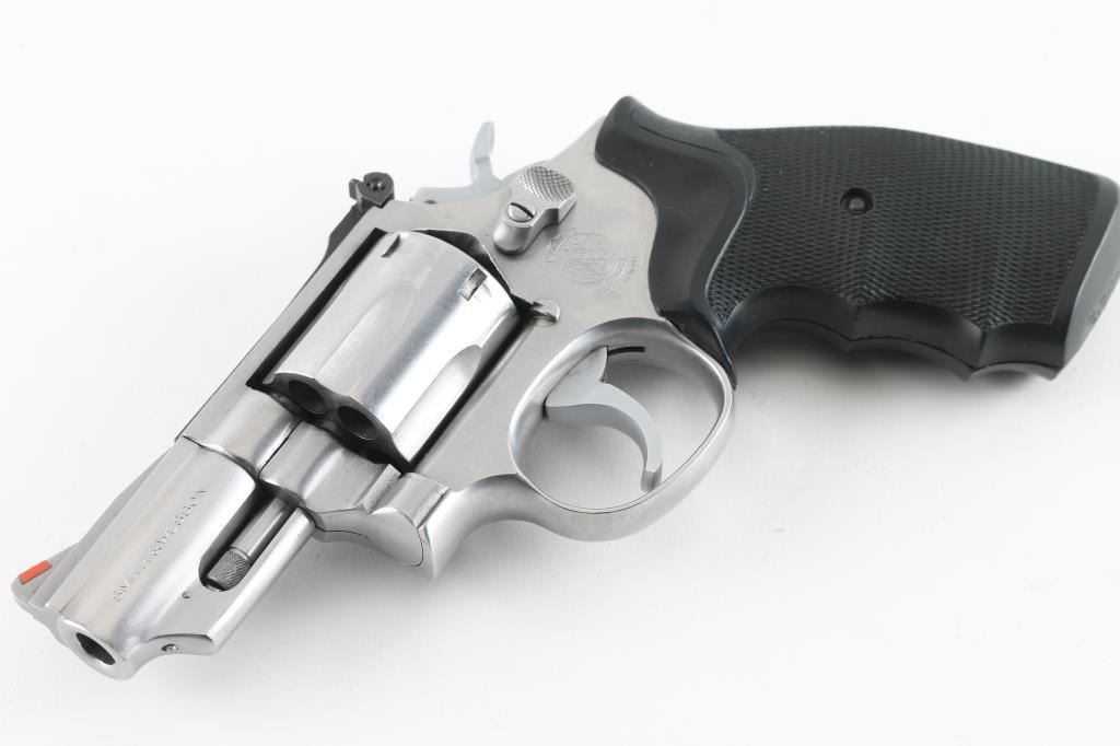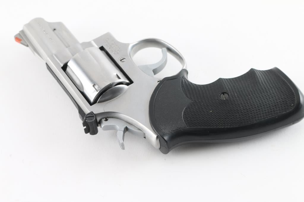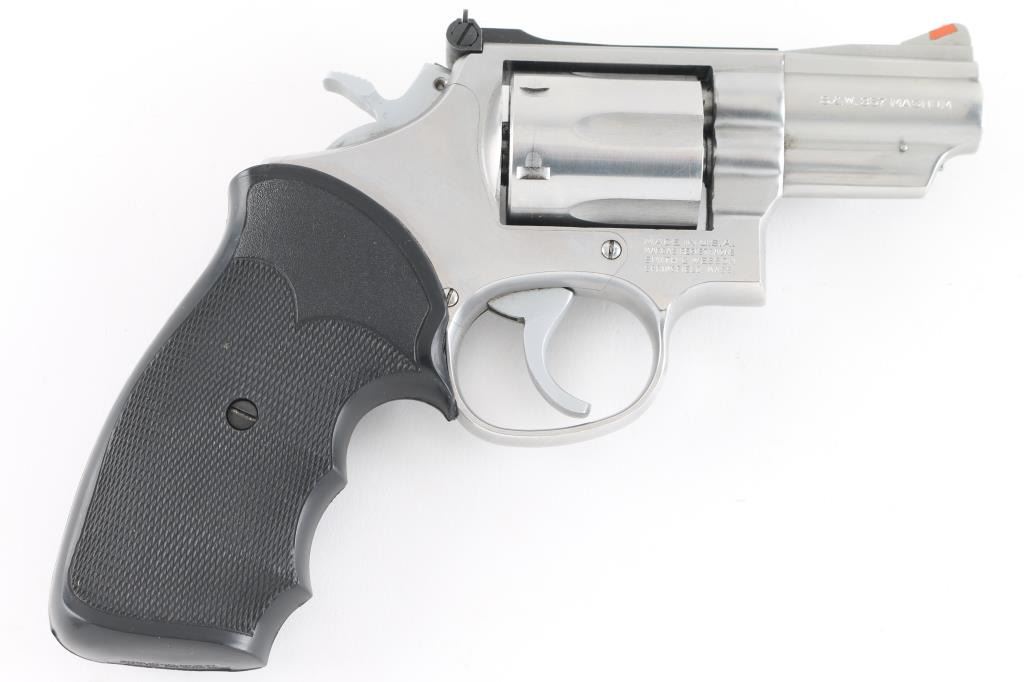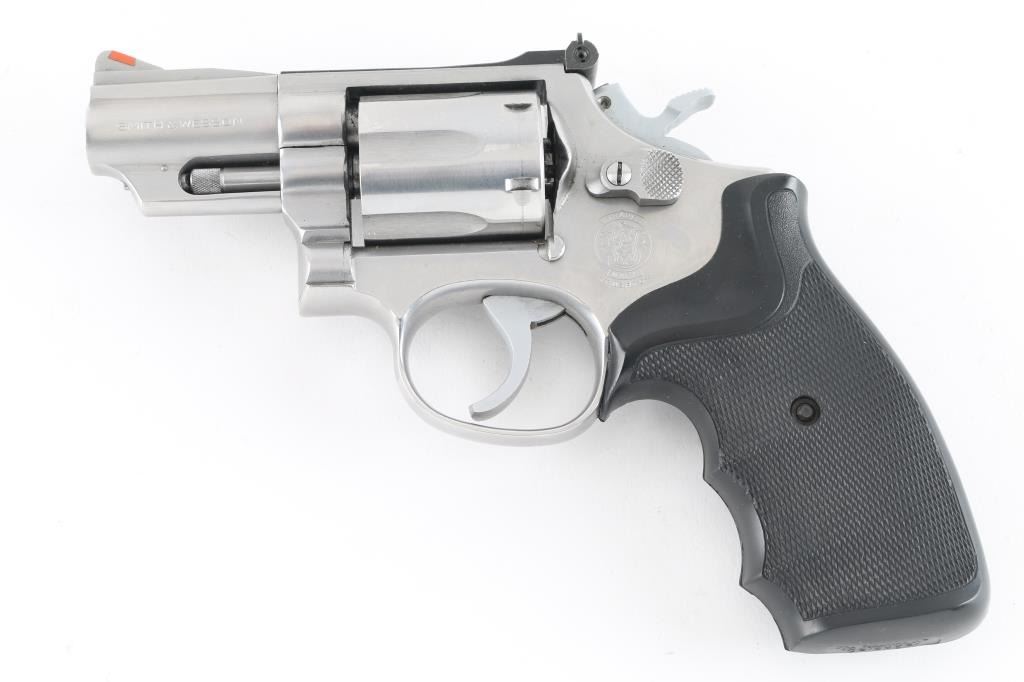 Revolver. D/A, S/A. 6-rd capacity. "The .357 Combat Magnum Stainless" Produced 1970-2004. K target 3-screw frame. Round butt. 2 1/2" lugged barrel with orange insert ramp front, and micrometer click rear sights. . Smooth trigger. Checkered Pachmayr "Gripper" grips. Bore and cylinders appear excellent, a little dirty. Action is crisp/tight. Stainless metal finish is good with a some minor scratches. Grips are very good. NRA condition-Very Good. Modern Firearm.