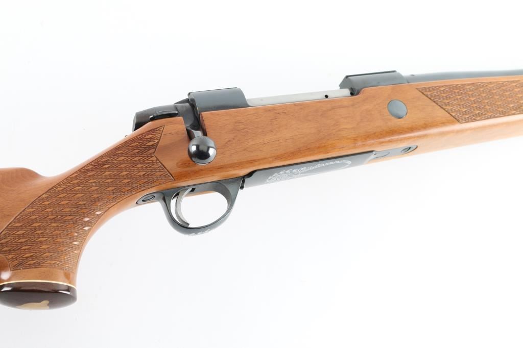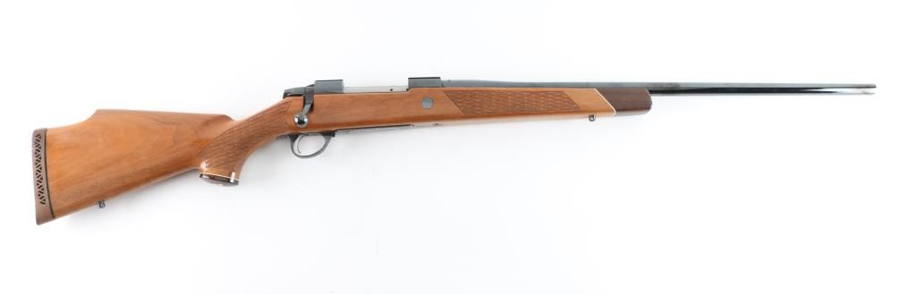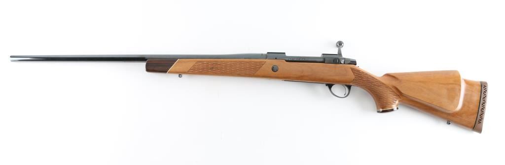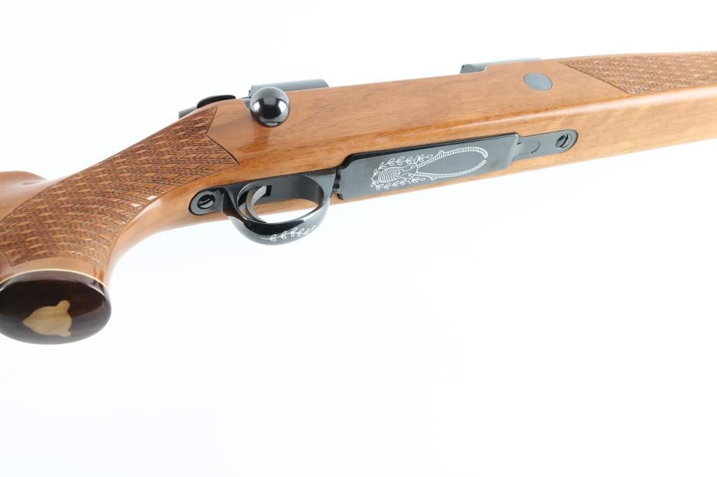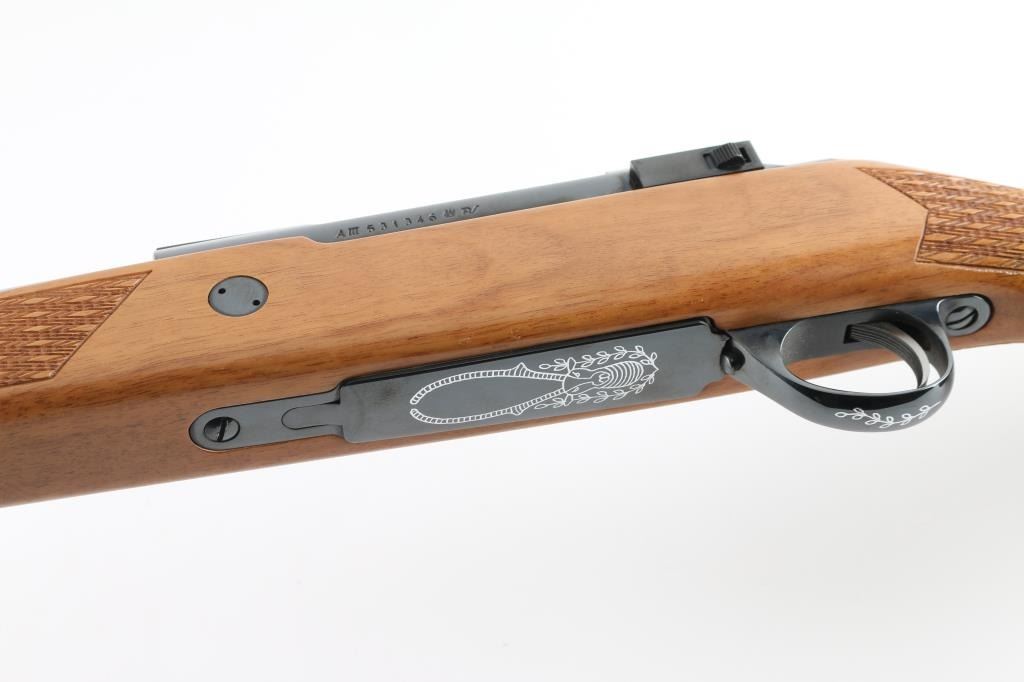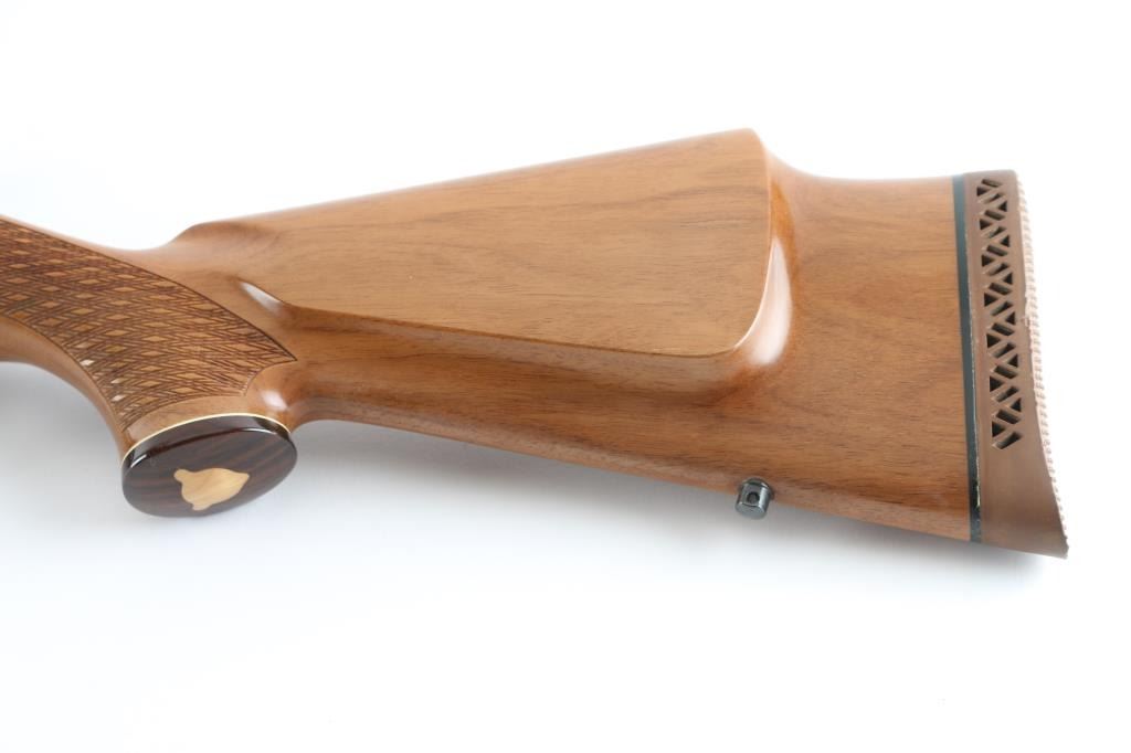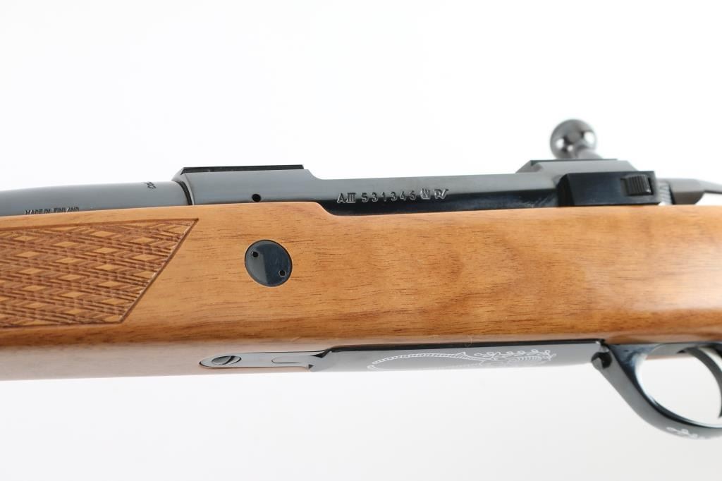 Finnish bolt action rifle, imported by Stoeger, NJ, manufactured circa 1978-1981. Features blued finish, wood Monte Carlo stock with raised comb, right hand cheek piece, ventilated rubber recoil pad, checkered panels at forend & curved wrist, contrasting darker wood forend tip & grip cap (grip cap has inset bear logo in lighter color wood), sling studs, 24" barrel, no sights, hinged floorplate, manual safety on right side of action, flat top receiver with dovetail rails. Engraved and silver color filled engraving of horned game animal on floorplate, simple leafed vine on triggerguard. Bore is very good condition. Retains 95% dark bluing with few handling marks. Stock is very good condition, some clouding or scuffing of finish on sides of butt. Condition is near NRA Excellent *** Modern Firearm ***