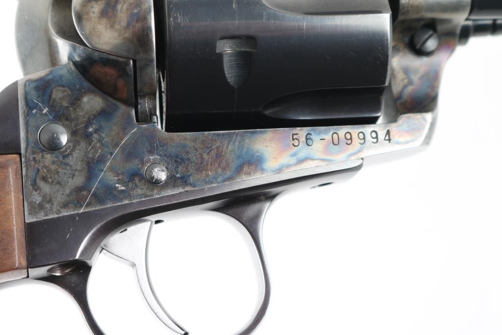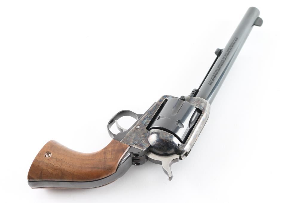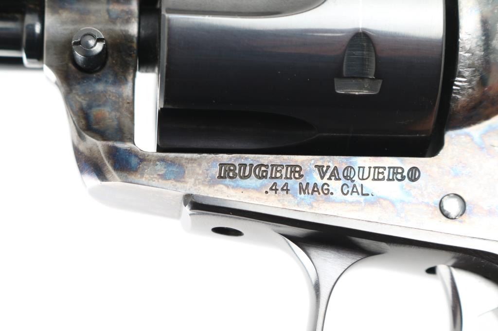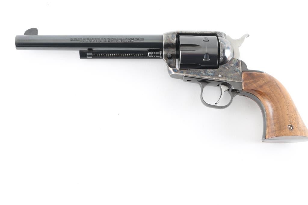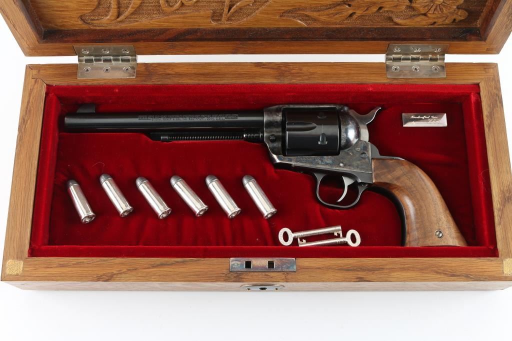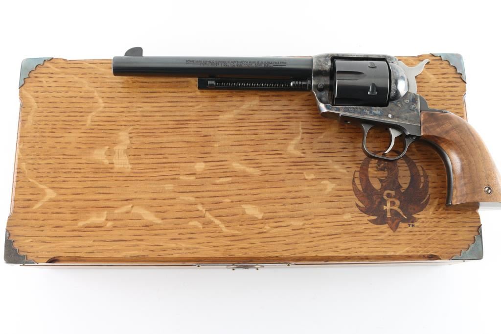 Custom cased western style single action revolver chambered in .44 Magnum, manufactured in Southport, CT circa 1996. Features a blued & case hardened finish, 7 1/2" barrel, blade front sight, square notched rear sight, ejector rod with flat face button, fluted six-shot cylinder, smooth wide trigger, serrated hammer spur, transfer bar safety, and custom two-piece smooth figured walnut grips. Includes a custom made display case by Lee Anderson (Heirlooms in Wood) complete with the Ruger insignia inlayed in the top, hand carved lid, etched glass top and velvet lined fitted interior with dummy cartridges. Revolver retains approximately 90% of its original finish showing light holster wear, scattered scratches, some scrapes on the frame and the ejector rod housing appearing to have been painted black. Action is smooth with good lockup, the bore is excellent, and the custom wood grips are fine. Condition is NRA Very Good. ***Modern Firearm***