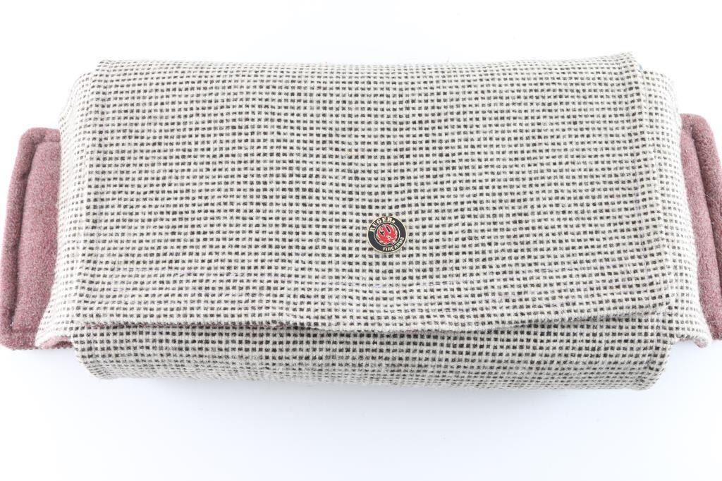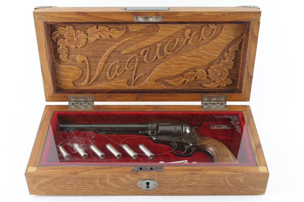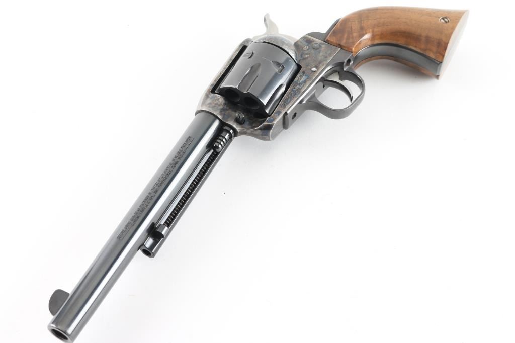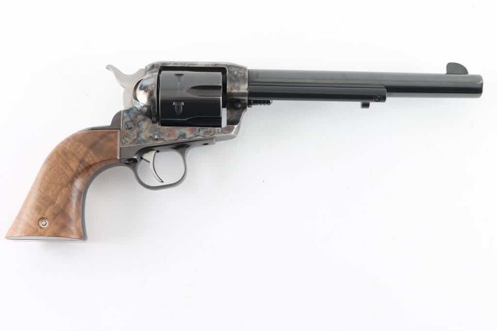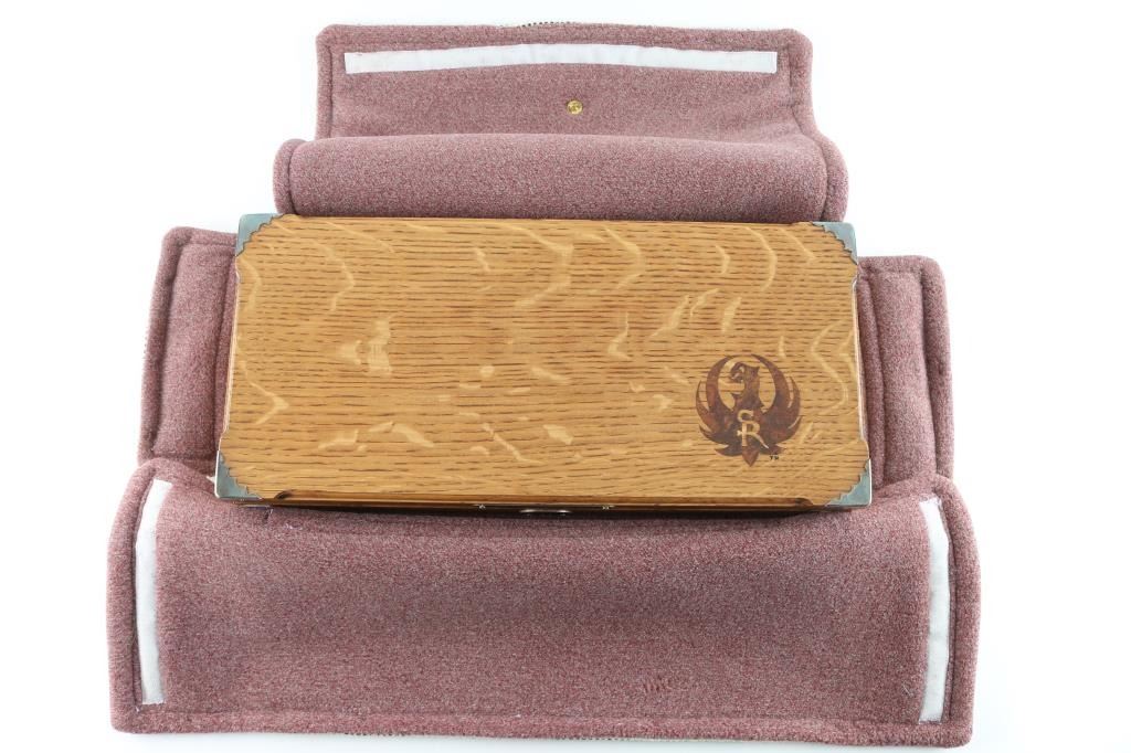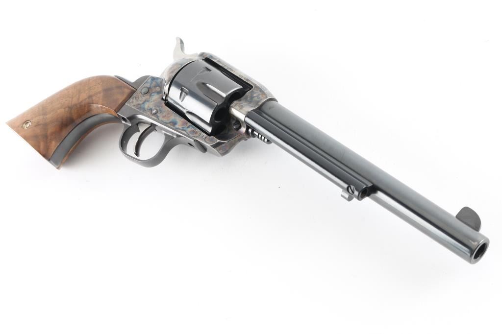Custom cased western style single action revolver chambered in .44 Magnum, manufactured in Southport, CT circa 1996. Features a blued & case hardened finish, 7 1/2" barrel, blade front sight, square notched rear sight, ejector rod with flat face button, fluted six-shot cylinder, smooth wide trigger, serrated hammer spur, transfer bar safety, and custom two-piece smooth figured walnut grips. Includes a custom made display case by Lee Anderson (Heirlooms in Wood) complete with the Ruger insignia inlayed in the top, hand carved lid, etched glass top and velvet lined fitted interior with dummy cartridges. Revolver retains approximately 90% of its original finish showing light holster wear, scattered scratches, some scrapes on the frame and the ejector rod housing appearing to have been painted black. Action is smooth with good lockup, the bore is excellent, and the custom wood grips are fine. Condition is NRA Very Good. ***Modern Firearm***