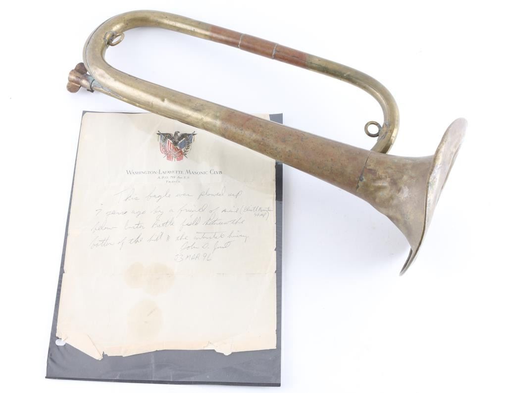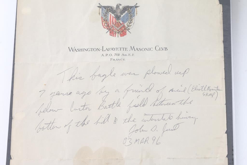 on Washington- Lafayette Masonic Club Stationary stating "this bugle was plowed up 7 years ago by a friend of mine (Elliot Mountain Sheep) from Custer Battlefield between the bottom of the hill and the interstate hiway". "Signed John D Just 03 March 96". The bugle shows dents and rust and missing mouthpiece. Formally Richard "Dick " Engle Collection, president of the Far West Arms Collectors Association who collected historic relics, bugles, and canteens.