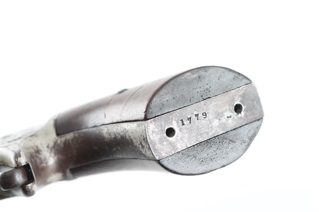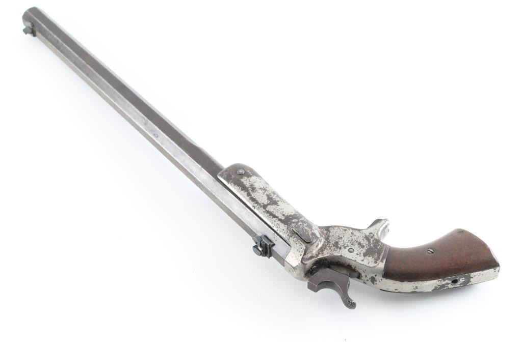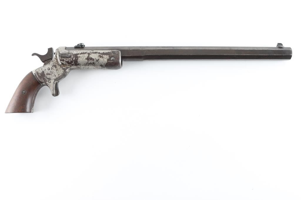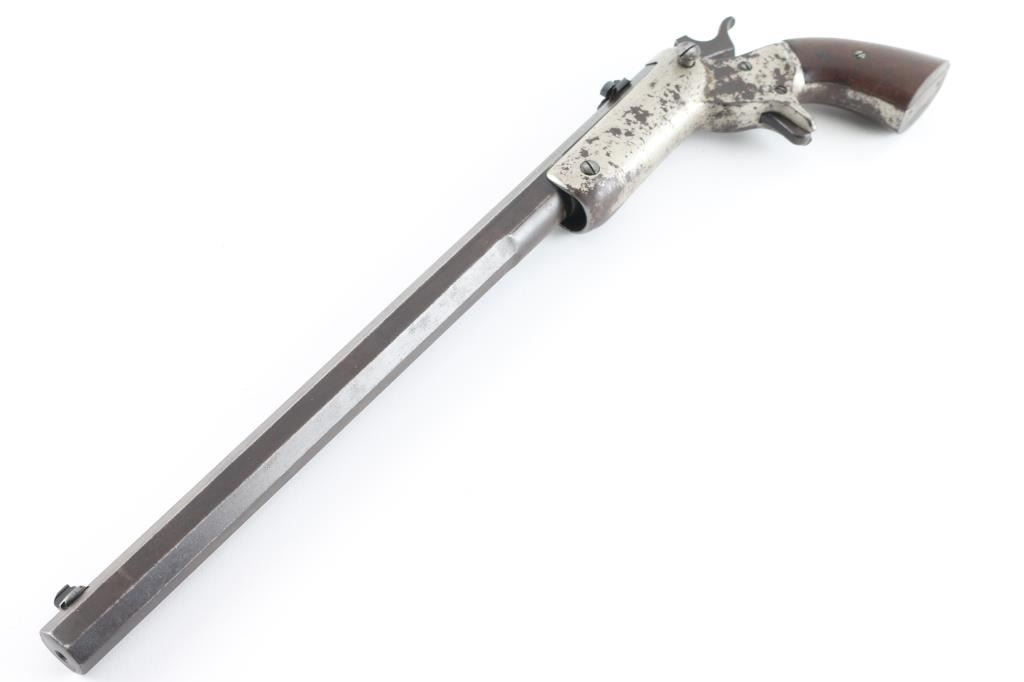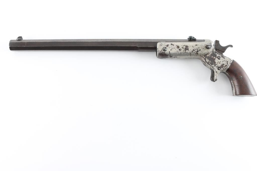 SN: 1779 Antique American made single shot rimfire pistol manufactured circa 1872-1900. This earlier numbered example has the early single line barrel address. Features a blued 14.5" part octagon/part round tip-up barrel, automatic extractor, dovetailed blade front sight, folding adjustable rear sight (appears to be a later replacement), smooth spur trigger, knurled hammer spur, nickel plated iron frame, and two-piece smooth walnut grips. Matching serial numbers are found on the barrel & frame, as well as in pencil under the left grip panel. Bore is fair, showing light pitting throughout, fair continuous rifling. Blued parts show a deep brown color, with majority coverage, some mottled grays, edge losses throughout. Frame retains 50% nickel, now a dull silver color, with much brown patina. Grips are very good, showing small dents. Action is smooth. Some light denting to chamber from firing pin strikes. Condition is NRA Very Good *** Antique Firearm ***