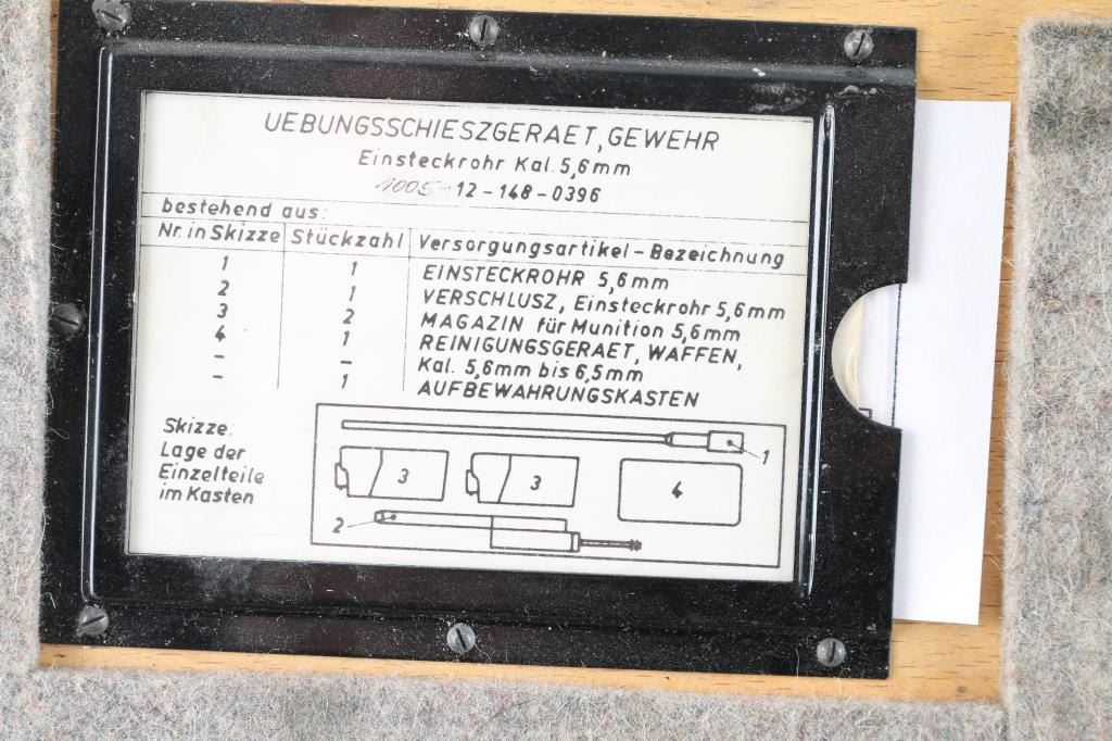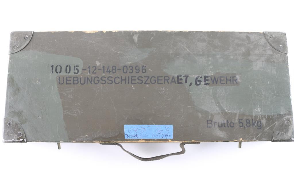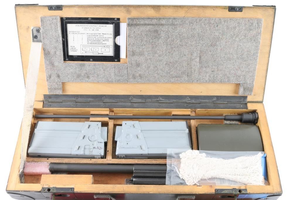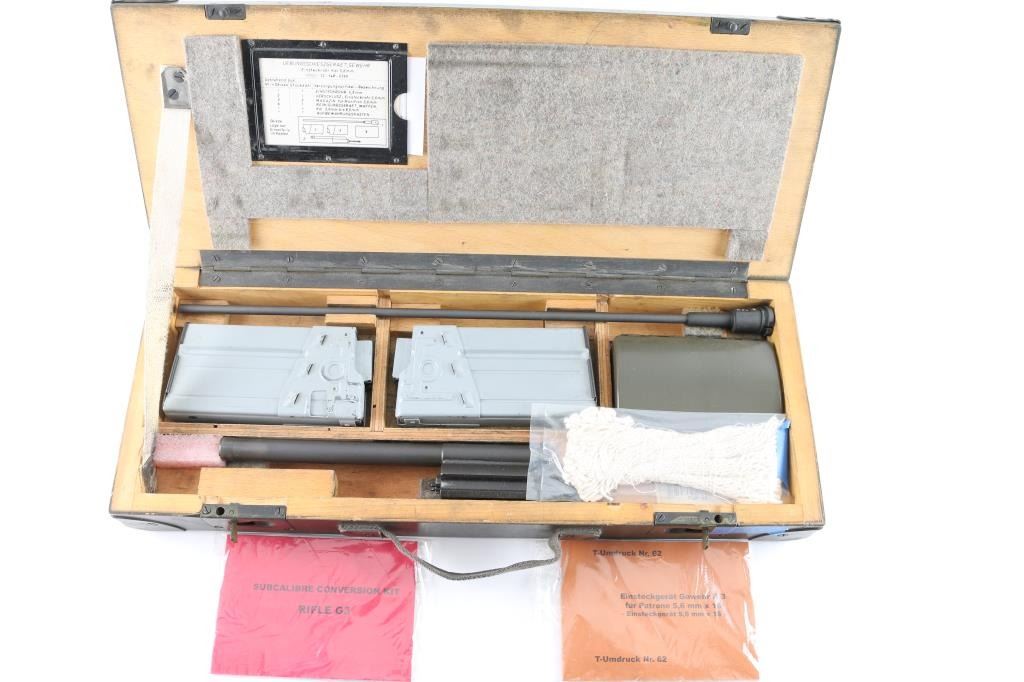 Vintage (1970's) German Military issued . 22 Cal conversion kit for the HK G31, PTR-91 HK 91 rifles. Used to teach the basics of marksmanship. Comes in the original 20x10x4" wooden box and includes two 10 rd .22 magazines, conversion bolt and barrel, tube, and cleaning kit. Manuals in both English, and German are included. Reduces recoil, and an inexpensive way to shoot. Very good condition. Barrel appears straight, with no observed bands or kinks or dents. Bore is very good condition.