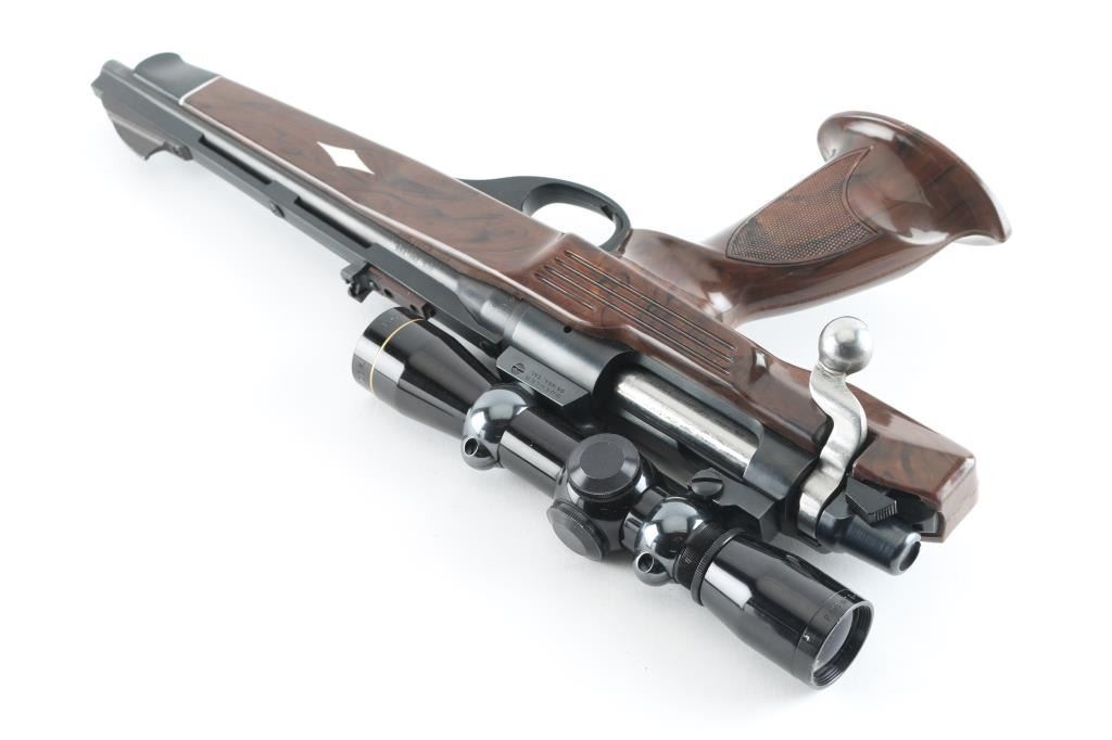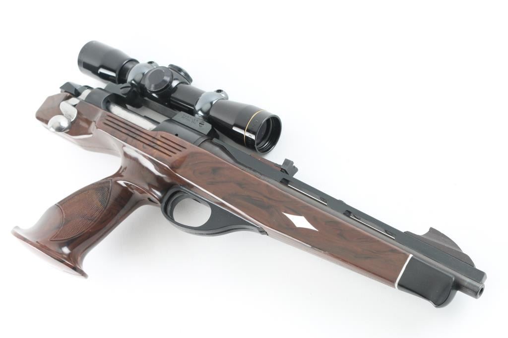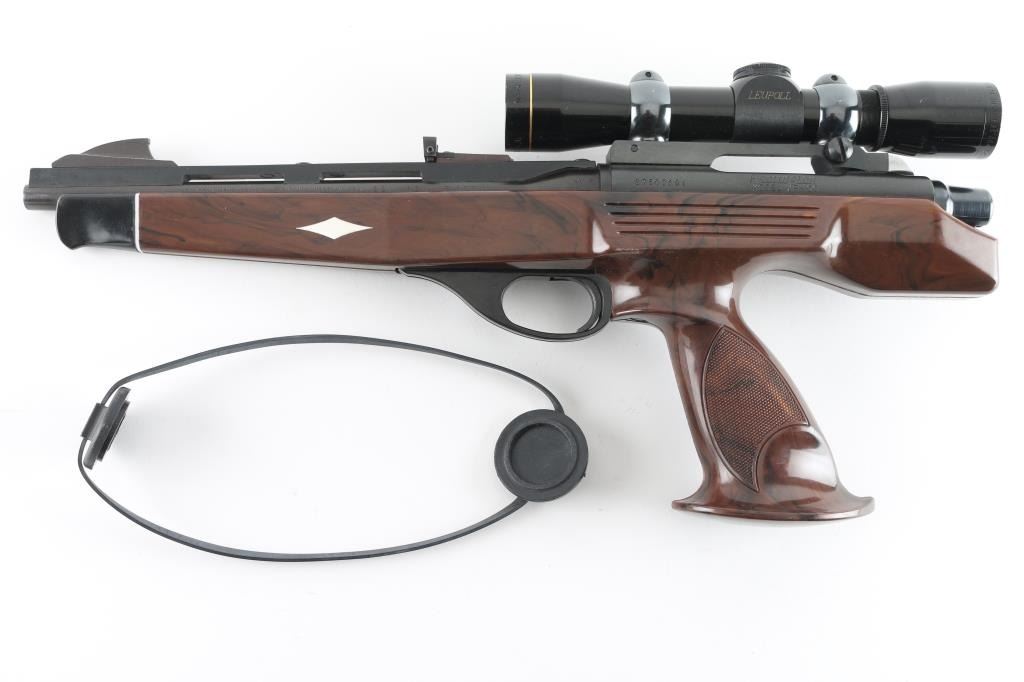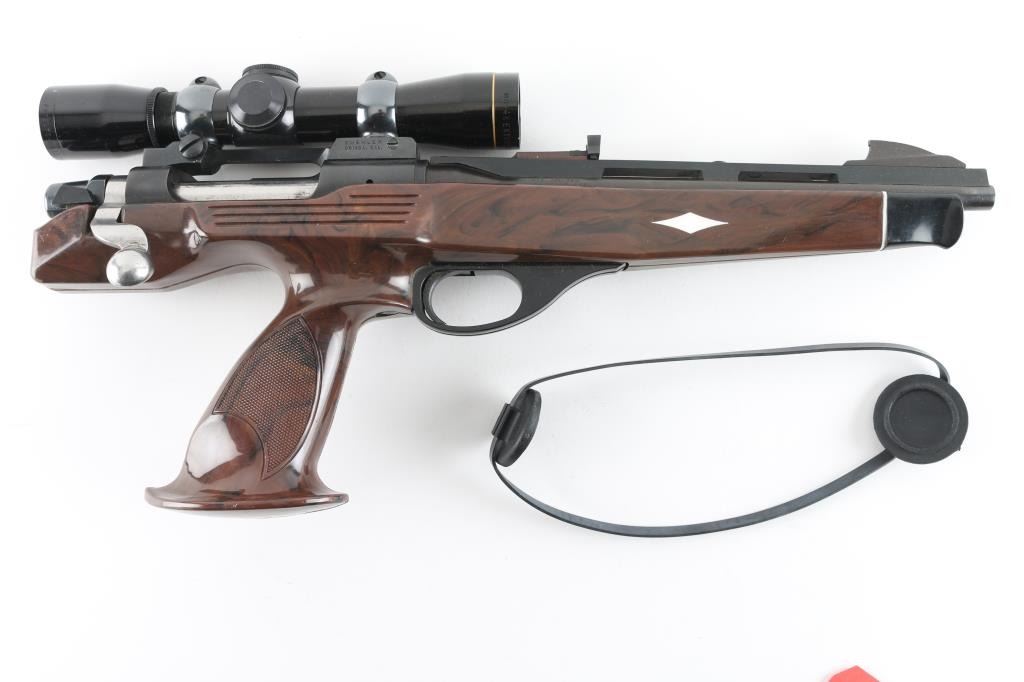 Single-shot bolt action pistol chambered in .221 Remington Fireball, circa 1978. Features a blued finish, 10.75" vent ribbed barrel, blade front sight, adjustable rear window sight (mounted backwards to allow scope mounting), serrated trigger, manual safety, dogleg bolt handle, drilled & tapped receiver, Buehler base and rings with Leupold M8 4x Extended Eye Relief scope, and a faux wood nylon stock. Bore is very good. Retains 95% finish with edge losses & handling marks. Stock is very good with few minor blemishes. Scope is very good condition with clear view, duplex reticle. Condition is NRA Excellent ***Modern Firearm***