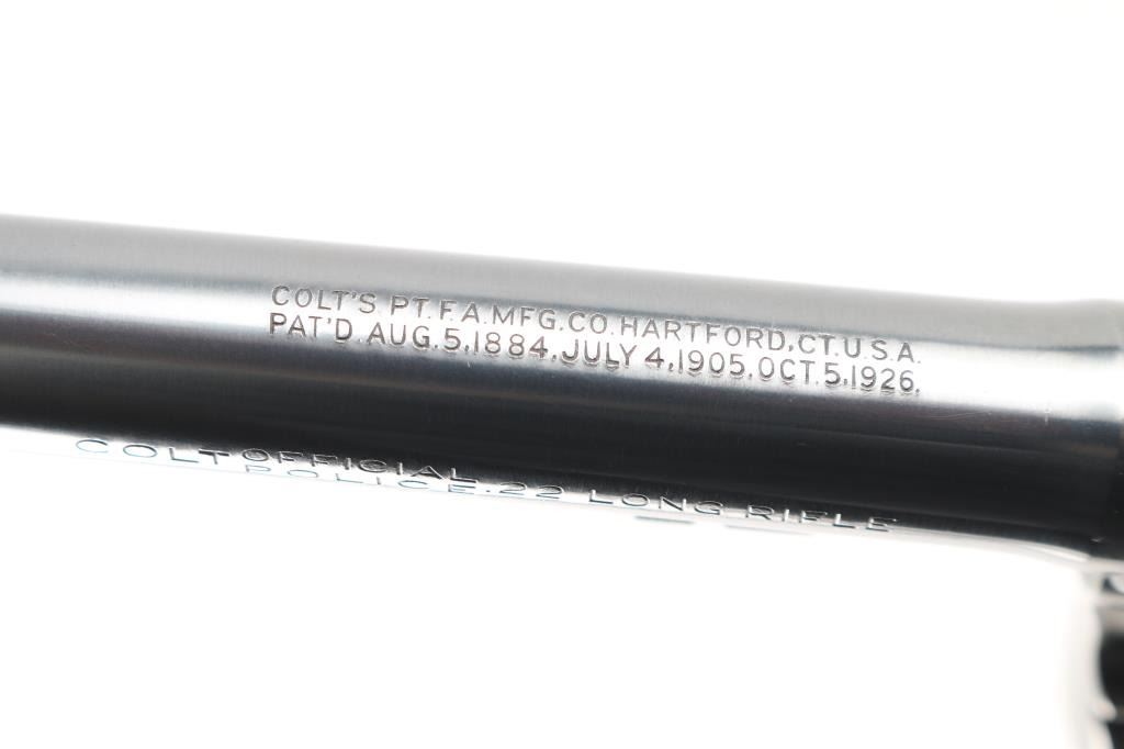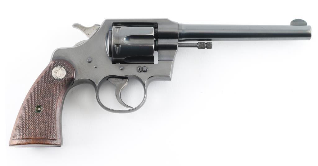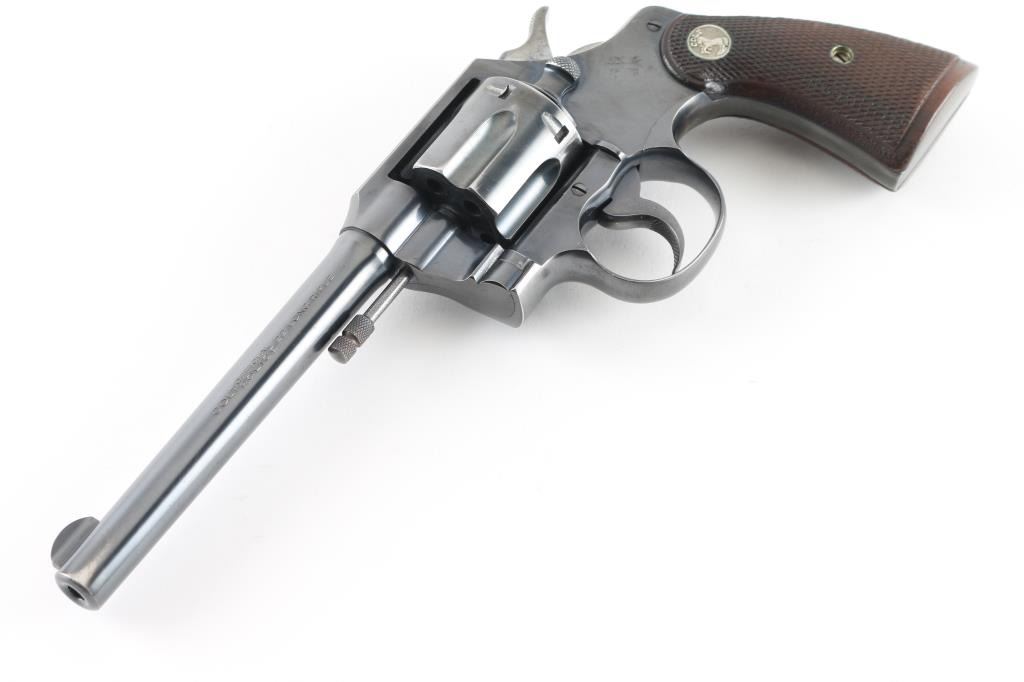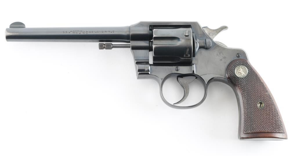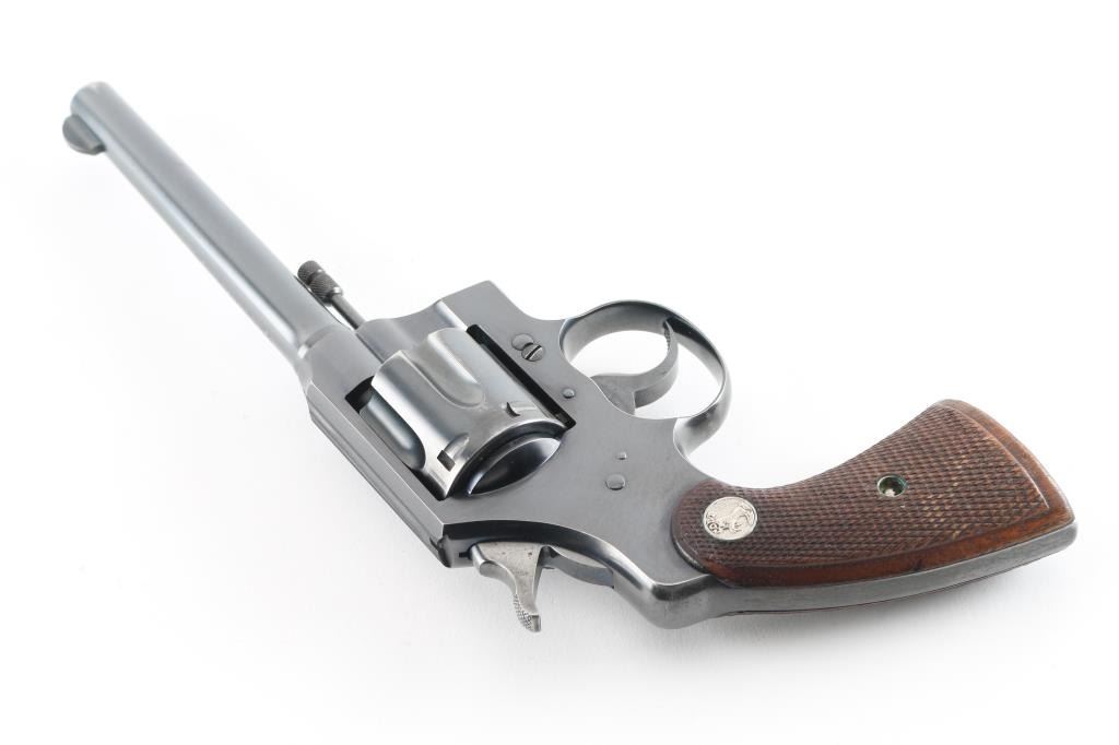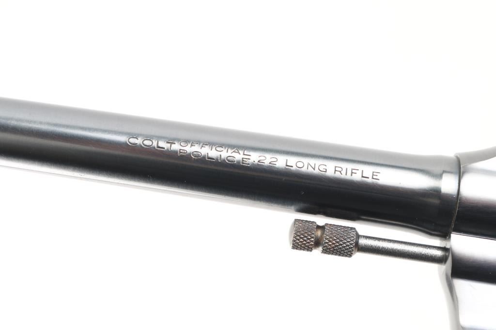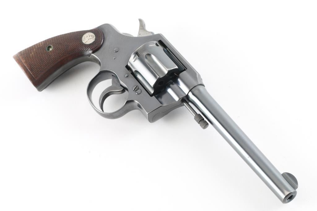 Vintage double action medium frame rimfire revolver chambered in .22 Long Rifle, manufactured in Hartford, CT circa 1940. Features a blued refinish, 6" barrel, round blade front sight, square notched rear sight, fluted six-shot swing-out cylinder, non-shrouded ejector rod, knurled trigger, knurled hammer spur, square butt frame and two-piece checkered walnut grips with Colt medallions. Matching serial numbers are found on the frame and crane. Bore is very good. Retains 85% finish with edge losses, cylinder drag line, color fading to gray on back strap. Polished hammer sides show some darkening. Grips are very good condition with several small dents. Action is smooth with tight lock-up. Condition is NRA Very Good+ *** C&R Firearm ***