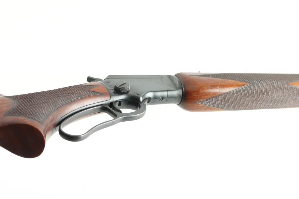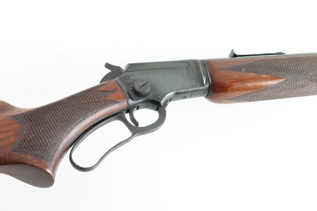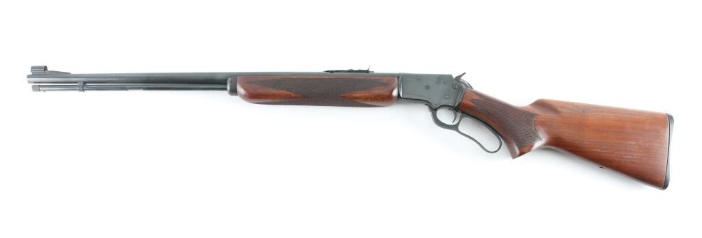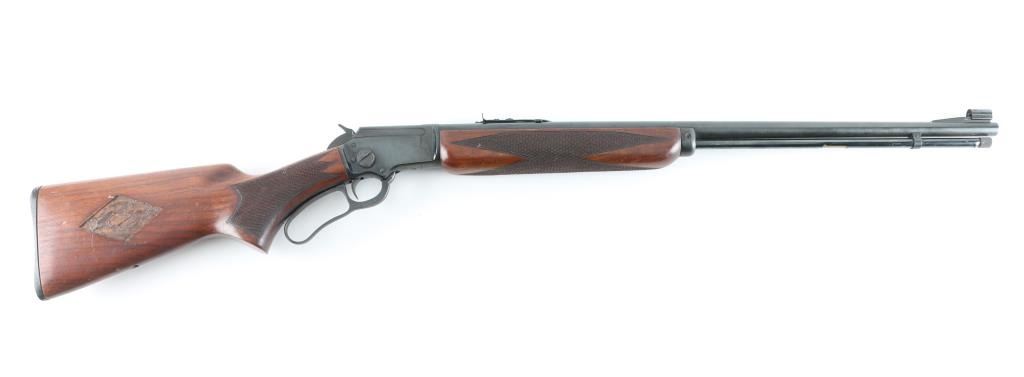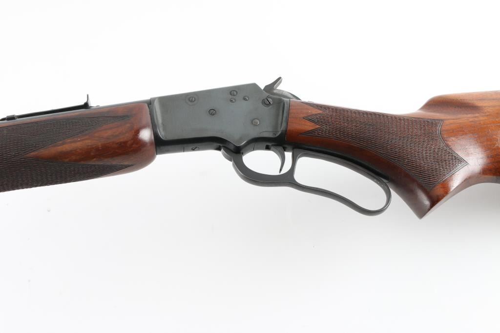 "J" Series - takedown lever action rimfire rifle manufactured circa 1952. Features 24" round barrel (pre-micro groove), full length magazine tube, hooded post/bead front sight, sporting rear sight, curved grip, black plastic buttplate, blued steel forend cap, "bull's eye" in stock toe missing. Large knurled screw on right receiver for take-down. Top of receiver drilled/tapped for optics. Bore is very good condition, needs cleaning. Retains 95% blued finish with handling marks, minor scratches on the barrel, and lever, there is a small area of rust on the forearm cap.. Smooth walnut stock is very good condition with minor dents & other blemishes, a 3.5" diamond shaped inlet is cut into the right buttstock . Markings are crisp. Action is smooth. Condition is near NRA Very Good. C&R Firearm