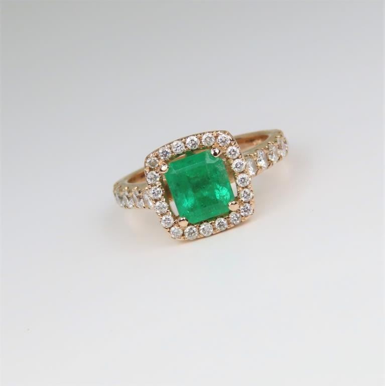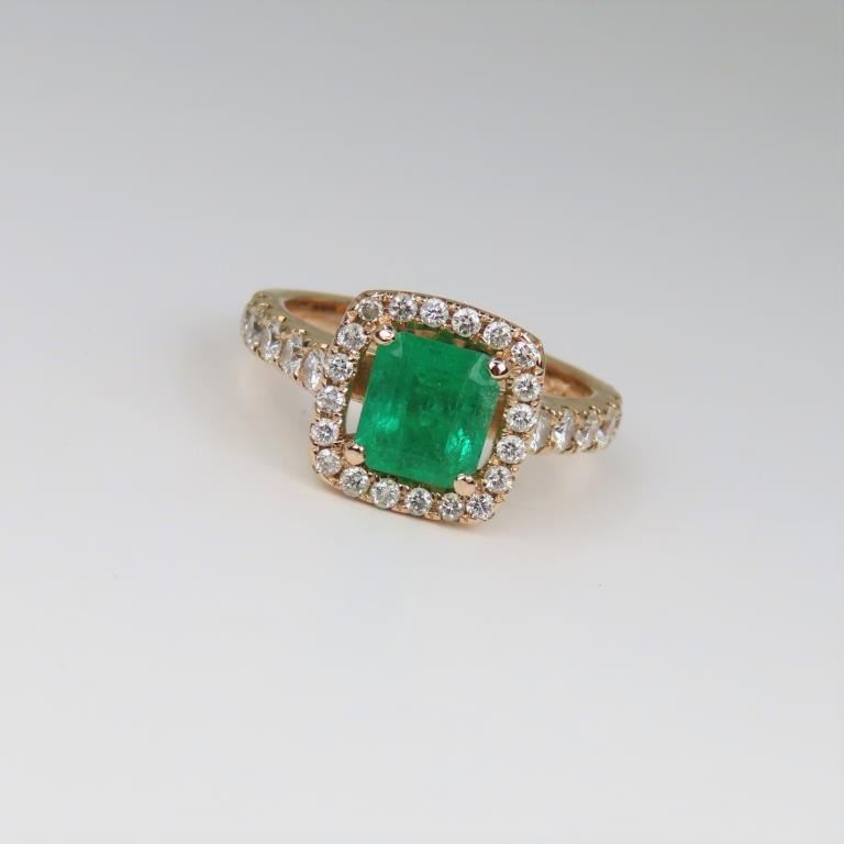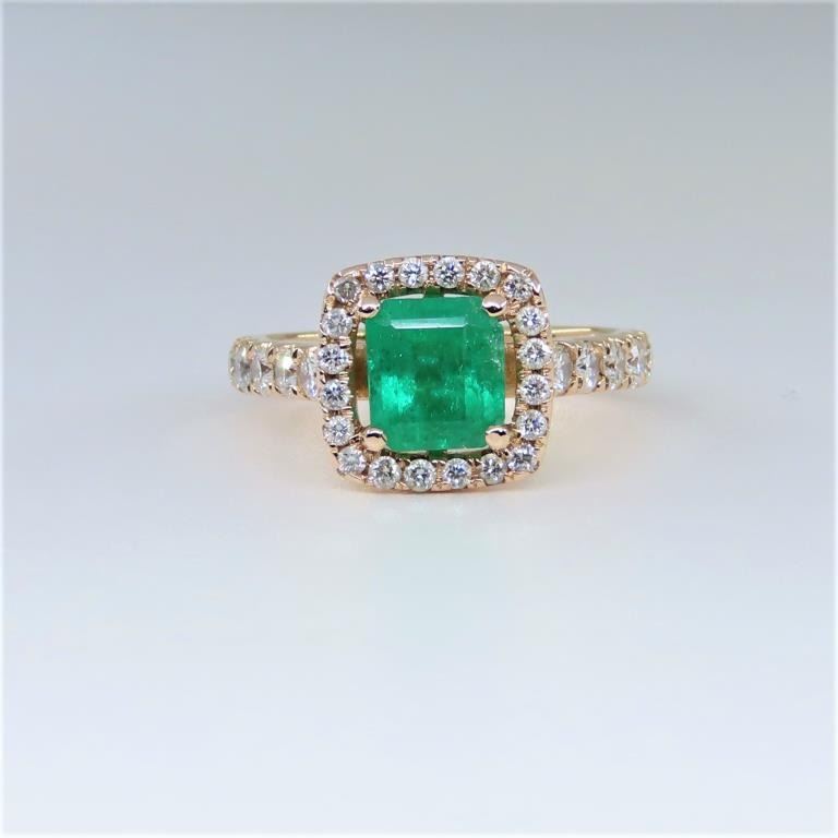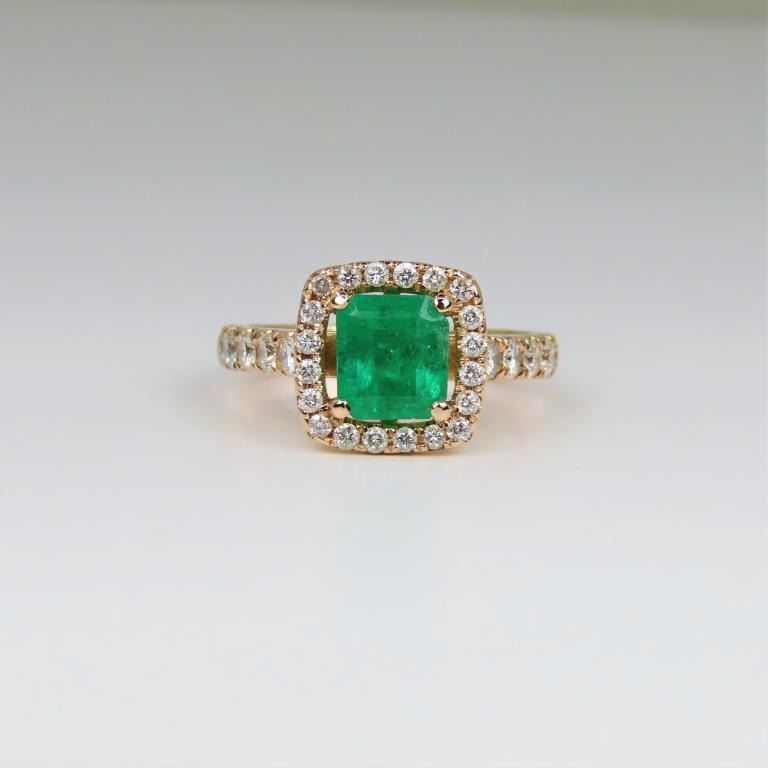 featuring a rich vivid green cushion cut Emerald weighing approx. 1.50 carats studded with 28 ‘IDEAL’ cut Diamonds weighing approx. 1.00 carat with F-G color and VS clarity set a 14 karat Rose Gold setting. Retail $5,000-$6,000