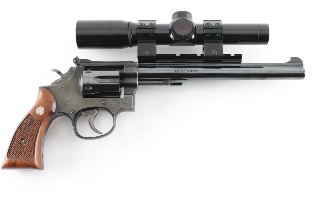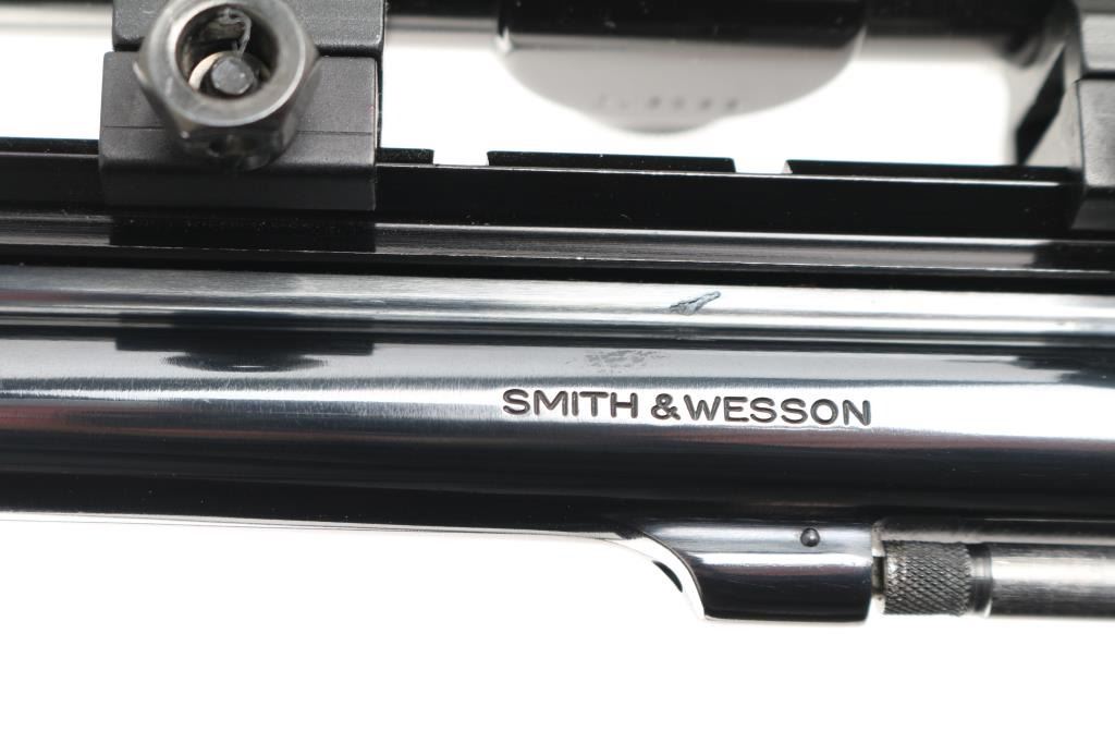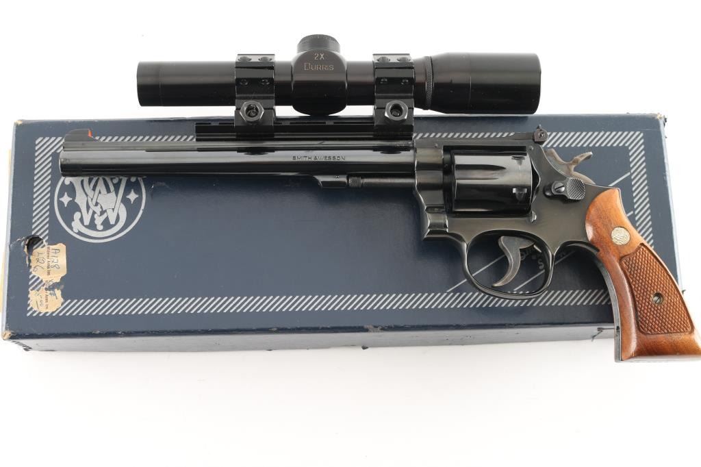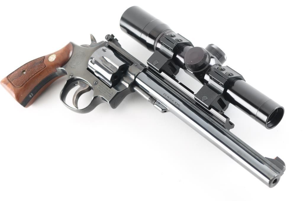 Double/single action rimfire revolver features blued finish, checkered wood "magna" style grips with S&W medallions, 8-3/8" barrel, adjustable sights, Weaver type rail mounted to top of barrel, 6 shot cylinder, narrow groove case colored trigger, checkered medium width spur case color hammer. Bore and charge holes are excellent. Retains 95% blue with some thinning or bare metal at drag line, near muzzle, sharp edges, ejector rod. Grips are excellent. Action is smooth with tight lock-up. Mounts a very good condition Burris 2x long eye relief scope with duplex reticle, clear view. Includes fair condition S&W silver & blue cardboard box. Condition is NRA Excellent *** Modern Firearm ***