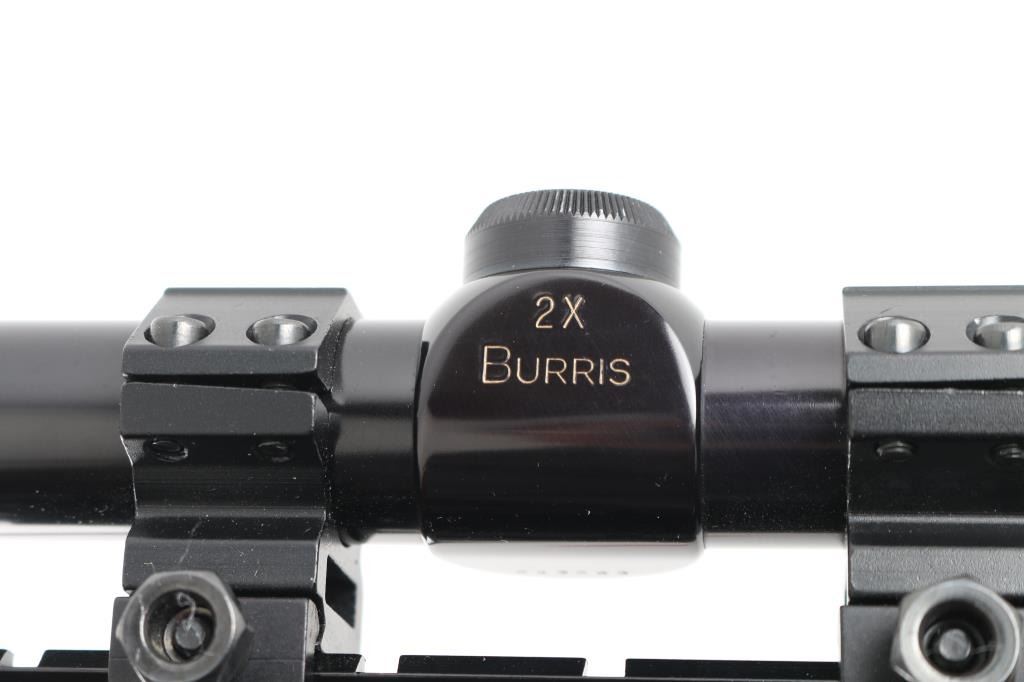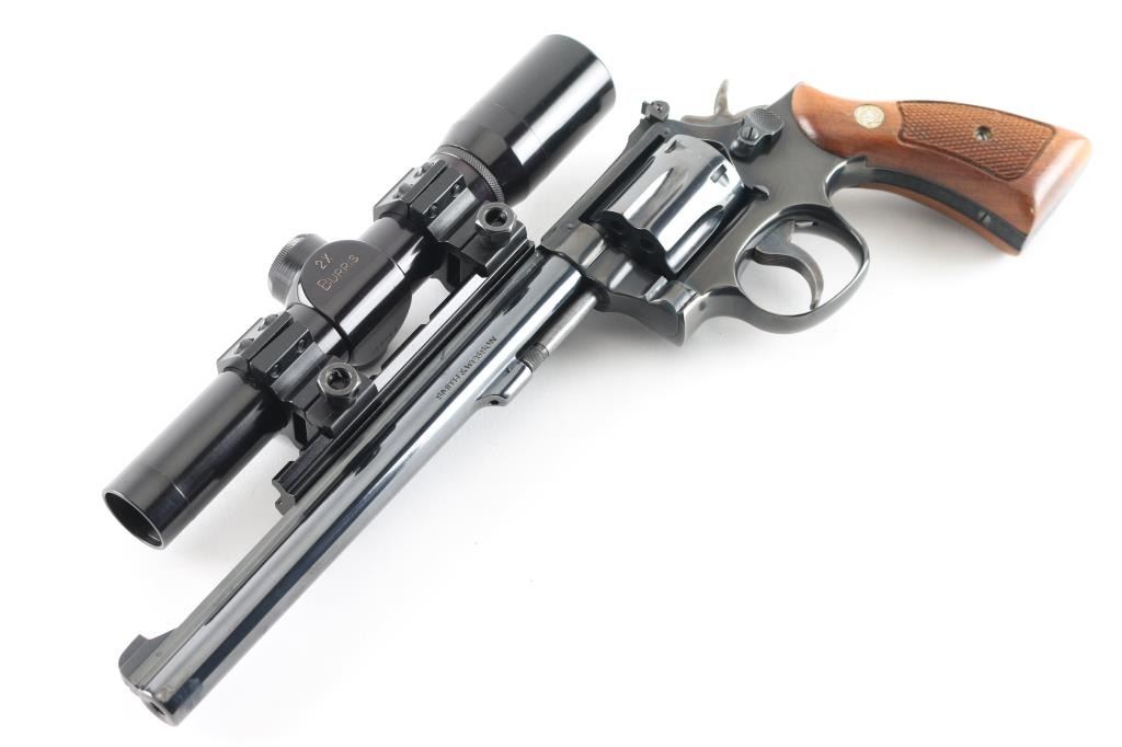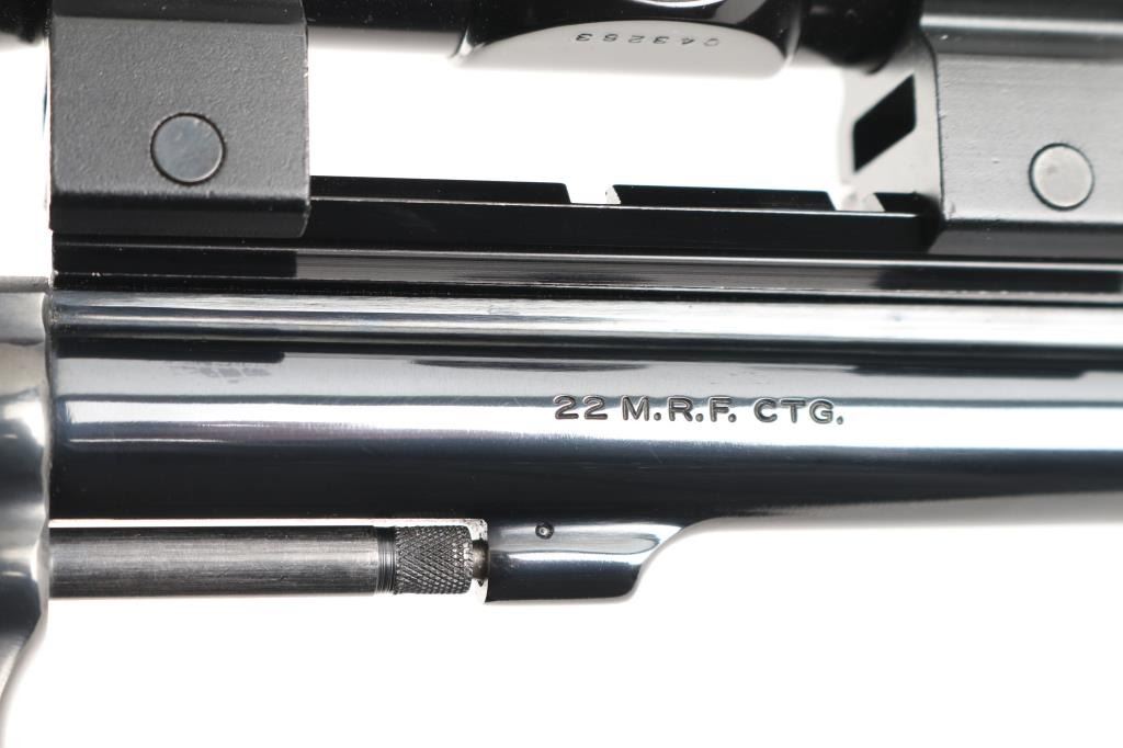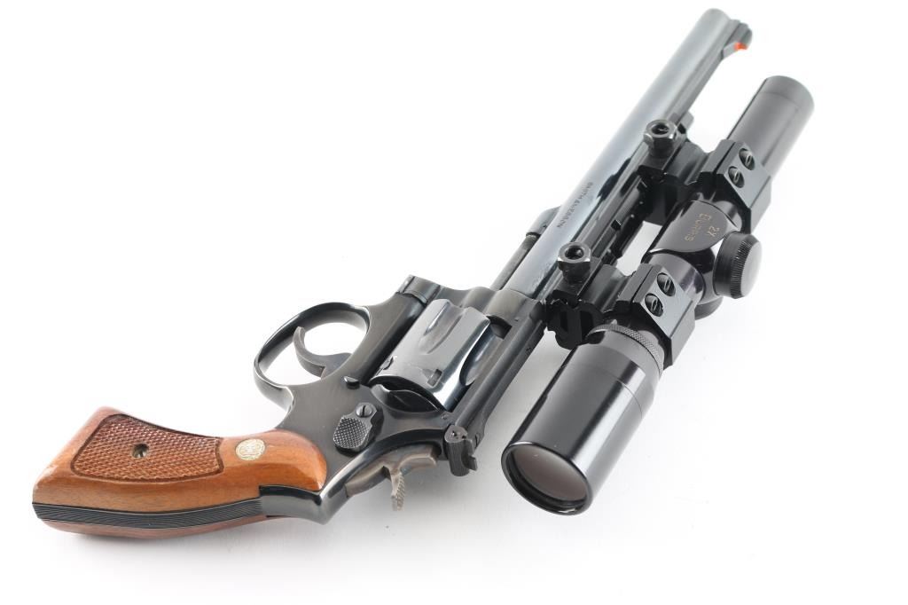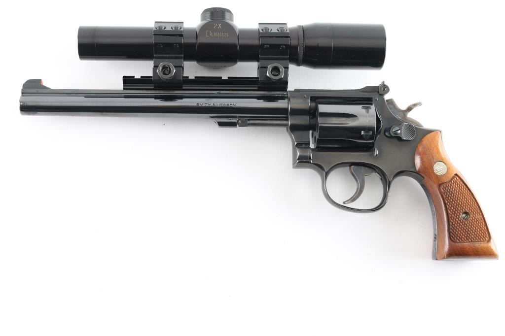 Double/single action rimfire revolver features blued finish, checkered wood "magna" style grips with S&W medallions, 8-3/8" barrel, adjustable sights, Weaver type rail mounted to top of barrel, 6 shot cylinder, narrow groove case colored trigger, checkered medium width spur case color hammer. Bore and charge holes are excellent. Retains 95% blue with some thinning or bare metal at drag line, near muzzle, sharp edges, ejector rod. Grips are excellent. Action is smooth with tight lock-up. Mounts a very good condition Burris 2x long eye relief scope with duplex reticle, clear view. Includes fair condition S&W silver & blue cardboard box. Condition is NRA Excellent *** Modern Firearm ***