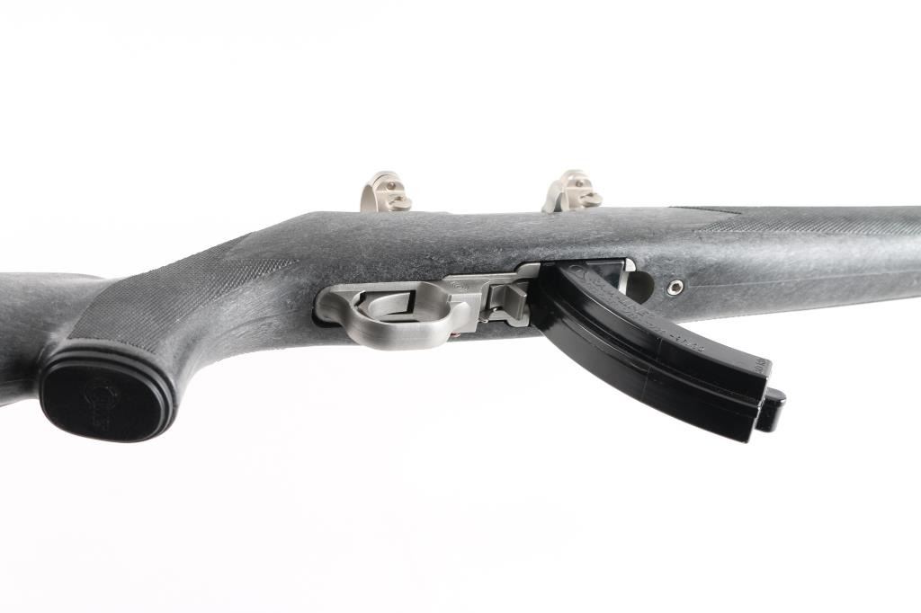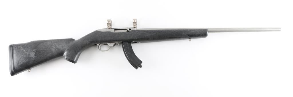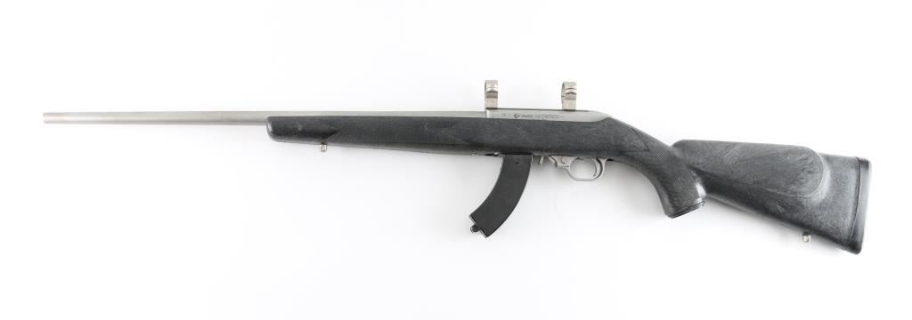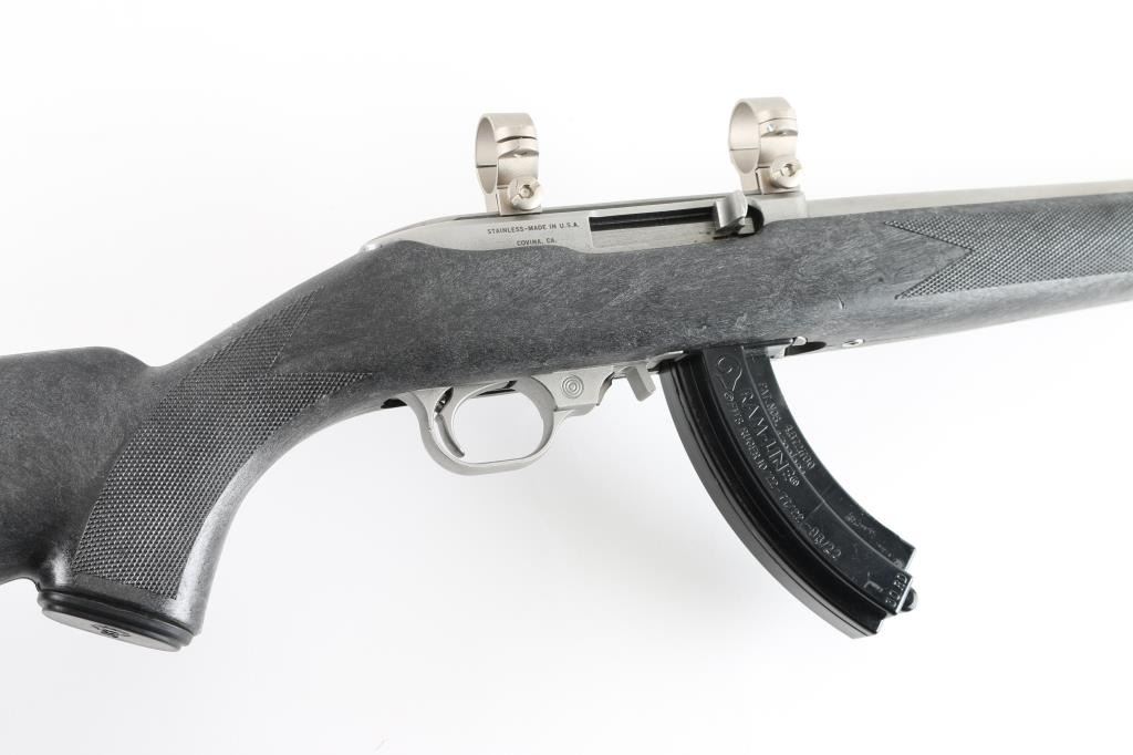 Based on the Ruger 10/22. American made semiautomatic rifle. (1984-1994) Blow-back action. Stainless steel construction. 22" tapered barrel with no provisions for sights. Black nylon stock with checkered panels, factory buttplate, and sling swivel studs. push button safety. 1" scope rings mounted on receiver. Metal, and stock are excellent, bore appears excellent, needs cleaning. Comes with one Ram-line 30 rd magazine that will fit the 10/22. NRA Condition-Excellent. Modern Firearm.