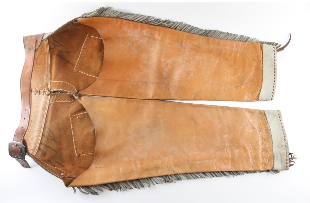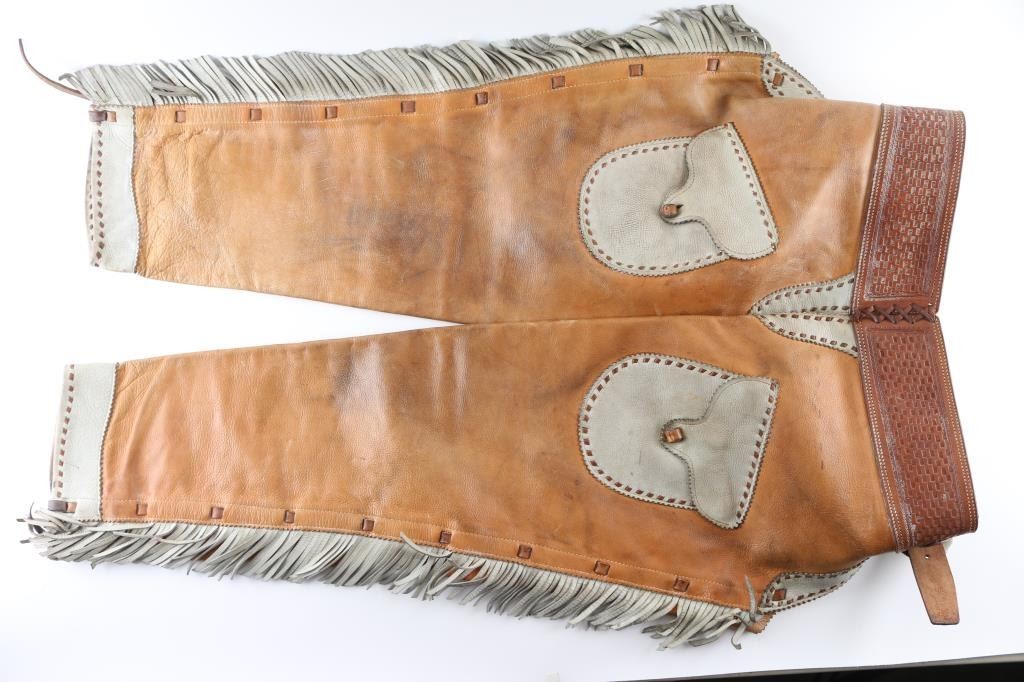 With basket weave tooled belt and two fringed . Colored in rodeo style finish to leather. Marked "30" on belt, "36" from belt to cuff. "11.5" at widest part of thigh to leg. 1940's-1950's