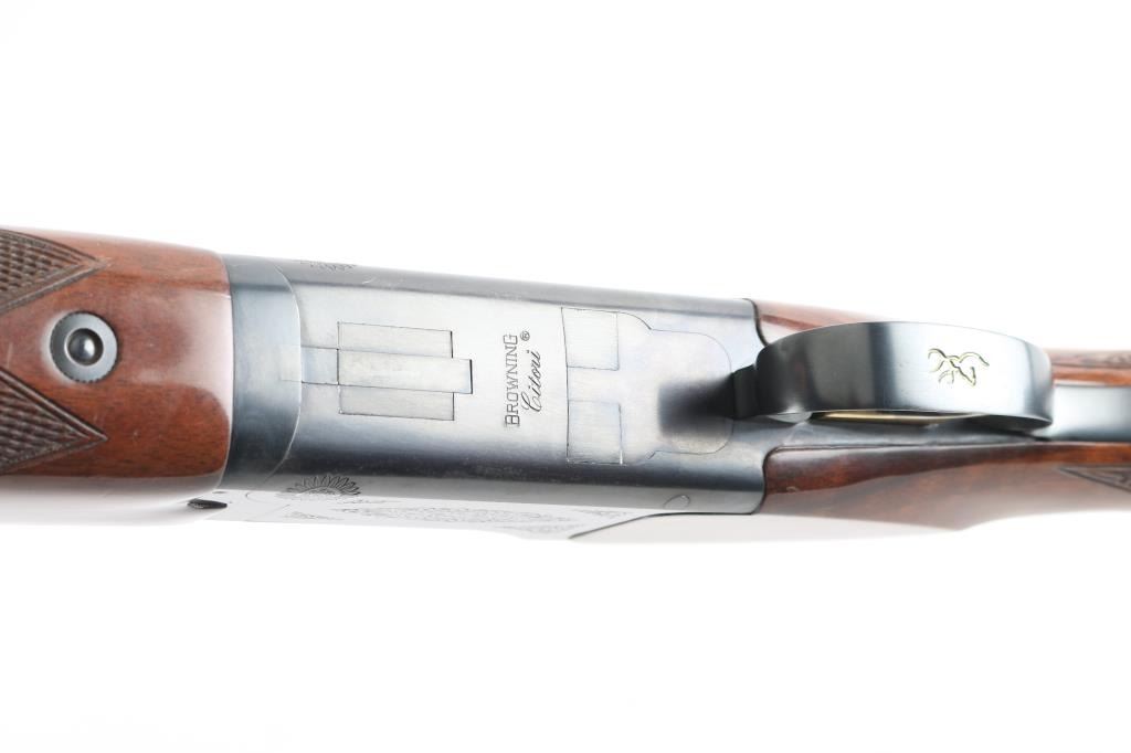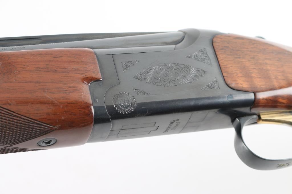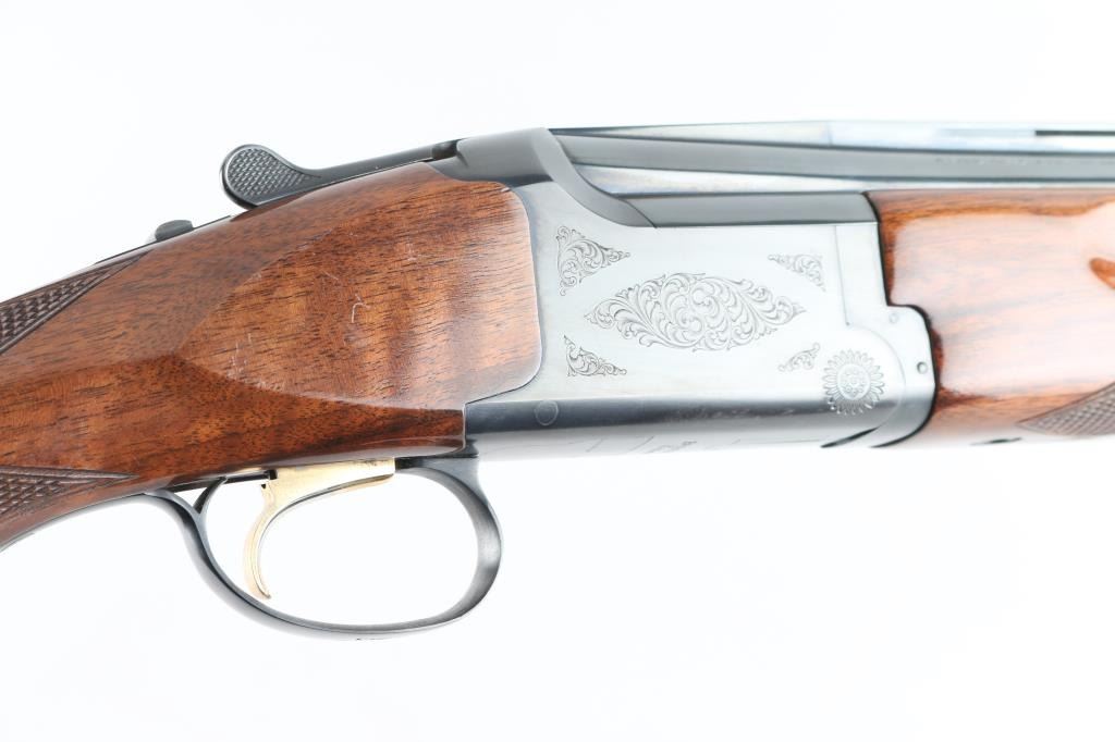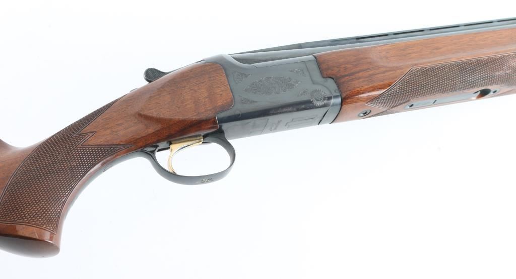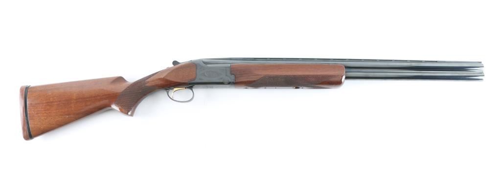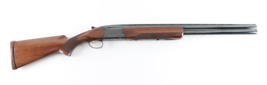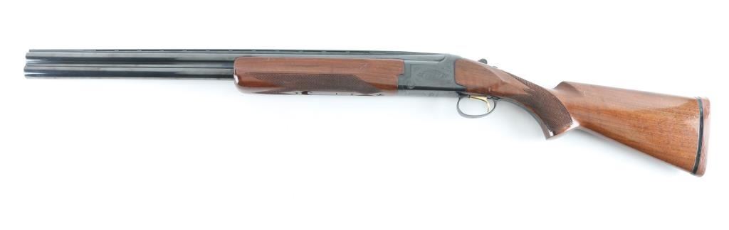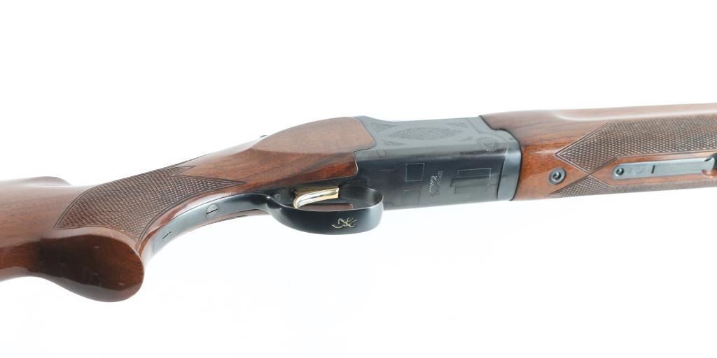 Over/Under shotgun made in Japan for Browning Arms Co, Morgan UT, circa 1986. Accepts up to 3" shells. Features high polished blue finish, limited scroll engraving on receiver, urethane finished walnut furniture, checkering at wrist & forend, 26" vent rib barrel, Invector choke tubes (IC over SKT installed), steel bead front sight, solid rubber recoil pad, selective ejectors. Single inertia trigger is selectable at tang safety. Approx 14" LOP, 1-1/2" Drop at Comb, 2-1/4" Drop at Heel. Bore is very good condition. Metal retains 95% blued finish with minor edge losses & handling marks. Gold accent trigger shows rubbing wear to face. Wood is very good condition with scratches & small dents. "Kickeez" recoil pad is good condition, fit to butt is fair. Barrel & forend hanger numbered to receiver. Condition is NRA Very Good++ *** Modern Firearm ***