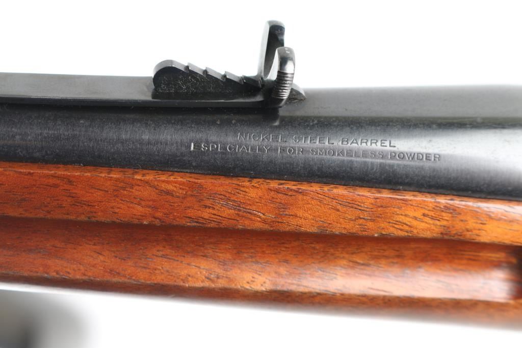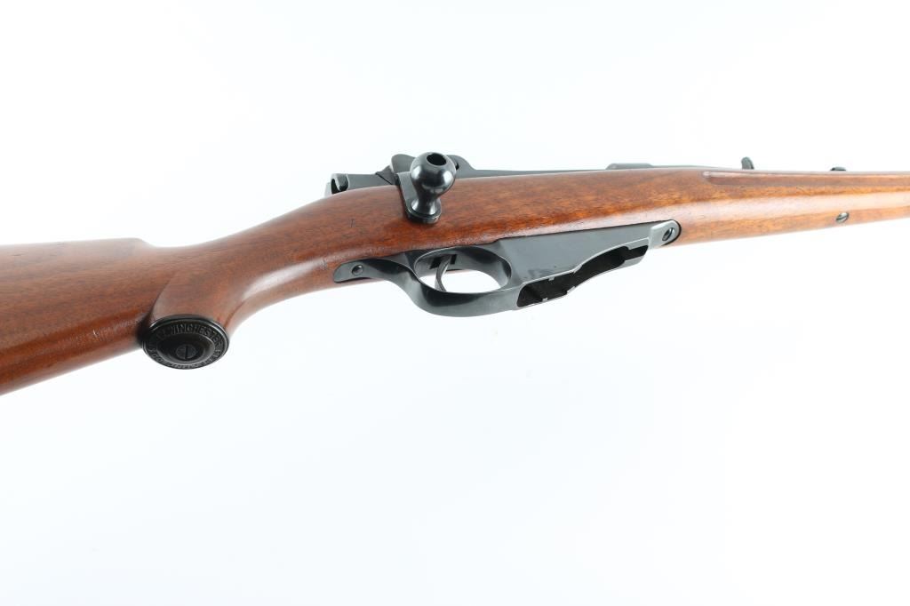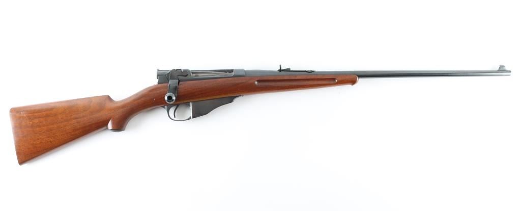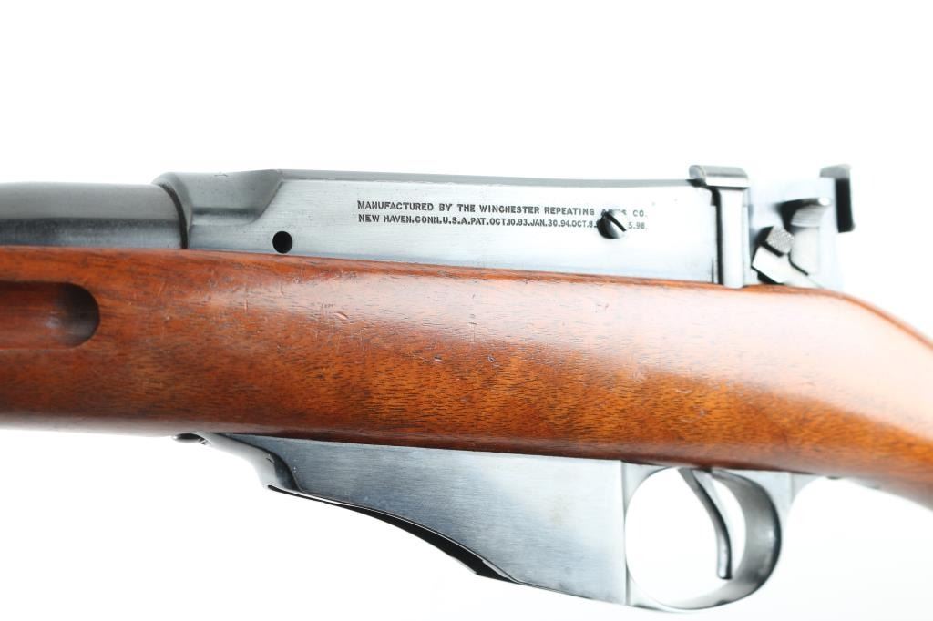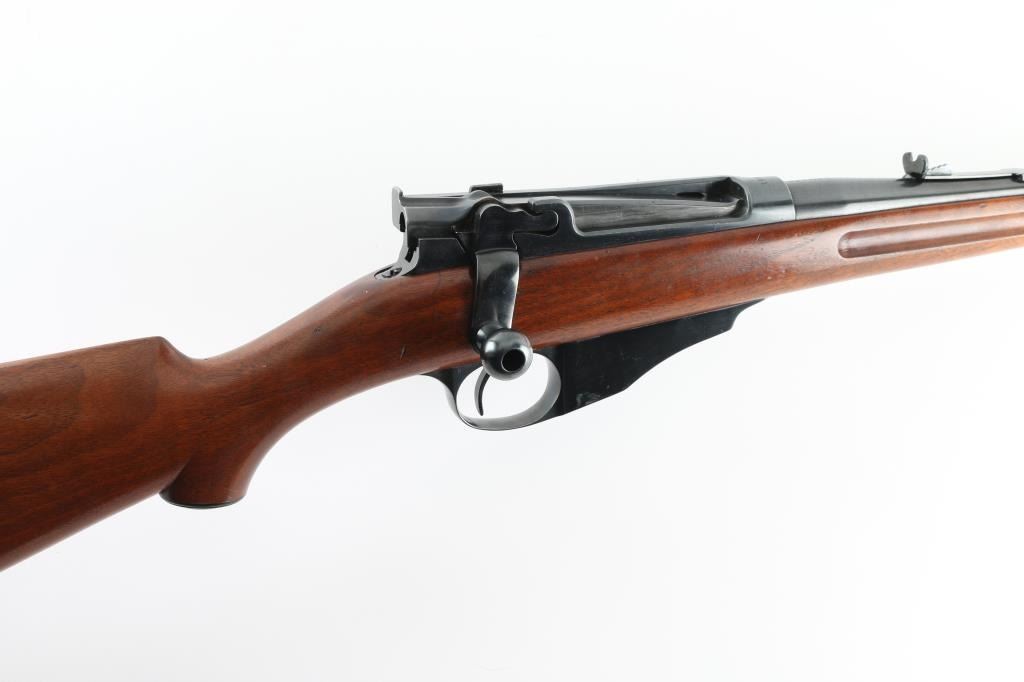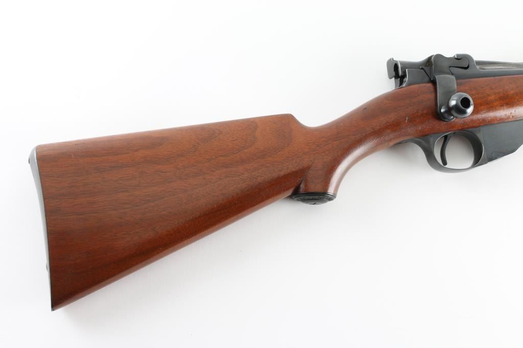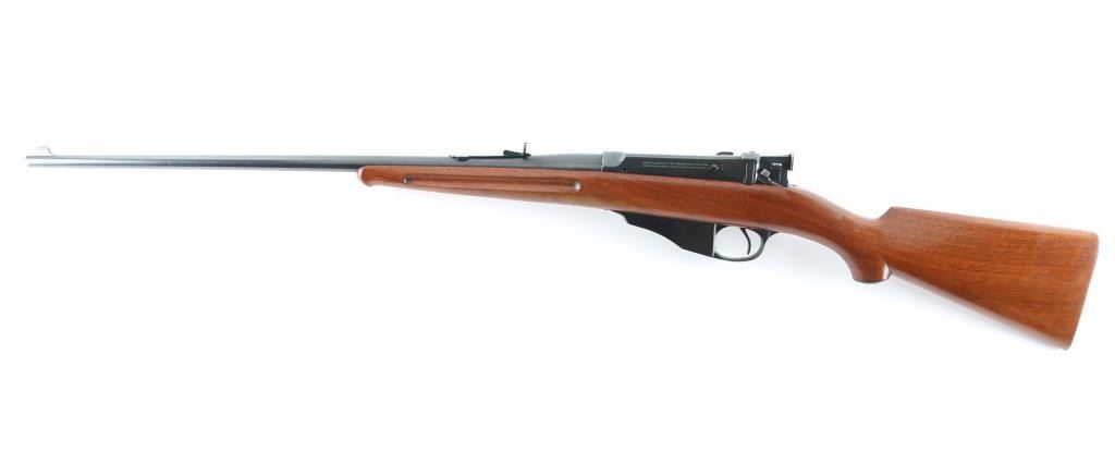 Vintage straight pull bolt action sporting rifle manufactured circa 1901. Features high polish blued finish, smooth walnut stock (grasping grooves, schnabel tip, curved grip), 24" tapered barrel, blade front & sporting rear sights, uses en-block Mannlicher style packet clips (not provided), factory gutta percha grip cap, smooth metal buttplate. Screw in left side of receiver covers portion of patent line markings. Bore is good or better, frosted, strong rifling. Metal retains 90% deep blued finish, with edge losses & handling marks, blemish on right side of magazine. Buttplate has faded to gray color. Markings are crisp. Wood is very good to excellent with few dings & scratches. Finger grasping grooves have crisp edges. Appears reblued - due to small pits in various places on receiver under the finish. Condition is near NRA Excellent (reblued) *** C&R Firearm ***