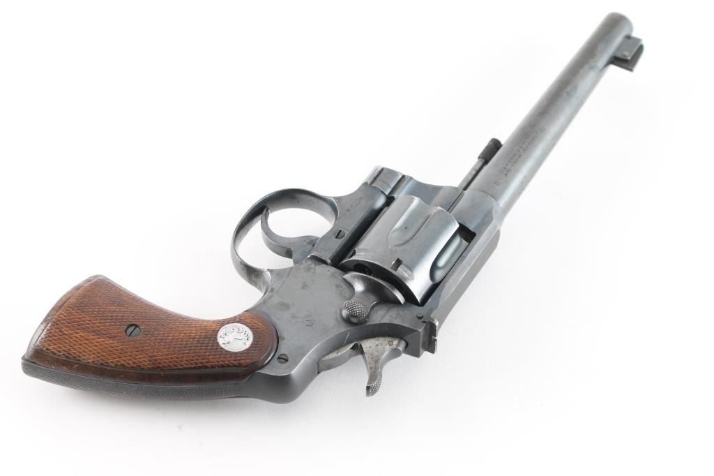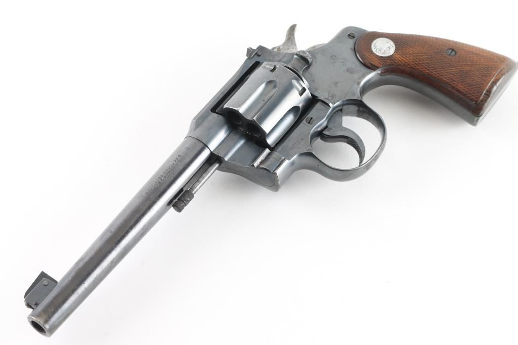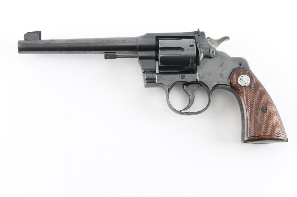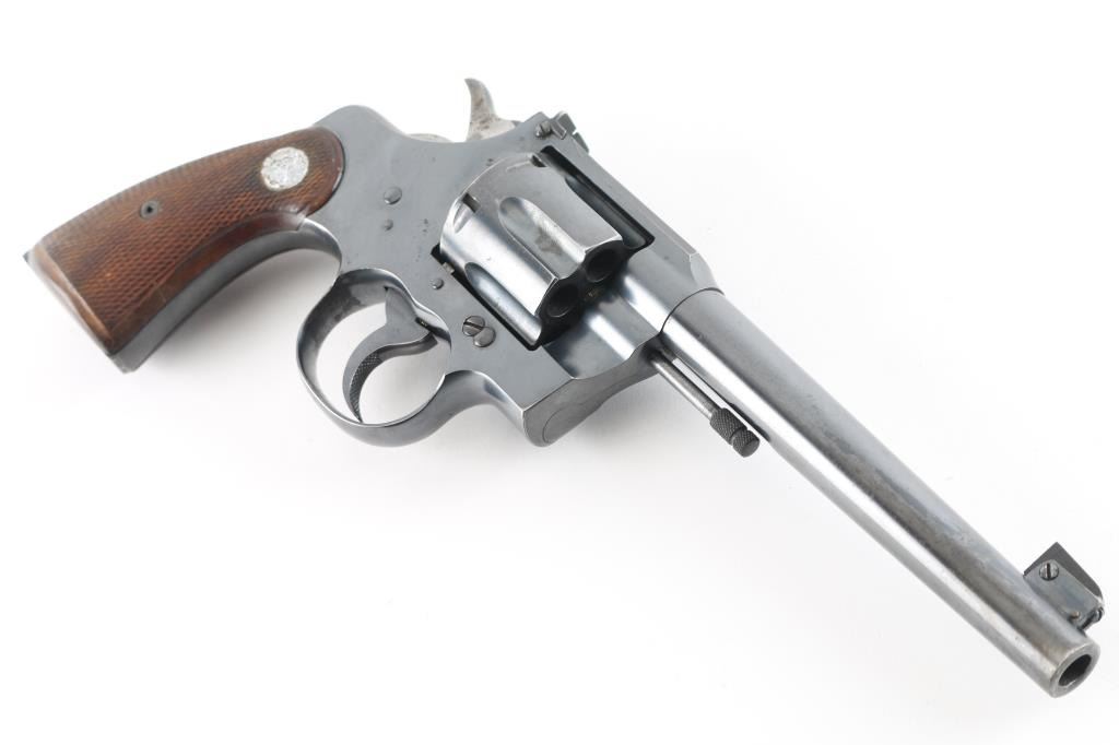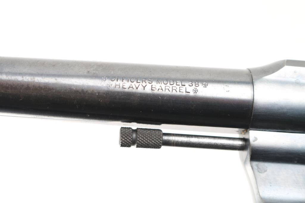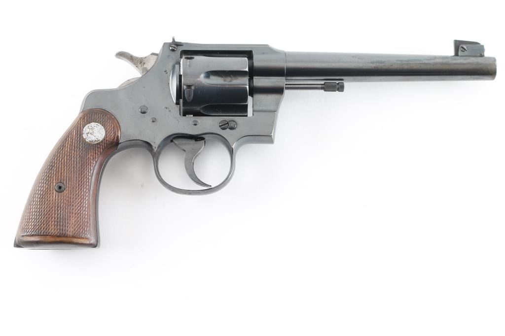 'Heavy Barrel' target revolver built on the Official Police frame, circa 1937. Features blued finish, checkered walnut grips with Colt medallions, 6" heavy barrel, adjustable sights with Partridge front & notch rear, flat top frame, 6 shot fluted cylinder. Bore is very good condition. Retains 80% blue, appears original with crisp markings, showing edge losses and handling marks. Patina on sides of hammer, and on triggerguard bow. Action is smooth with tight lock-up. Grips are very good, show shrinkage at corners of butt. Condition is NRA Very Good *** C&R Firearm ***