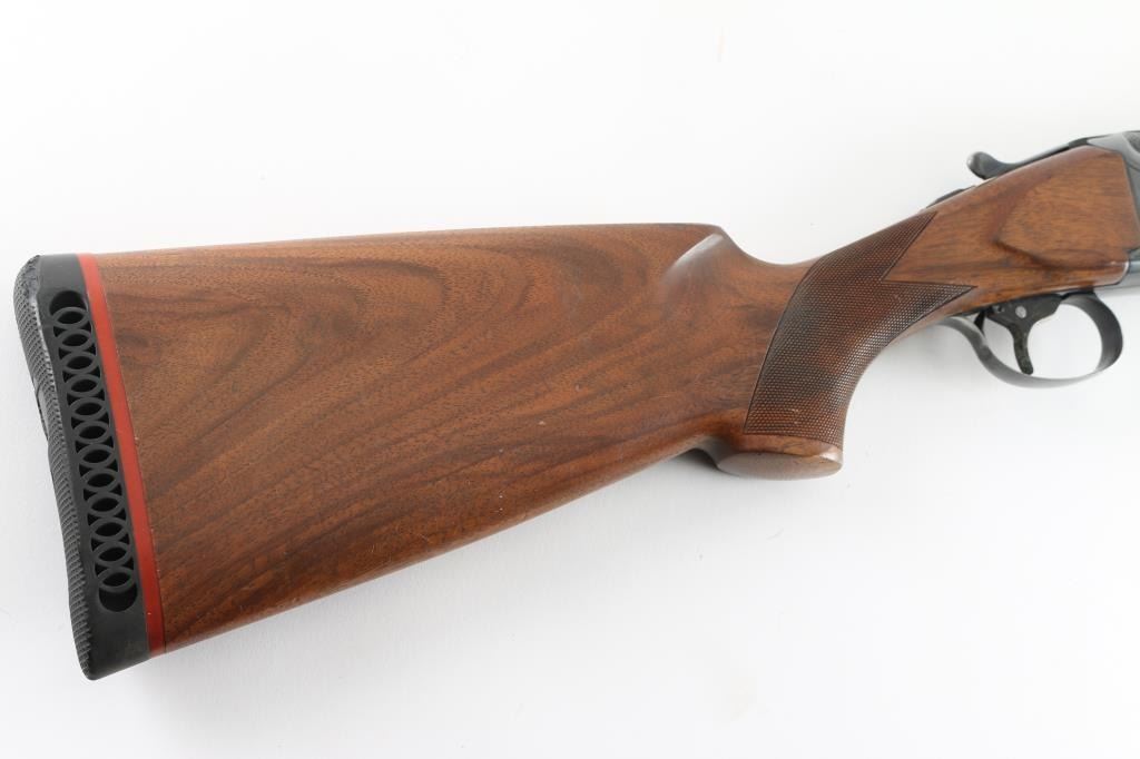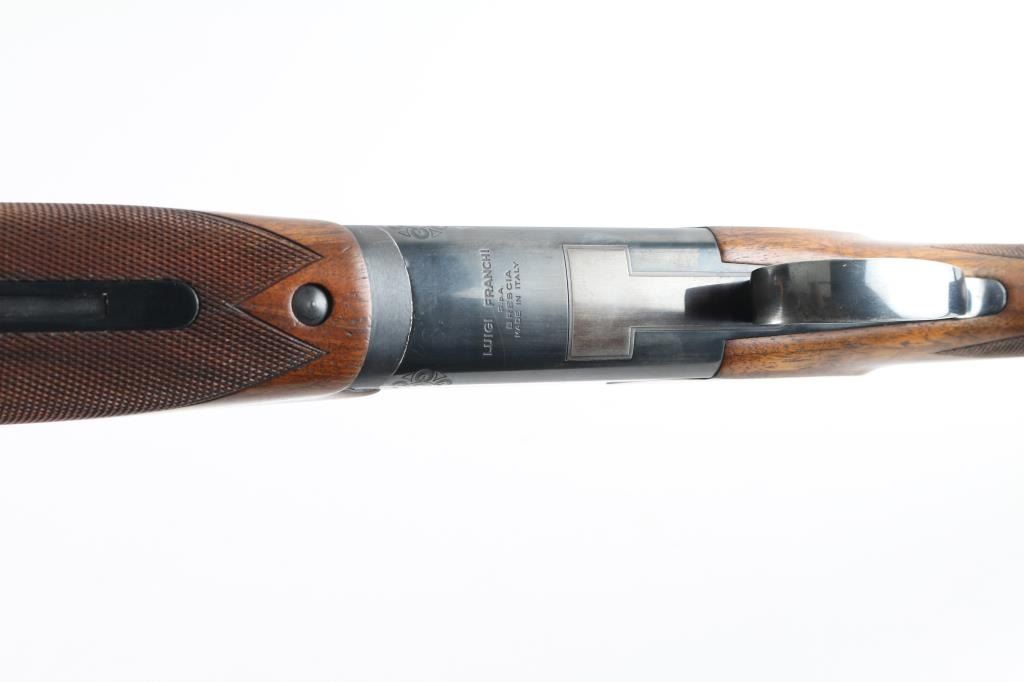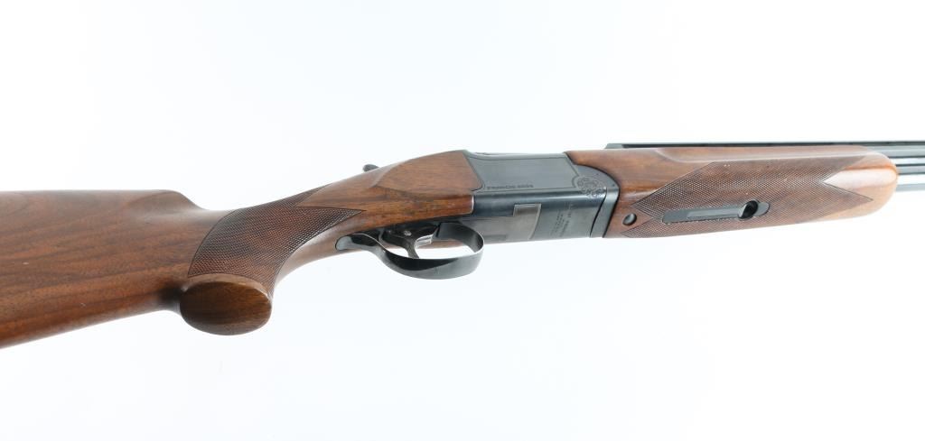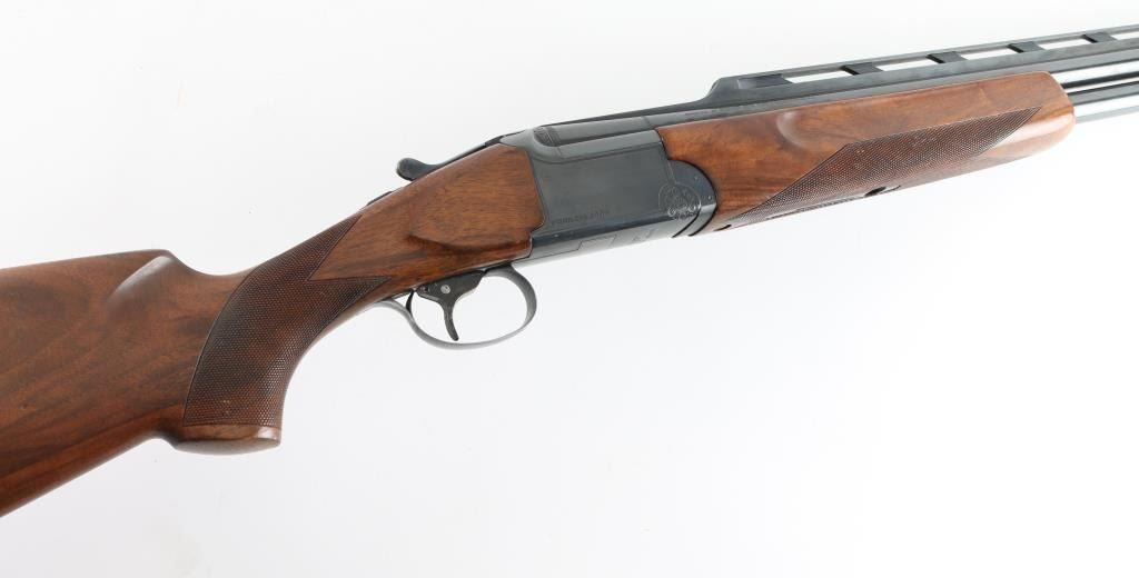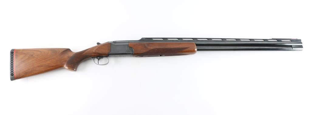 Italian Over / Under shotgun manufactured circa 1983. Takes 2-3/4" shells. Features blued finish, checkered walnut stock and forend, ventilated rubber recoil pad, 32" barrels with high vent rib, fiber optic insert front sight, steel mid bead, fixed chokes (measure Full), single trigger with barrel selector cross-button, sliding tang safety, extractors. Receiver is rather plain with limited engraved embellishments. Stock measurements: 14-1/4" Length of Pull, 1-5/8" Drop at Comb, 1-1/2" Drop at Heel. Stock shape gives some cast-off. Bores are very good condition. Retains 90% deep blue with few signs of wear, some fading across bottom of receiver. Wood is very good or better condition with scratches and small dents, some finish loss around comb. Tang safety is a bit hard to slide onto "SAFE". Condition is NRA Very Good+ *** Modern Firearm ***