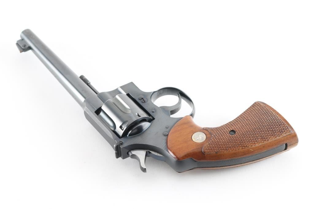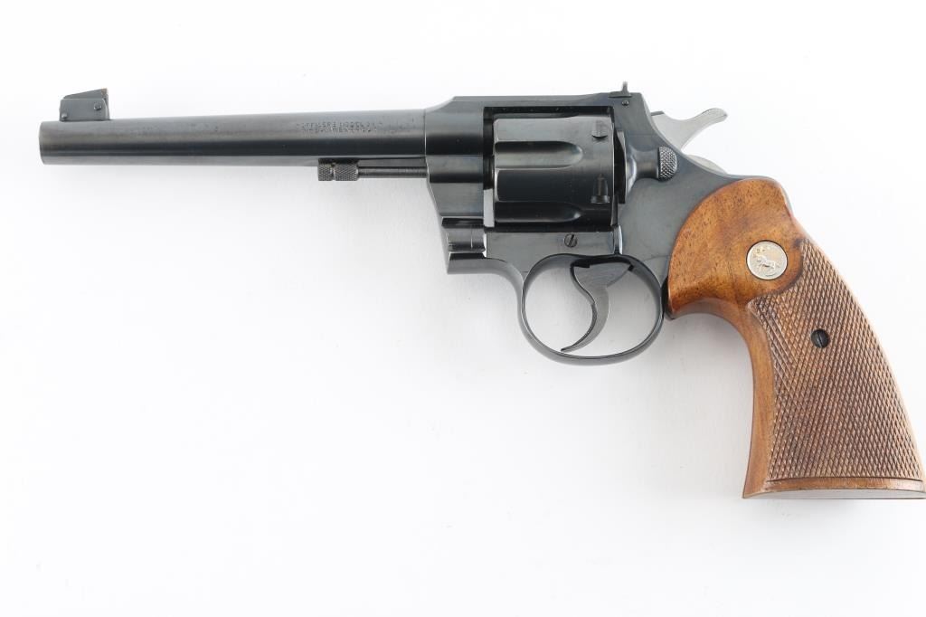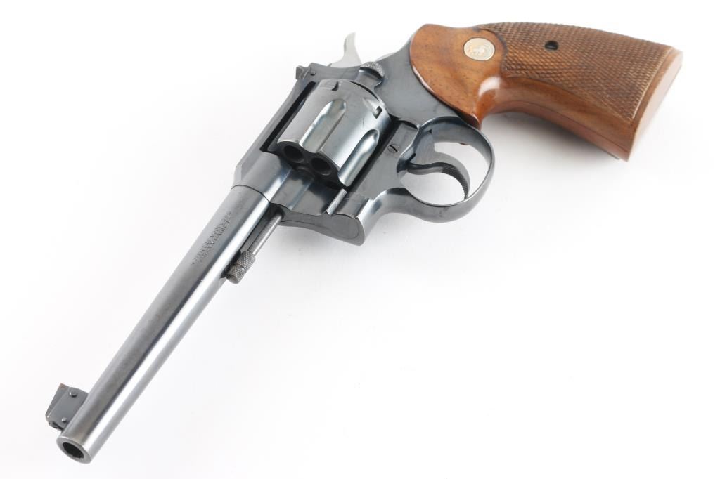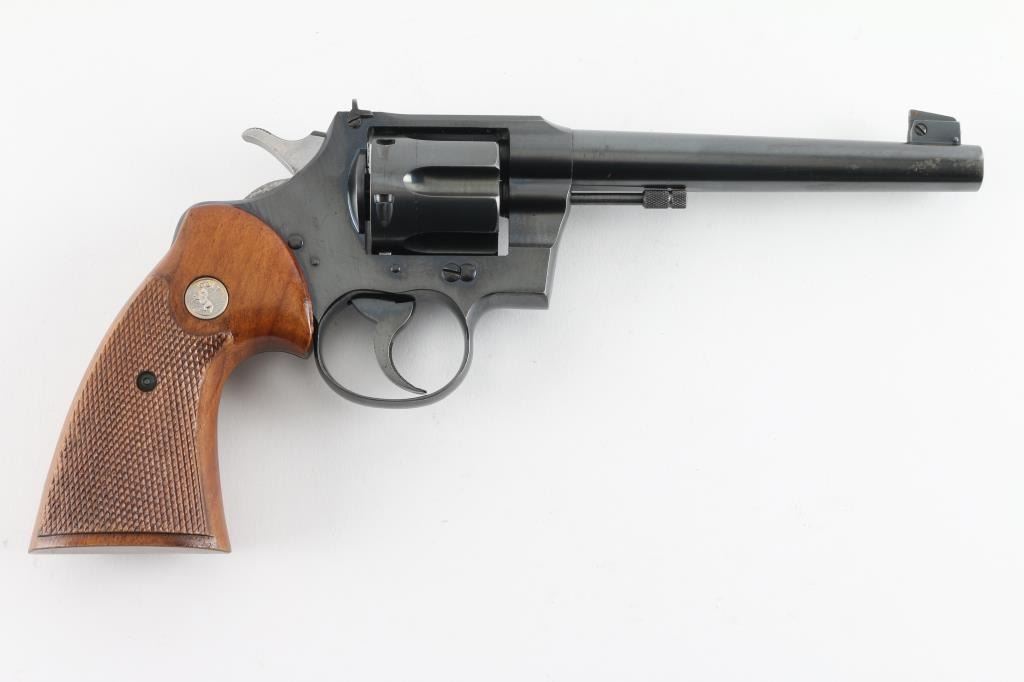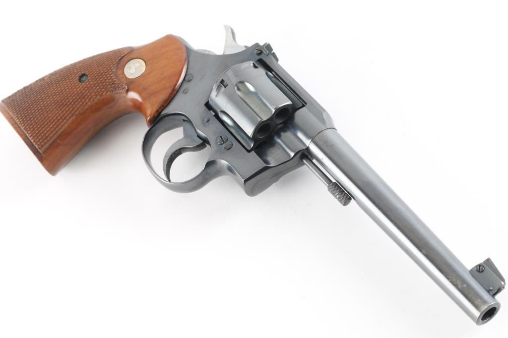 SN: 631675 American made 6 shot revolver chambered for .38 Spl , pre war revolver. Flanged screw, and stud to hold the cylinder in place. It has a blued finish with checkered wood grips sporting the sliver Colt medallions. 6" round, tapered barrel. It has a raised ramp, pinned, front sight with square notch rear sights. Knurled trigger and knurled hammer spur. Exposed extractor rod. Bore and cylinder are excellent. All Colt markings are crisp/clear. Grips are excellent. Action is crisp/tight. Blue is about 98% with slight muzzle wear, slight track lines on the cylinder, and a few very minor scratches. NRA Condition-Near Excellent. C&R Firearm.
