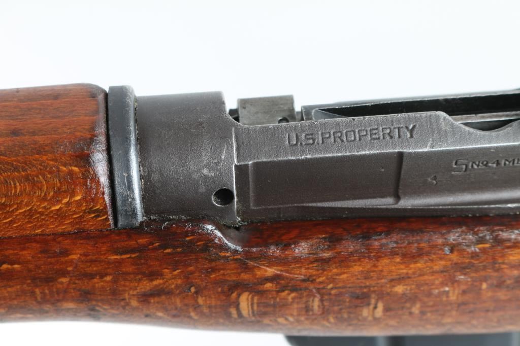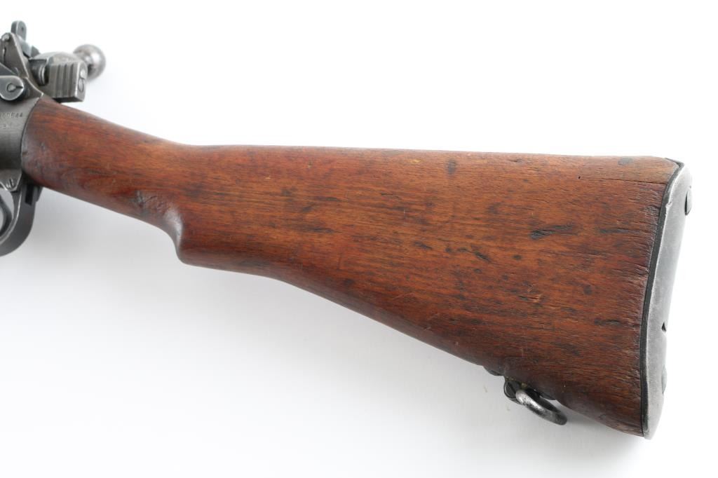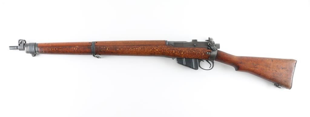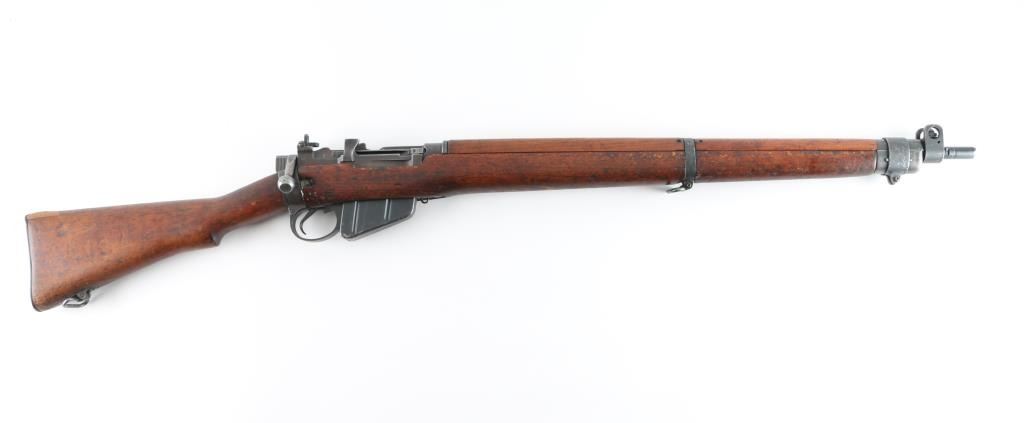 Rifle. Bolt-Action. WWII era British military magazine fed service rifle chambered in .303 British. Produced in the United States by Savage (C in serial number) as a No 4 Mk 1* (Star indicates simplified production in North America) for the war effort via the lend-lease program in 1943. 25.2" barrel with integral bayonet lugs, shrouded patridge front sight, receiver mounted flip-up aperture rear sight graduated to 1,300 yards, two barrel bands, smooth trigger, detachable 10 round magazine, manual safety on the left side of the receiver, integral charge loading guide cuts in the receiver, sling swivels, smooth full-length wood handguard & forend, and straight grip shoulder stock with steel trapdoor buttplate. The left side of the receiver is marked "U.S.PROPERTY", “ No4 Mk1* left butt socket stamped with sn, which matches on magazine, and bolt. Imported by CAI, right barrel. Rifle retains approximately 60% of its blued finish , with edge/handling wear. Action is sound, the bore appears very good, and the wood stocks are good with the usual scratches/dents. Missing stacking swivel. Matched serial numbers on socket, and bolt. NRA Condition-Good+. C&R firearm.
