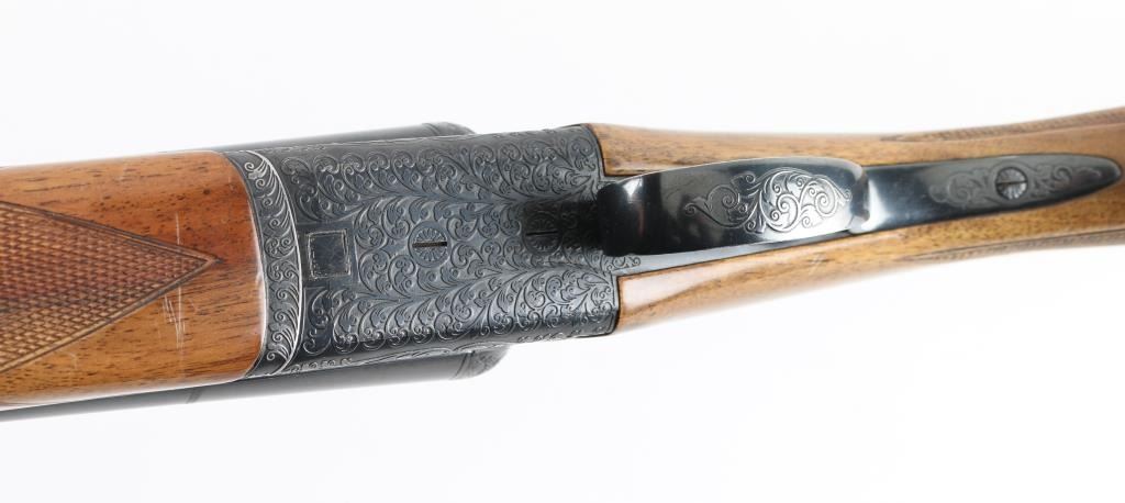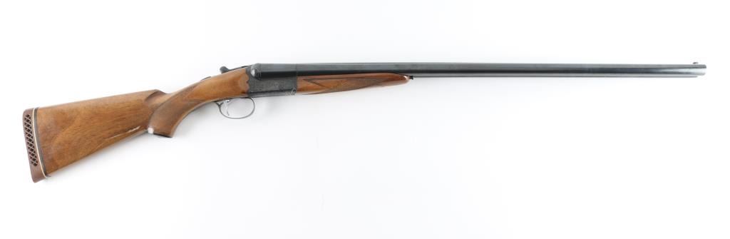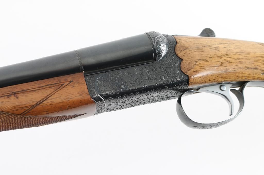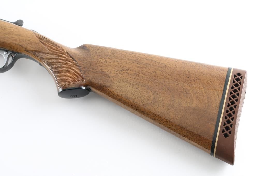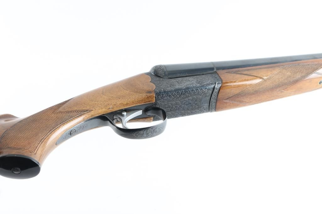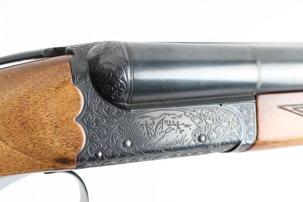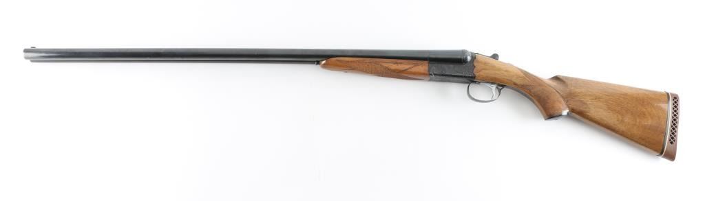 Side-by-side double barrel boxlock shotgun chambered for 2 ¾” 12 gauge shells. Manufactured in Japan by SKB circa 1980-1983 and imported by Mitsui. Features a blued finish, full/modified choked 30” barrels with matted solid sighting rib, orange Bradley bead style front sight, engraved receiver with floral scroll motif and simple bird scenes, smooth faced single inertia trigger with barrel selector, single extractor, sliding tang safety, knurled top lever, point checkered walnut beavertail forend with high gloss finish and semi-pistol grip shoulder stock with checkering at wrist, black synthetic grip cap, ventilated rubber recoil pad. Stock measurements: drop at comb 1 ½”, drop at heel 2 5/8” and length of pull 13.5". Bores are very good. Retains 90% finish with edge losses at muzzle & trigger guard, handling marks. Wood is very good with small scratches, dents to forend, long gouge to stock. Numbers on forend hanger & barrels match receiver. Condition is NRA Very Good++ *** Modern Firearm ***