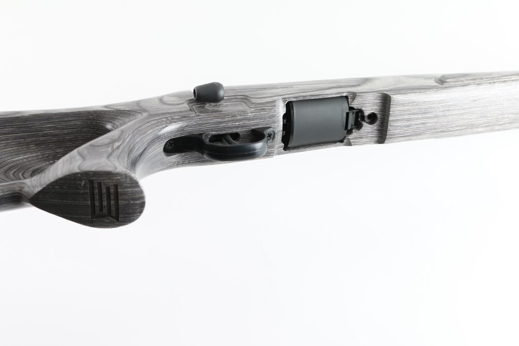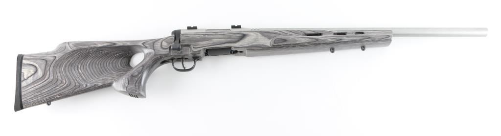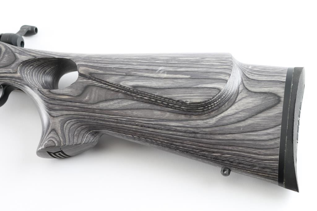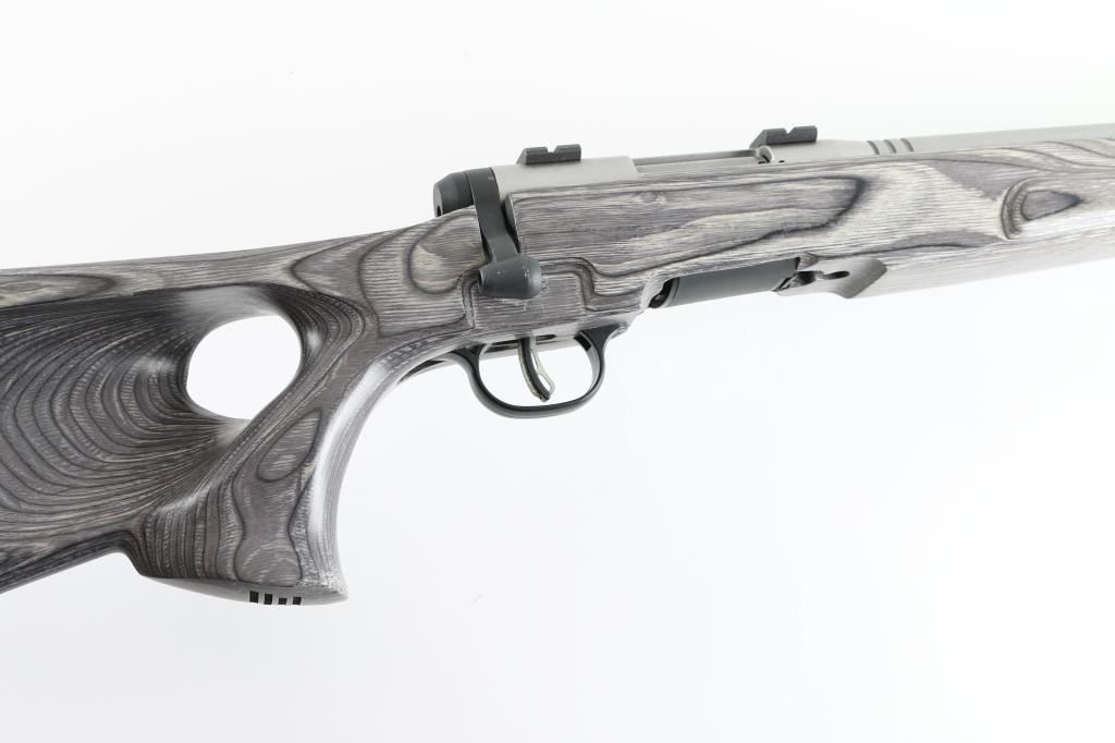 Magazine fed bolt action rimfire rifle chambered in .17 Winchester Super Magnum. Features a stainless steel finish, tapered 22" carbon steel barrel without provisions for sights, installed two-piece scope base, Accu-trigger, sliding safety on the rear of the receiver, detachable 8 round rotary magazine, and green laminate, ventilated, thumbhole stock, installed swivel studs, rubber recoil pad & 14” LOP. Rifle shows little sign of use, bore appears excellent, needs cleaning. Action is smooth/tight. Includes one magazine. NRA Condition-Near Excellent. Modern Firearm