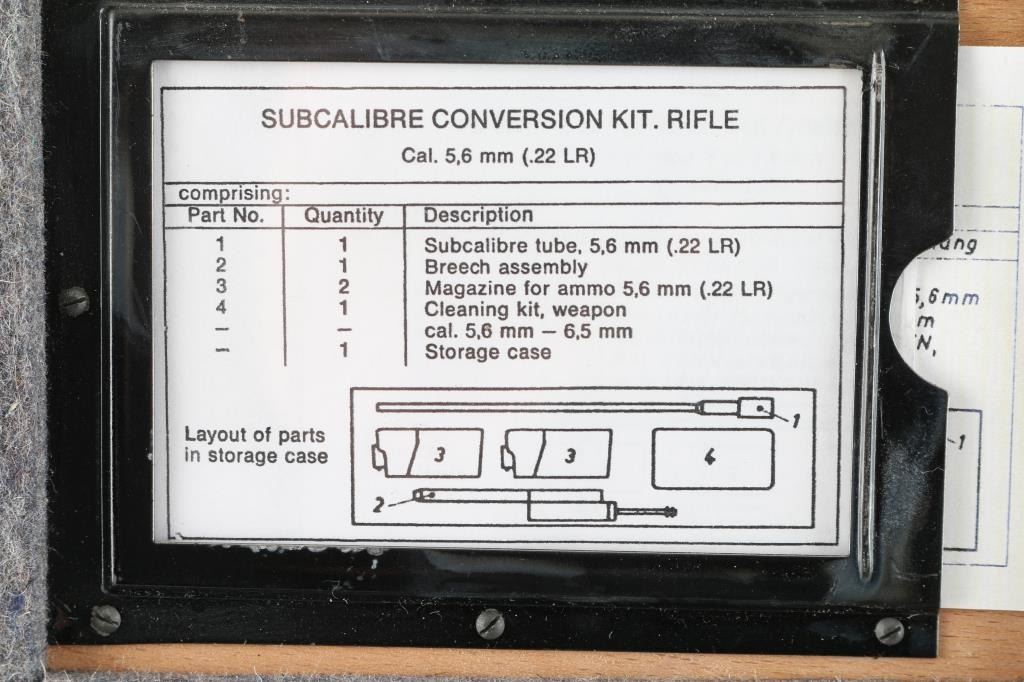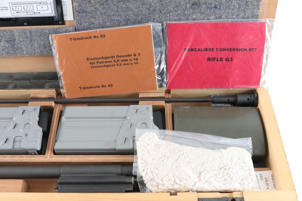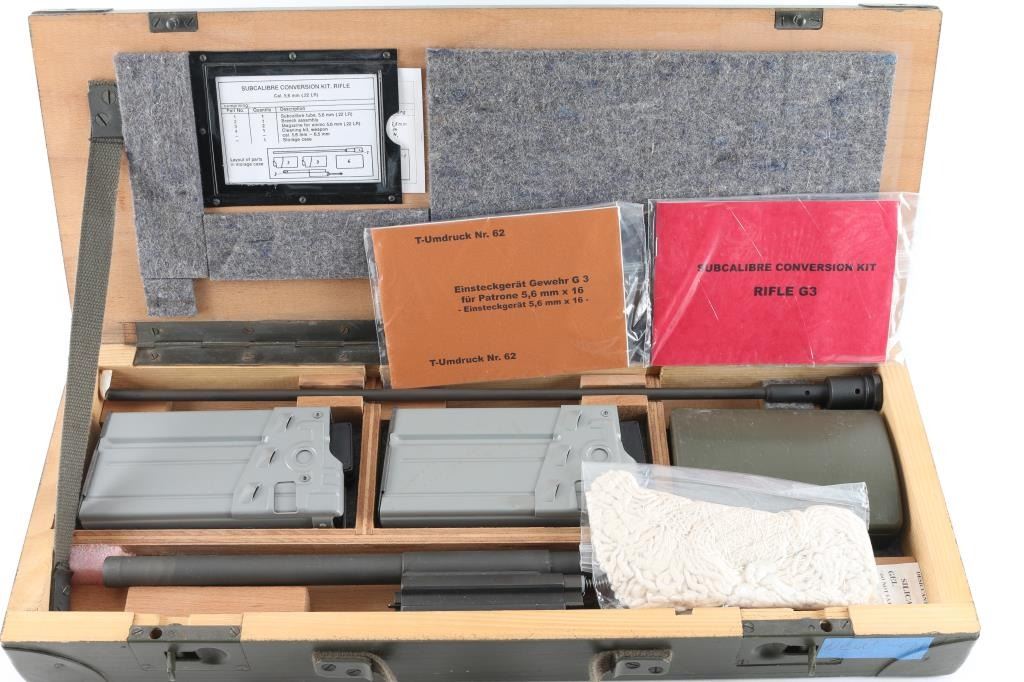 Vintage (1970's) German Military issued . 22 Cal conversion kit for the HK G3, PTR-91 HK91 rifles. Used to teach the basics of marksmanship. Comes in the original 20x10x4 wooden box and includes two 10 rd .22 magazines, conversion bolt and barrel, tube, and cleaning kit. Manuals in both English, and German are included. Reduces recoil, and an inexpensive way to shoot. Very good condition. Barrel appears straight, with no observed bands or kinks or dents. Bore is very good condition.