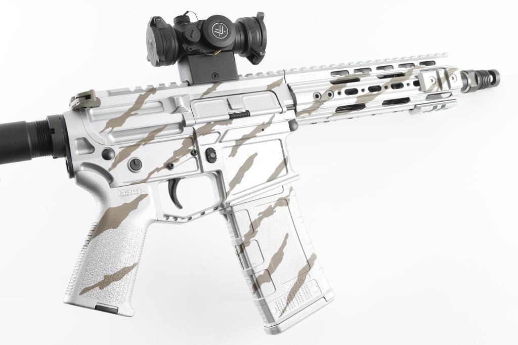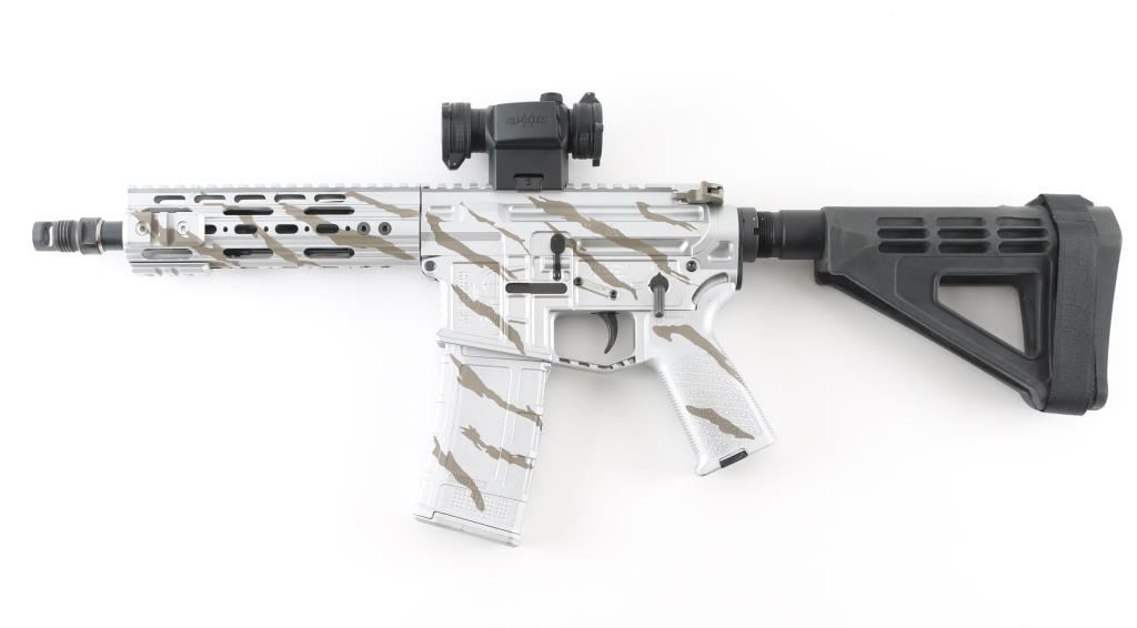 Semiautomatic pistol based on the AR15 platform, with custom machined upper & lower receivers giving a unique look. Finished in a silver color with dark earth color tiger stripes on receiver halves and handguard, with other parts matte black finished. Features approx 8.5" threaded barrel, muzzle brake with coarse external threads for mounting accessory devices, SB Tactical pistol brace, Magpul grip with battery storage compartment, M-lock rail forend with several small Picatinny rail adapter section, anti-walk trigger pins, BCM charging handle, nitride coated lightweight bolt carrier, Vortex SPARC red dot optic mounted to Picatinny rail on top of receiver. Bore is very good condition. Overall excellent condition with few blemishes to the finish. Includes a single Magpul polymer magazine (30 round BLK mag) finished to match the receiver, and a green nylon zipper case with mag pockets & carry strap. Condition is NRA Excellent *** NEXT LOT IS THE MATCHING SUPPRESSOR FOR THIS FIREARM *** *** Modern Firearm ***