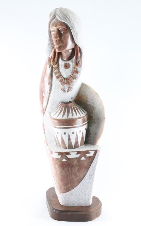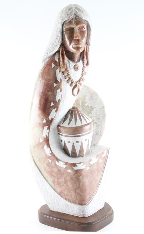 of indian woman and pottery by Mike Toledo. Measures 32"x13" Signed in piece and numbered 94 on back. Mike Toledo (20/21st centuries) is active/lives in New Mexico. Mike Toledo is known for Sculpture (Native American figure, themes).