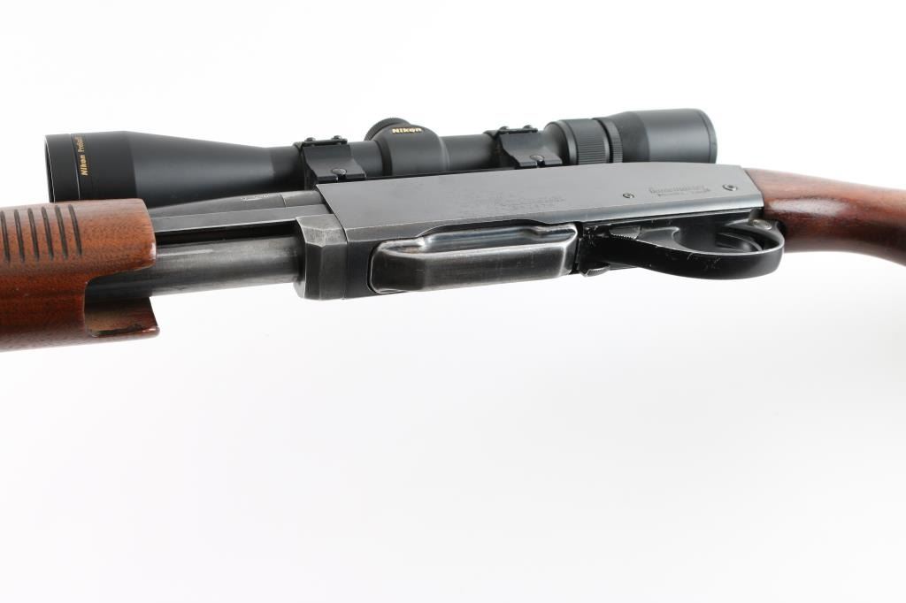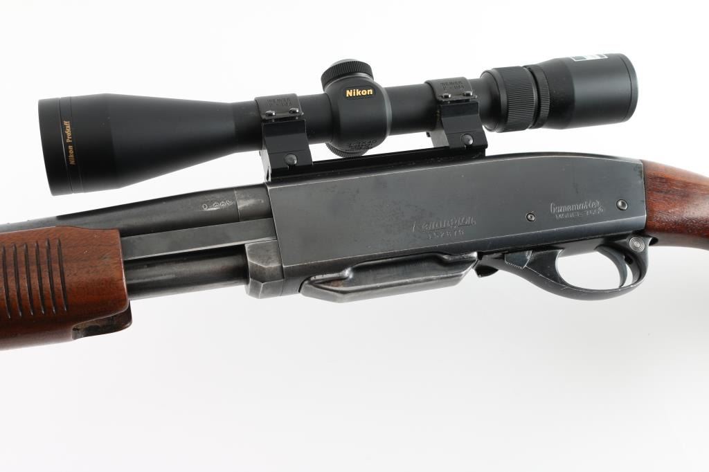 'Gamemaster' Pump action rifle features blued finish, grooved wood pump handle, smooth wood stock with curved grip, Pachmayr recoil pad, 22.5" barrel, blade front sight, rear sight removed, Weaver rings attached to receiver top, detachable box magazine, manual safety. Bore is very good condition. Retains 80% blue, with scratches, edge losses, friction wear. Magazine has some handling wear. Wood is very good condition with scratches, some finish losses. Mounts a very good condition Nikon Prostaff 3-9X40 scope with fine crosshair, good view. Condition is NRA Good++ *** Modern Firearm ***
