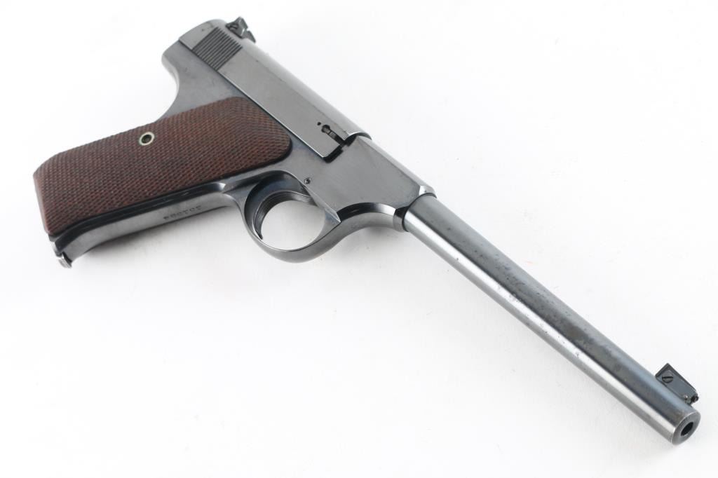 Semiautomatic rimfire pistol manufactured circa 1941. Features blued finish, checkered walnut grips, 6.5" barrel, blade front sight, rear sight in dovetail with screw adjustments, heel magazine release, manual safety. Bore is excellent/bright condition. Retains 97% blue, with a small area of very light spots of rust on the left barrel . Grips are very good condition. Includes Colt 10 rd (1) magazine. A really nice pistol that is 82 years old. Condition is NRA Very Good++ C&R Firearm