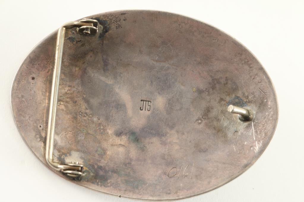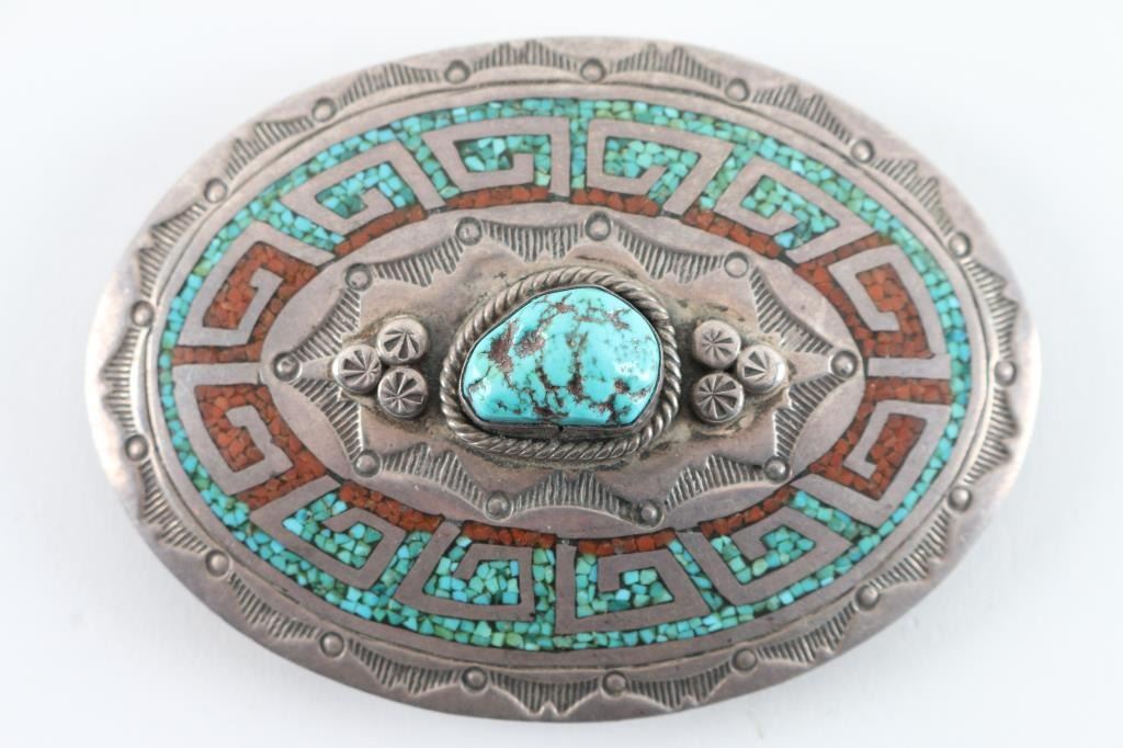 With turquoise and coral inlaid, maker marked on back , set in sterling sliver, measures 4"x2.5" Joan Singer is the the wife of the famous silversmith Tommy Singer, and took over after his passing.