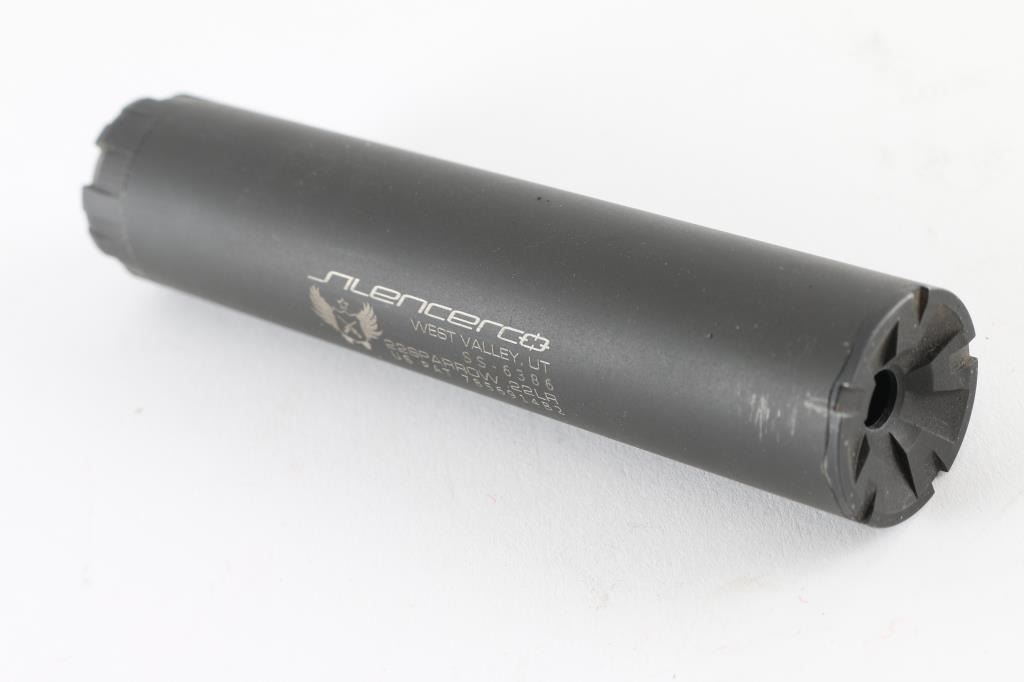 SN: SS-6386 Quality user serviceable direct thread .22 caliber suppressor with 1/2x28 pitch. Compatible with .22 LR, .17 WSM, .17 HMR, .22 Mag, .22 WMR, .22 Hornet, and 5.7x28mm. Features stainless steel construction with a matte black finish and 5.08" overall length. Includes the original factory box and a tan nylon carrying case. Suppressor shows little use. Condition is excellent in box ***NFA Item***