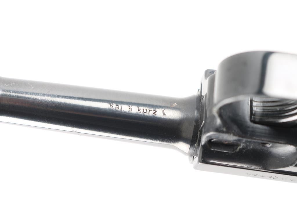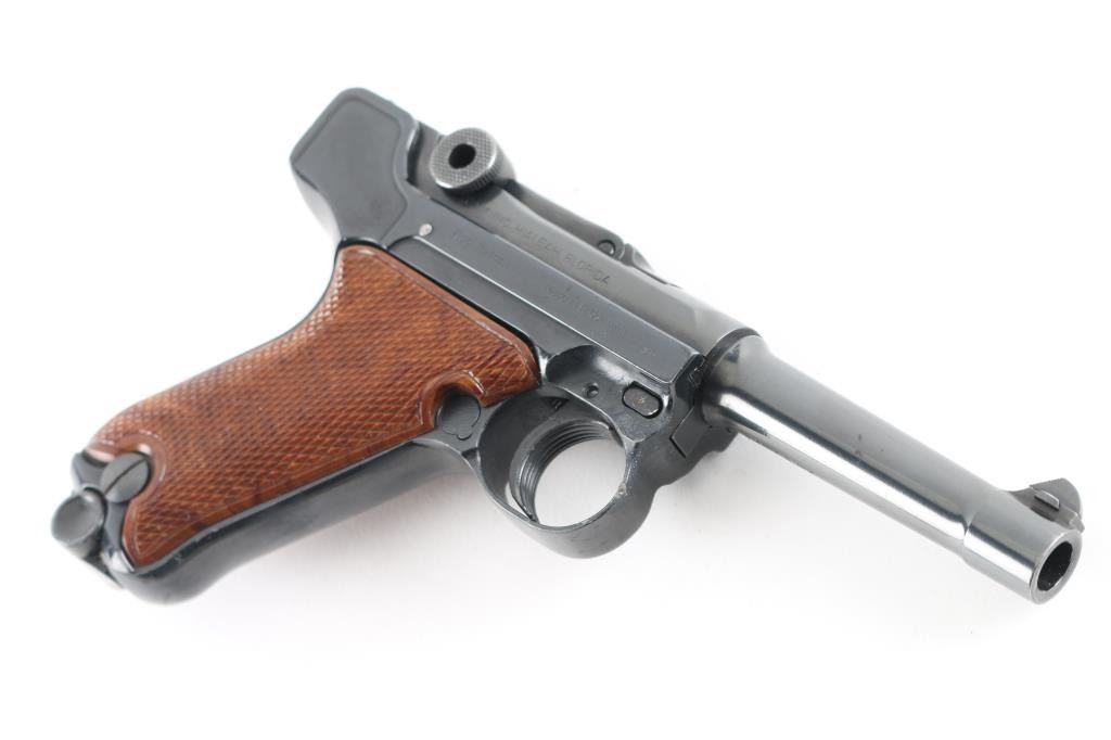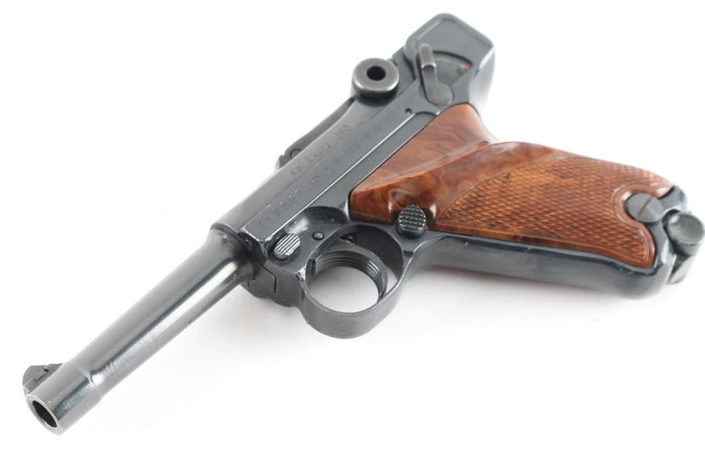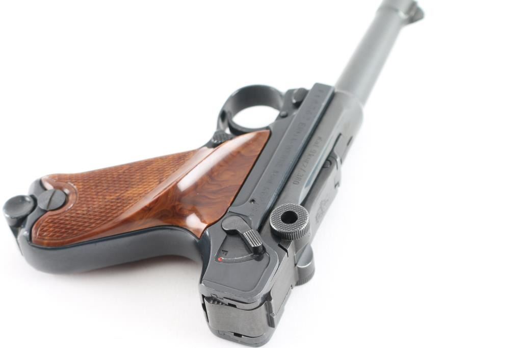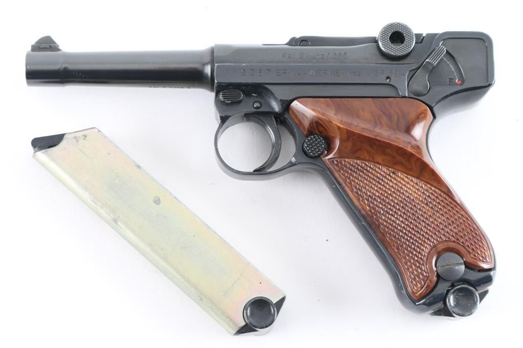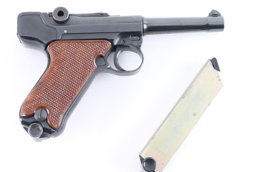 Made in West Germany, imported by AM Inc. Haleah FL. Semiautomatic pistol patterned after the look and function of the original Luger Pistole Parabellum. 5 rd magazine. Features a blued finish, wood plastic checkered thumb rest grips, manual safety, fixed sights, 3.5" barrel. Bore is excellent condition. Toggle action is crisp/tight. Blue finish is about 98% with some minor scratches. Grips are excellent. Comes with extra magazine, and original manual. Condition is NRA Excellent. Modern Firearm